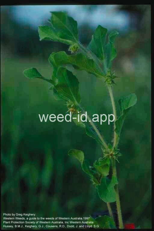 The body of the fruit (seed) covered with spines as well as having two longer hooked spines at the apex. The leaves are opposite and the small flower heads arise singly from the leaf or branch axils. Each head has 5-10 fertile ray flowers and several sterile ray flowers.