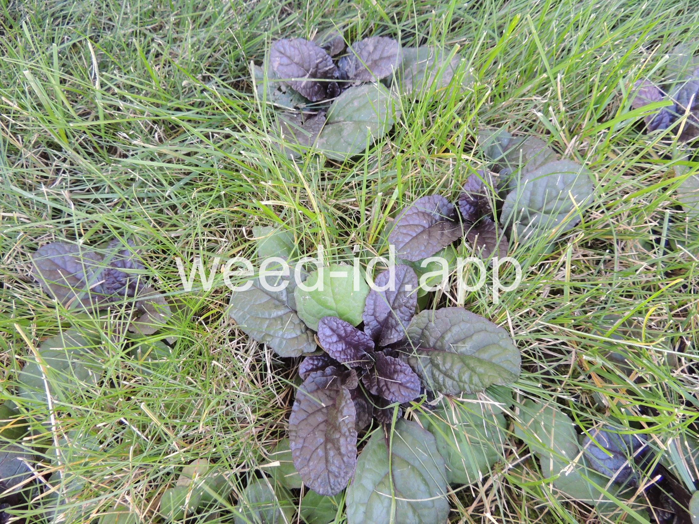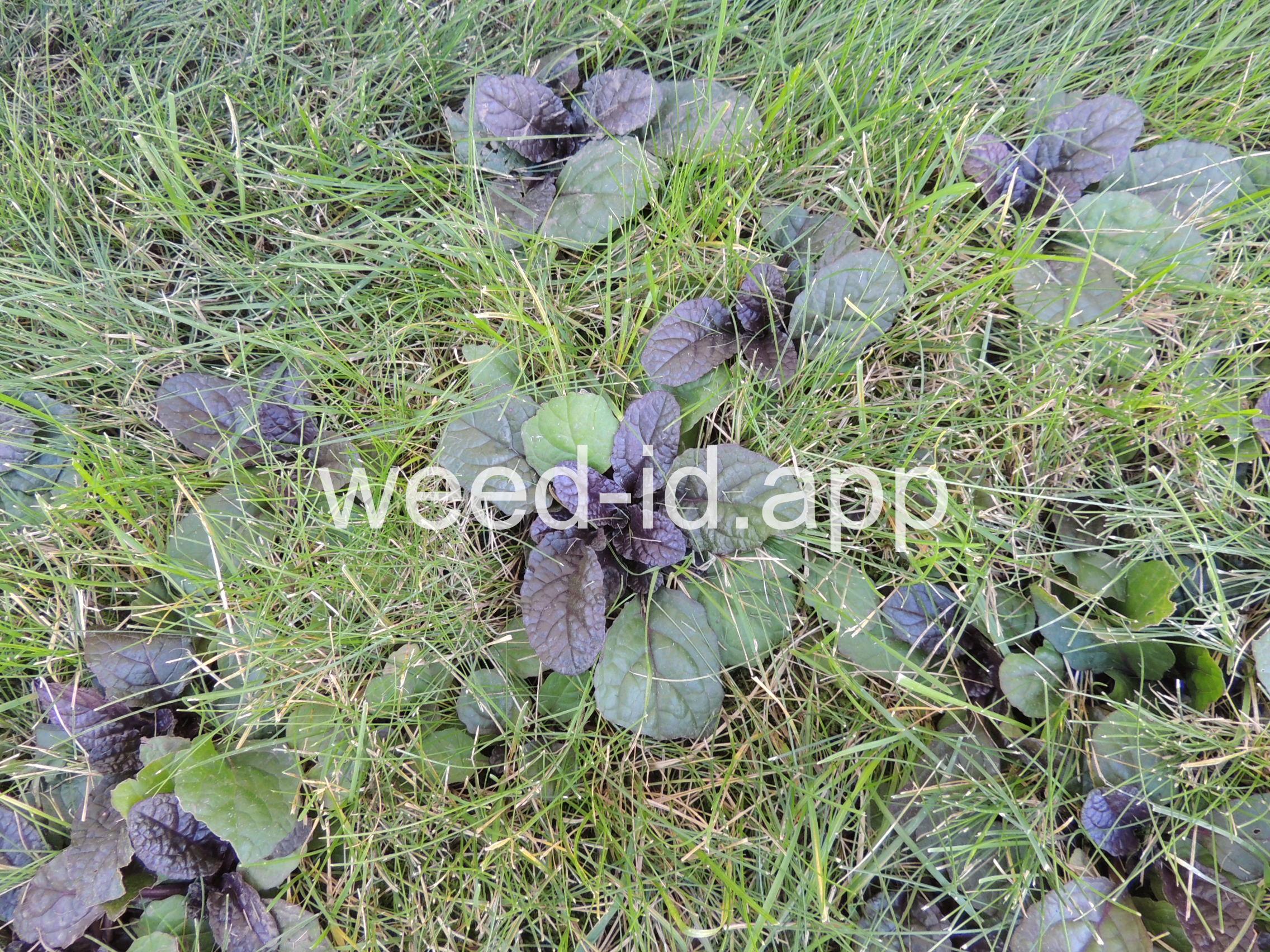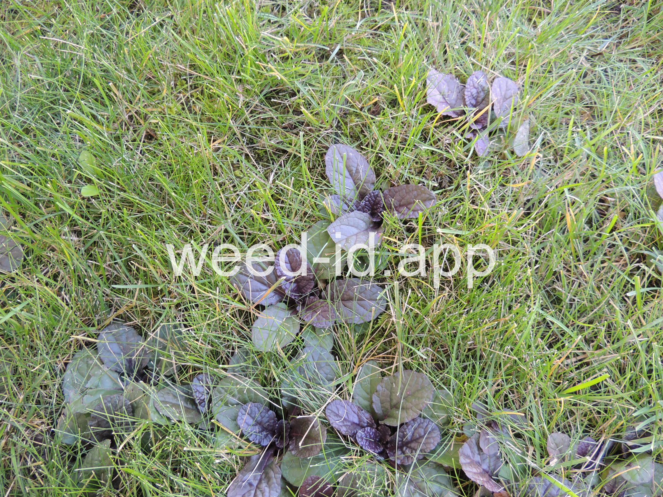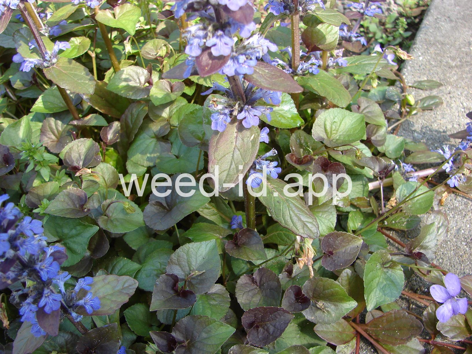 A creeping ornamental, often escaping. Very weedy in lawns. Leaves often deep purple in color. The flowers are 2-lipped and blue to blue-purple. Although a member of the mint family, the leaves are scarcely aromatic.