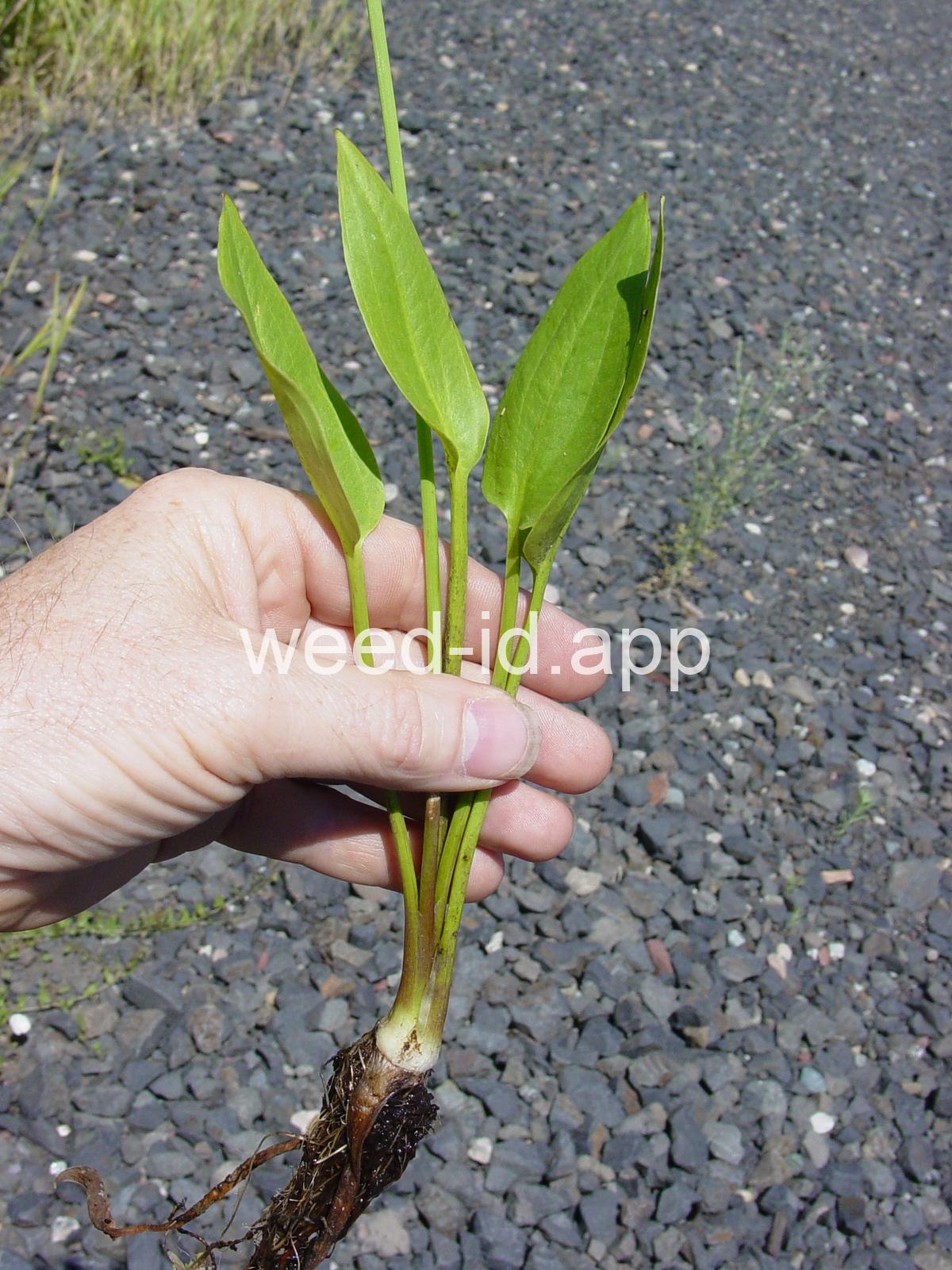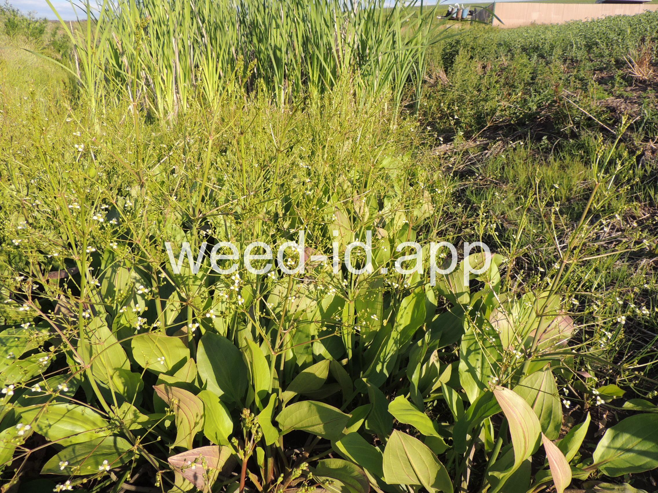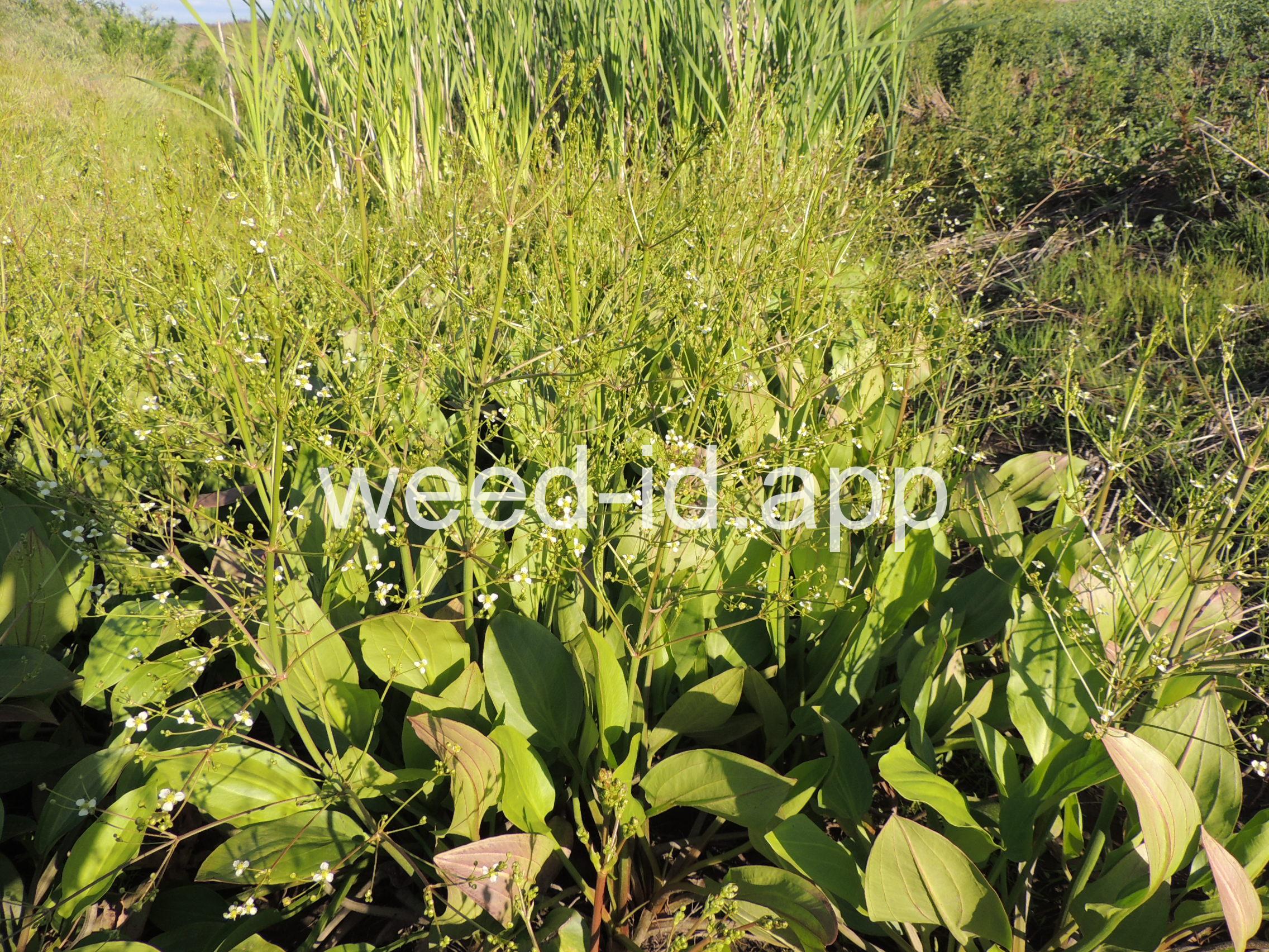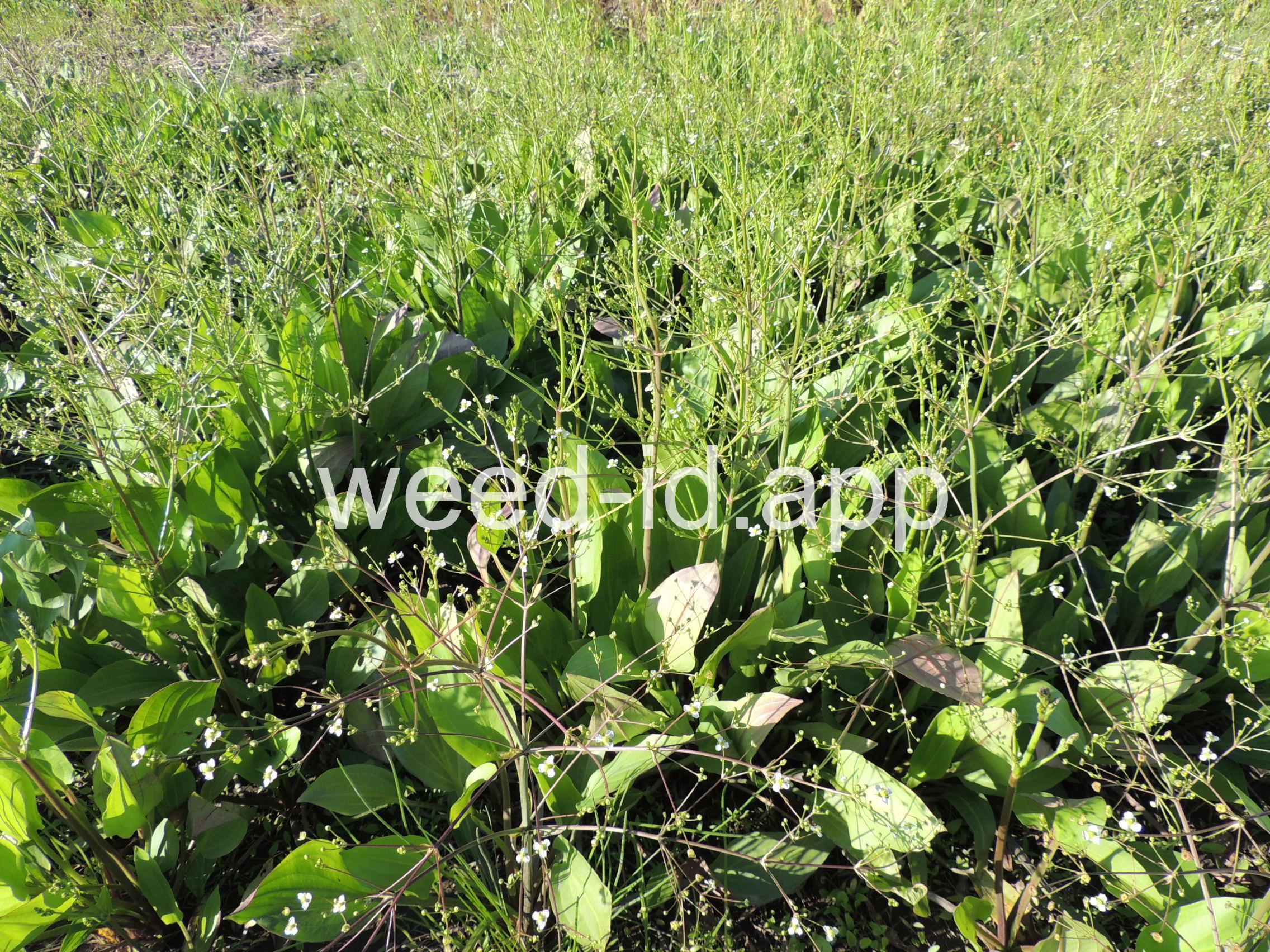 A common, native, aquatic plant. The flowers are very similar to those of the arrowheads (3 white petals) but arranged in a broad panicle and the leaves do not have prominent basal lobes.