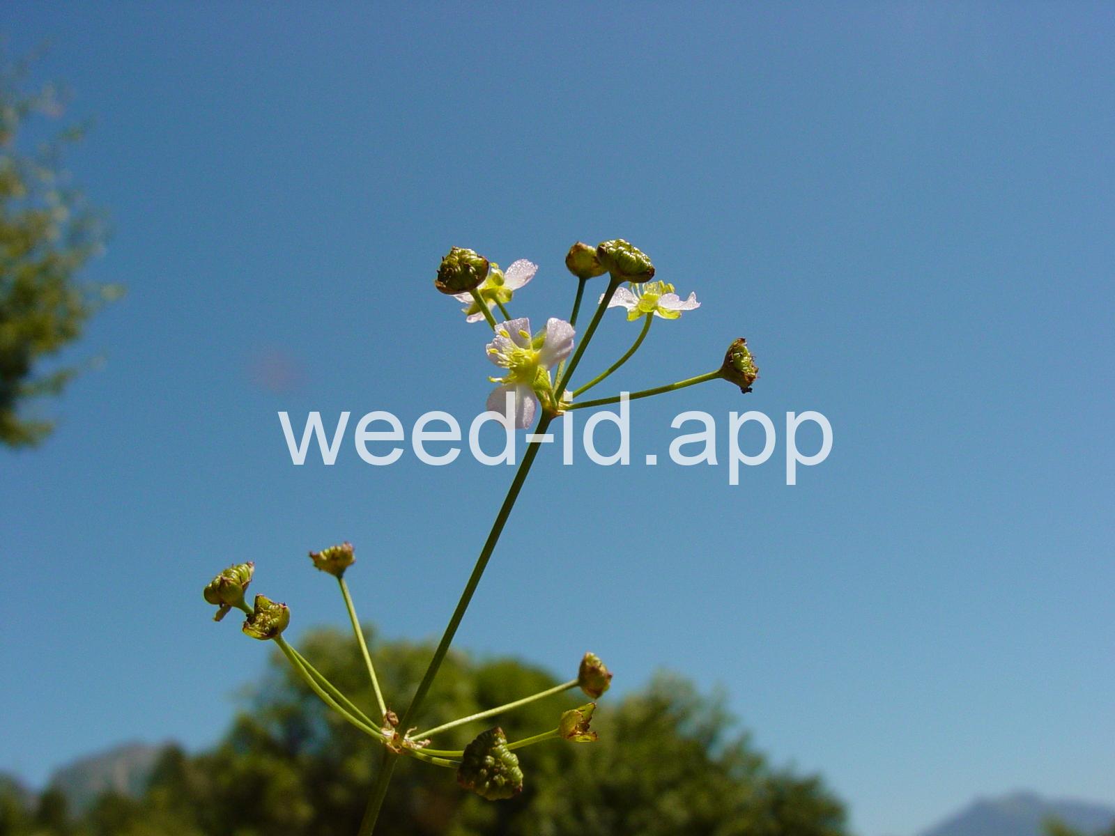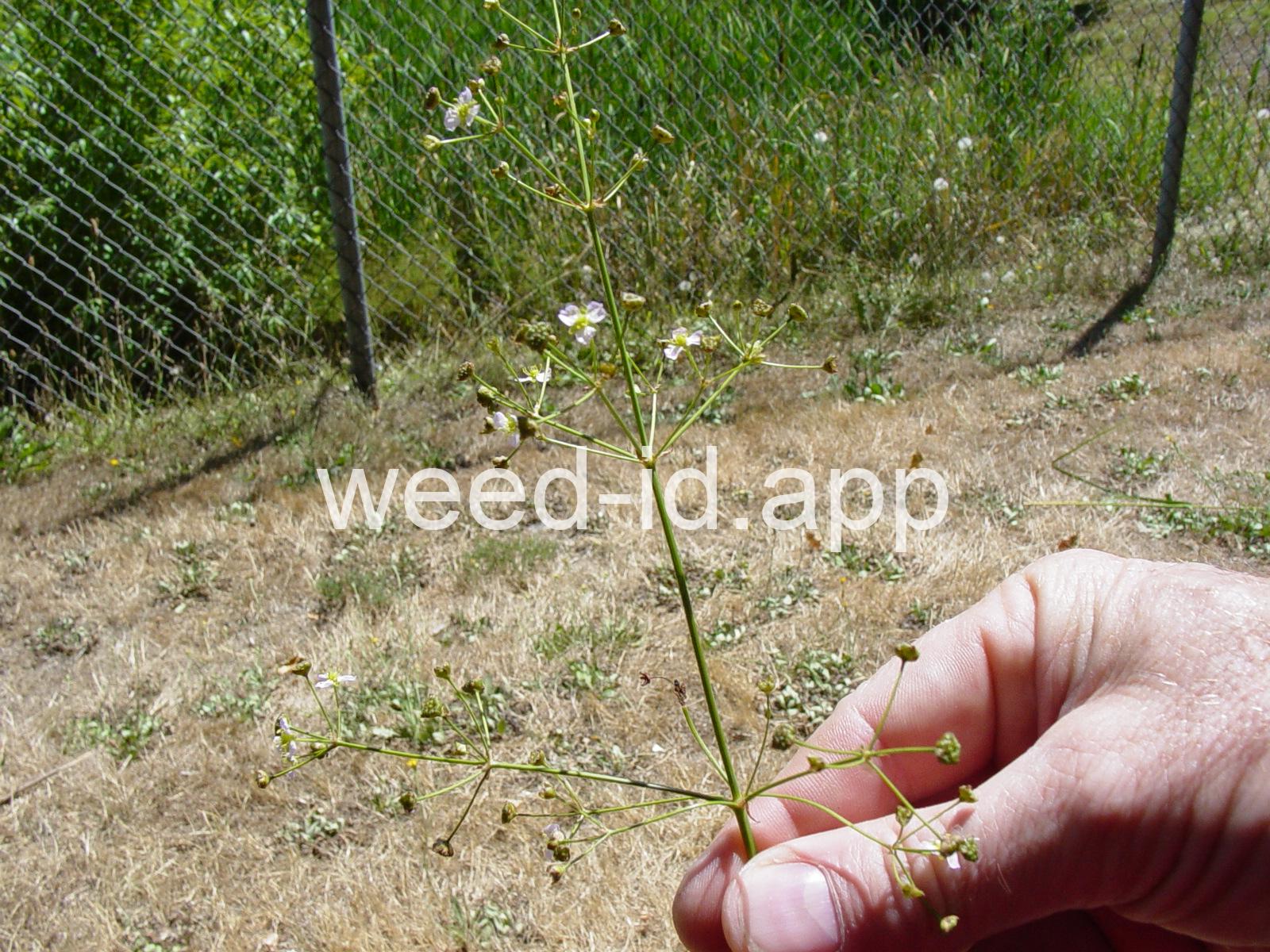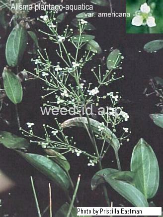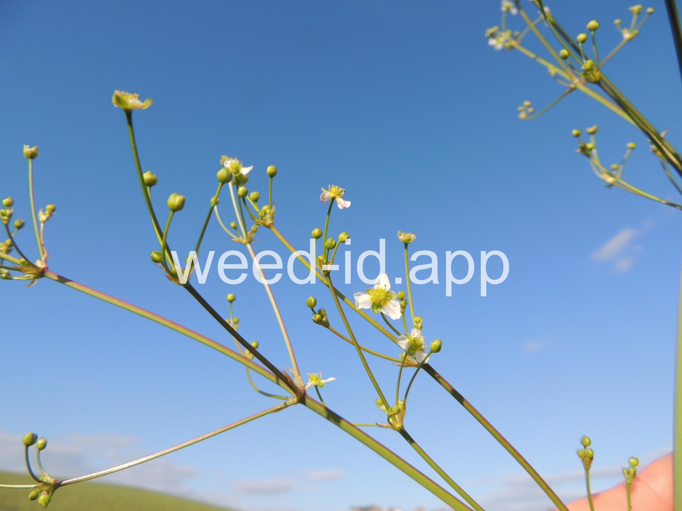 A common, native, aquatic plant. The flowers are very similar to those of the arrowheads (3 white petals) but arranged in a broad panicle and the leaves do not have prominent basal lobes.