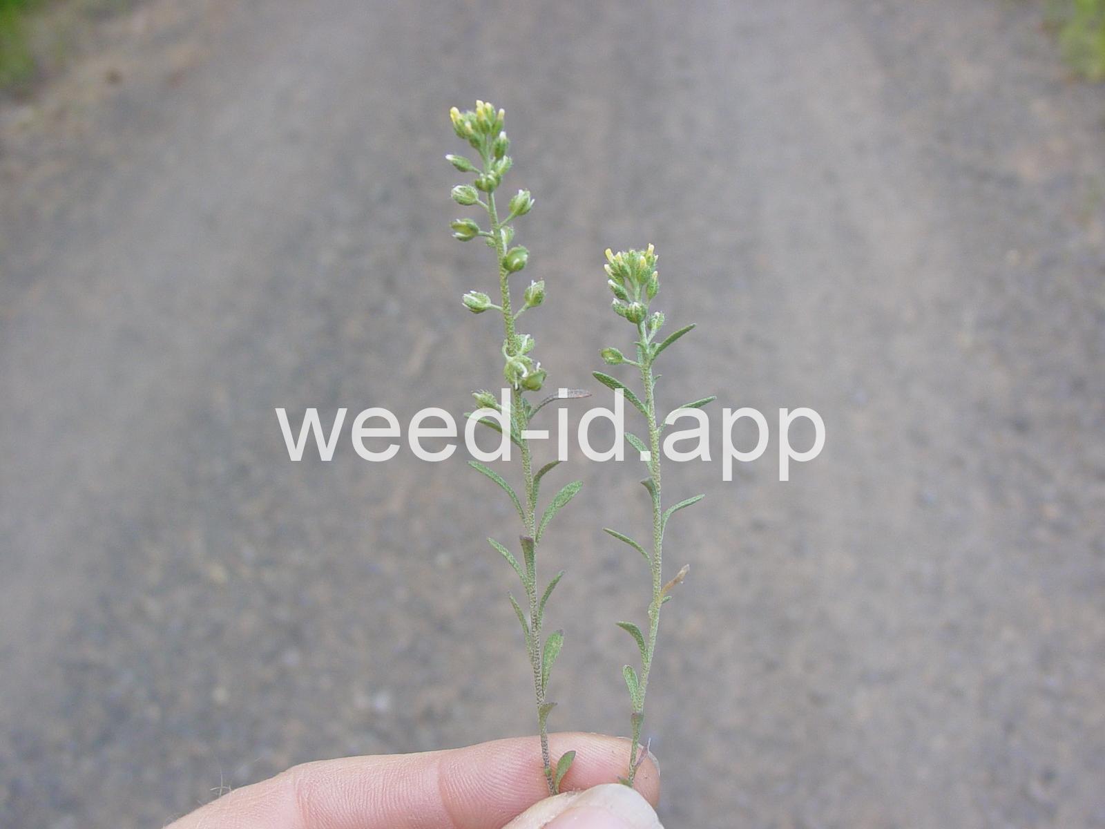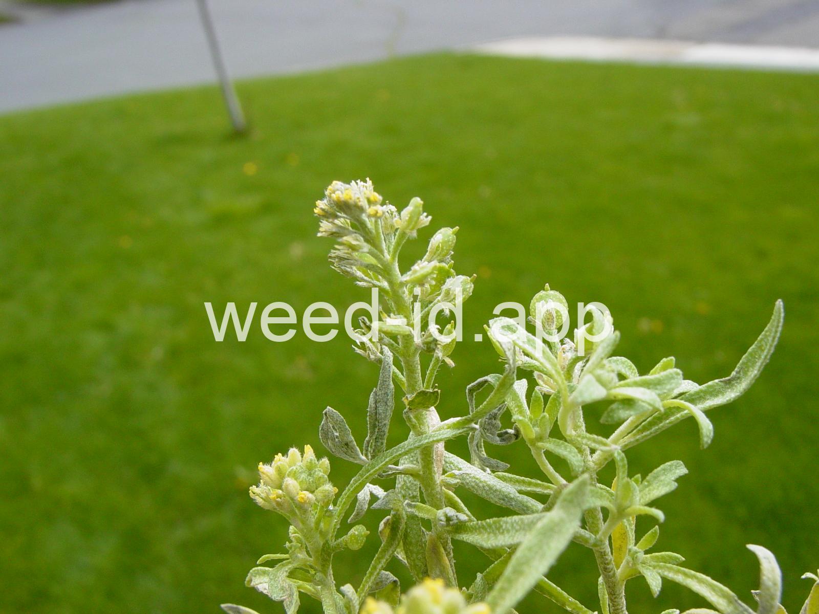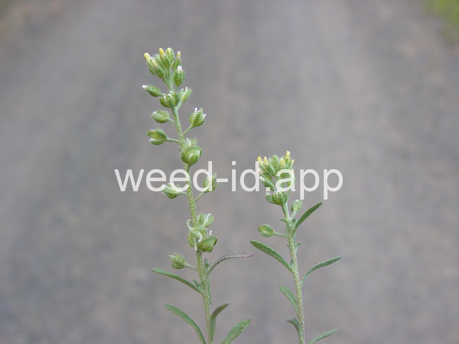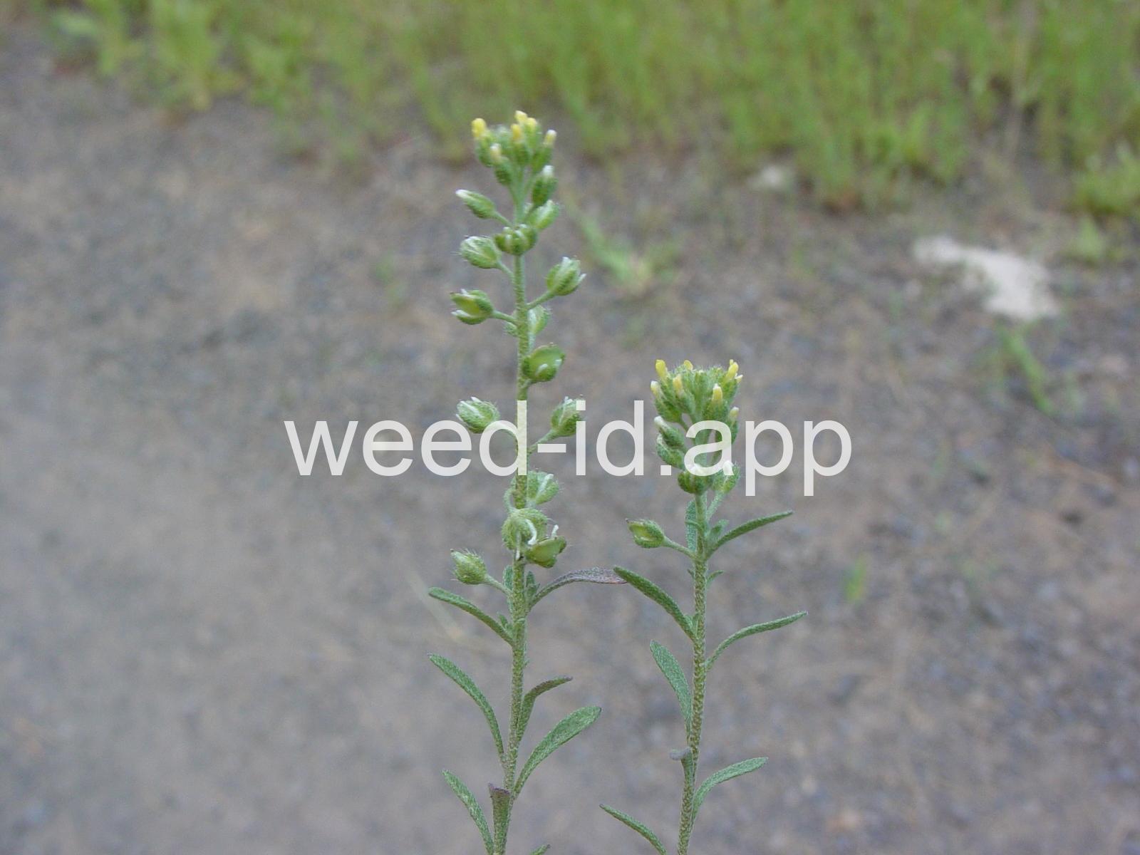 A diminutive annual of arid range and wasteland. The petals small, light yellow fading to white. The fruit is a small erect or spreading disk with a narrow wing-like margin. It is very similar to dwarf alyssum (Alyssum desertorum) but differs in the following characteristics: Alyssum desertorum: Fruit hairless, sepals deciduous at maturity. Alyssum alyssoides: Fruit covered with closely appressed star shaped hairs, sepals present at maturity.