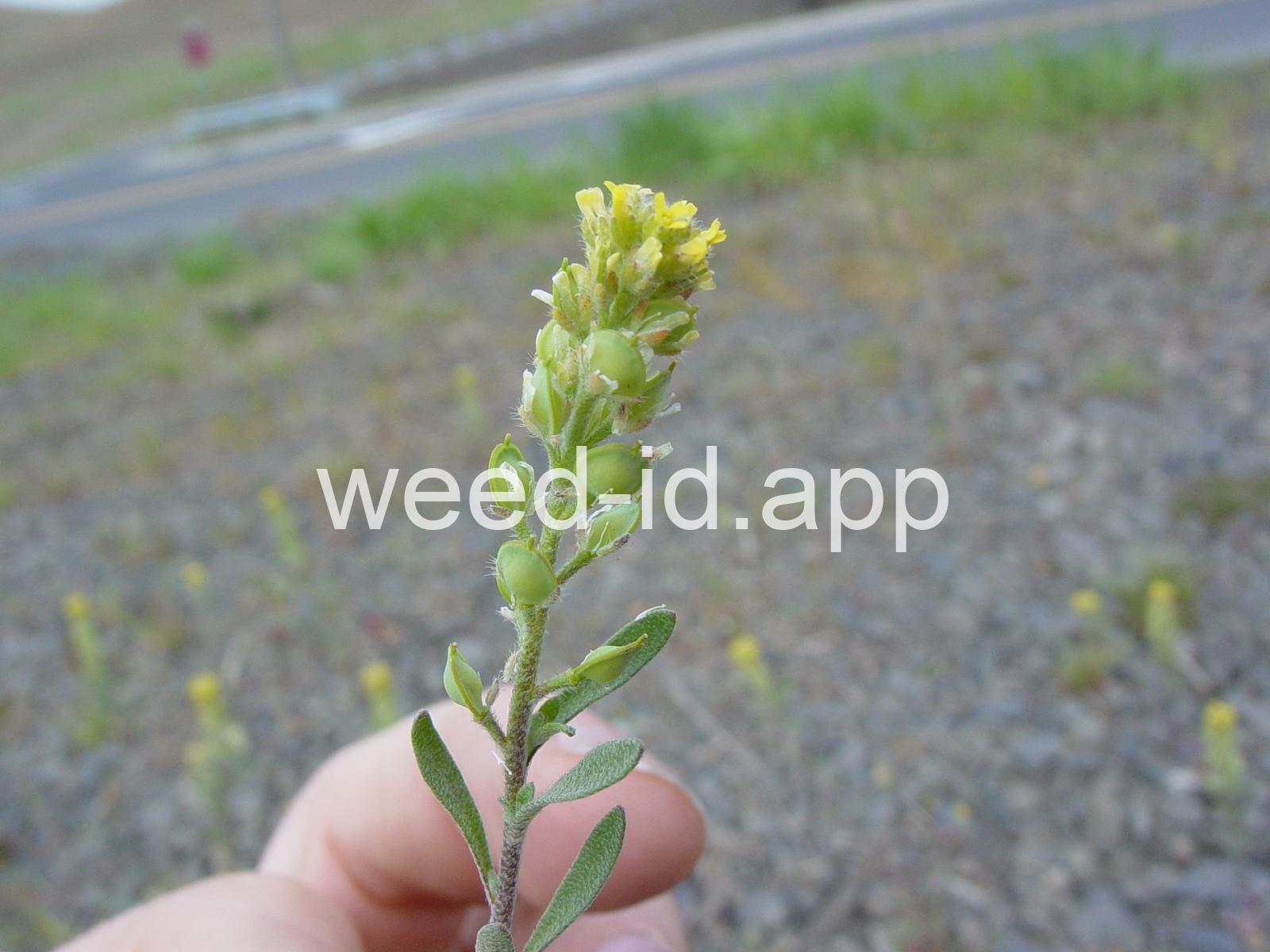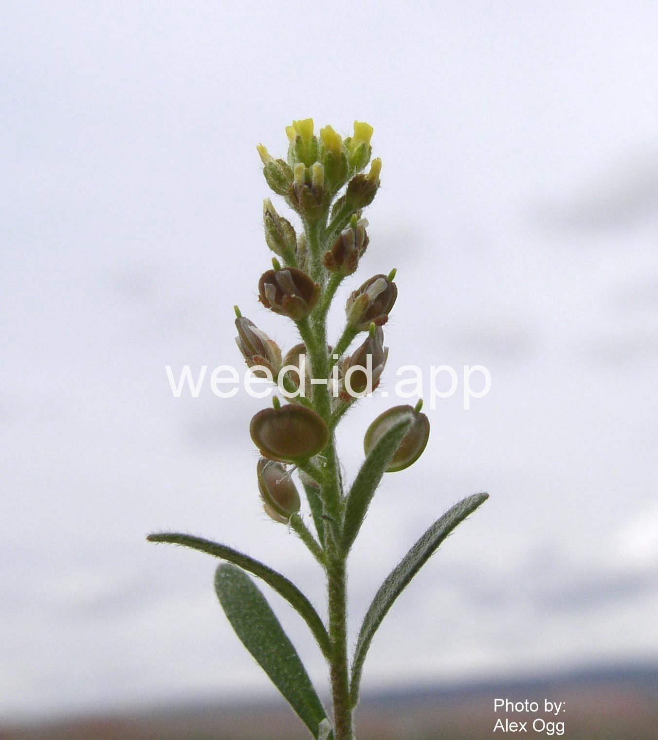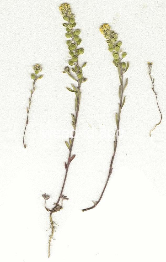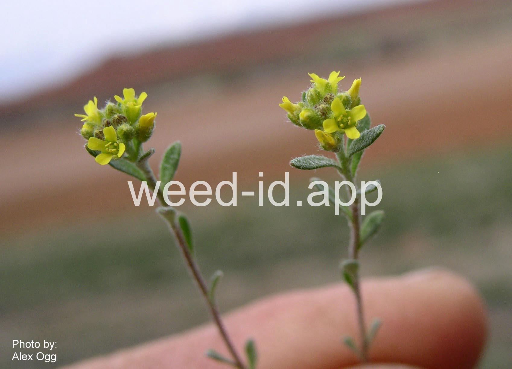 A small, annual weed of dry range and wasteland. The petals small, light yellow fading to white. The fruit is a small erect or spreading disk with a small winged margin. This species is very similar to yellow alyssum (Alyssum alyssoides) but differs in the following characteristics: Alyssum desertorum: Fruits hairless, sepals deciduous at maturity Alyssum alyssoides: Fruits covered with star shaped hairs, sepals present at maturity.