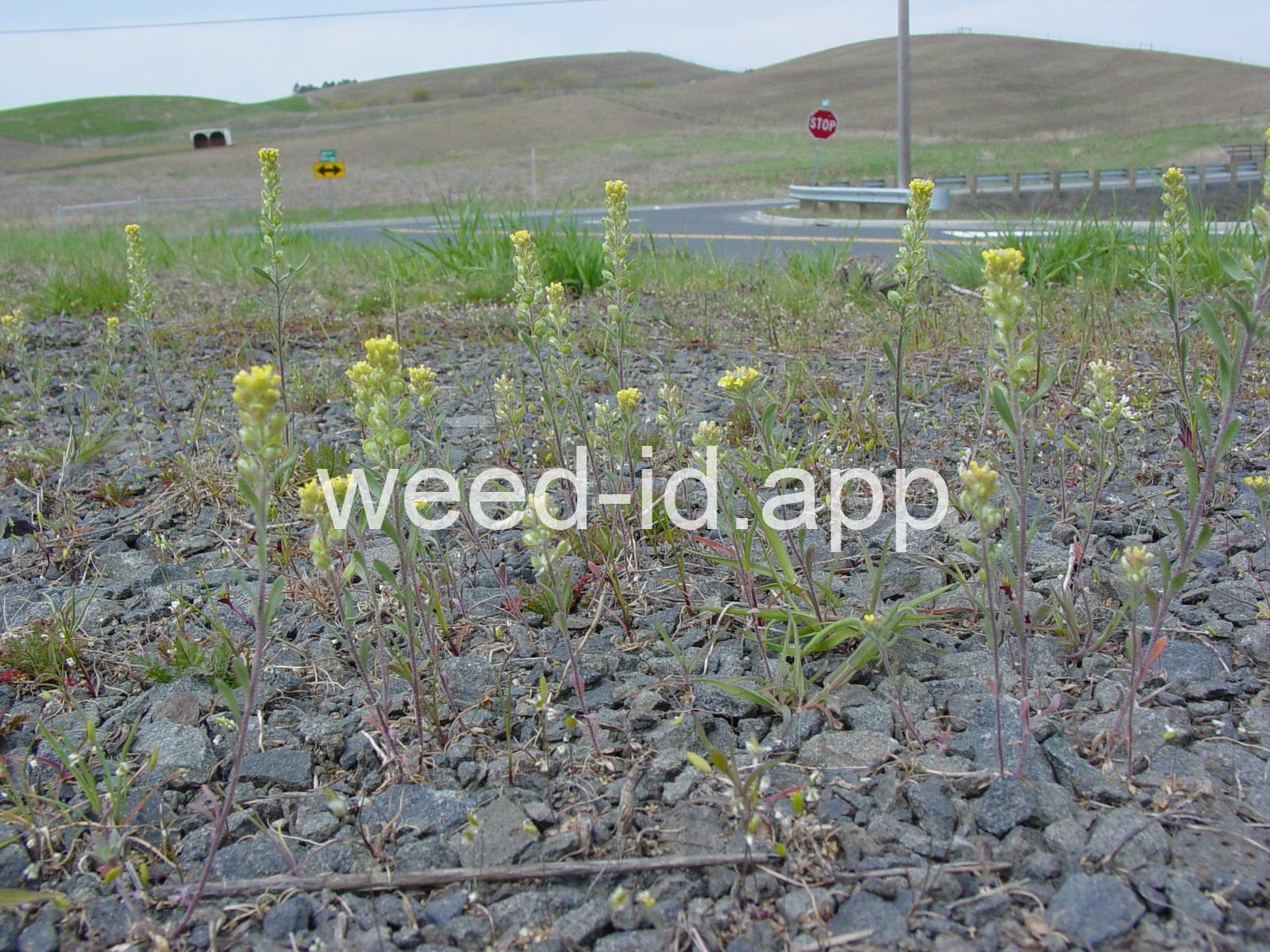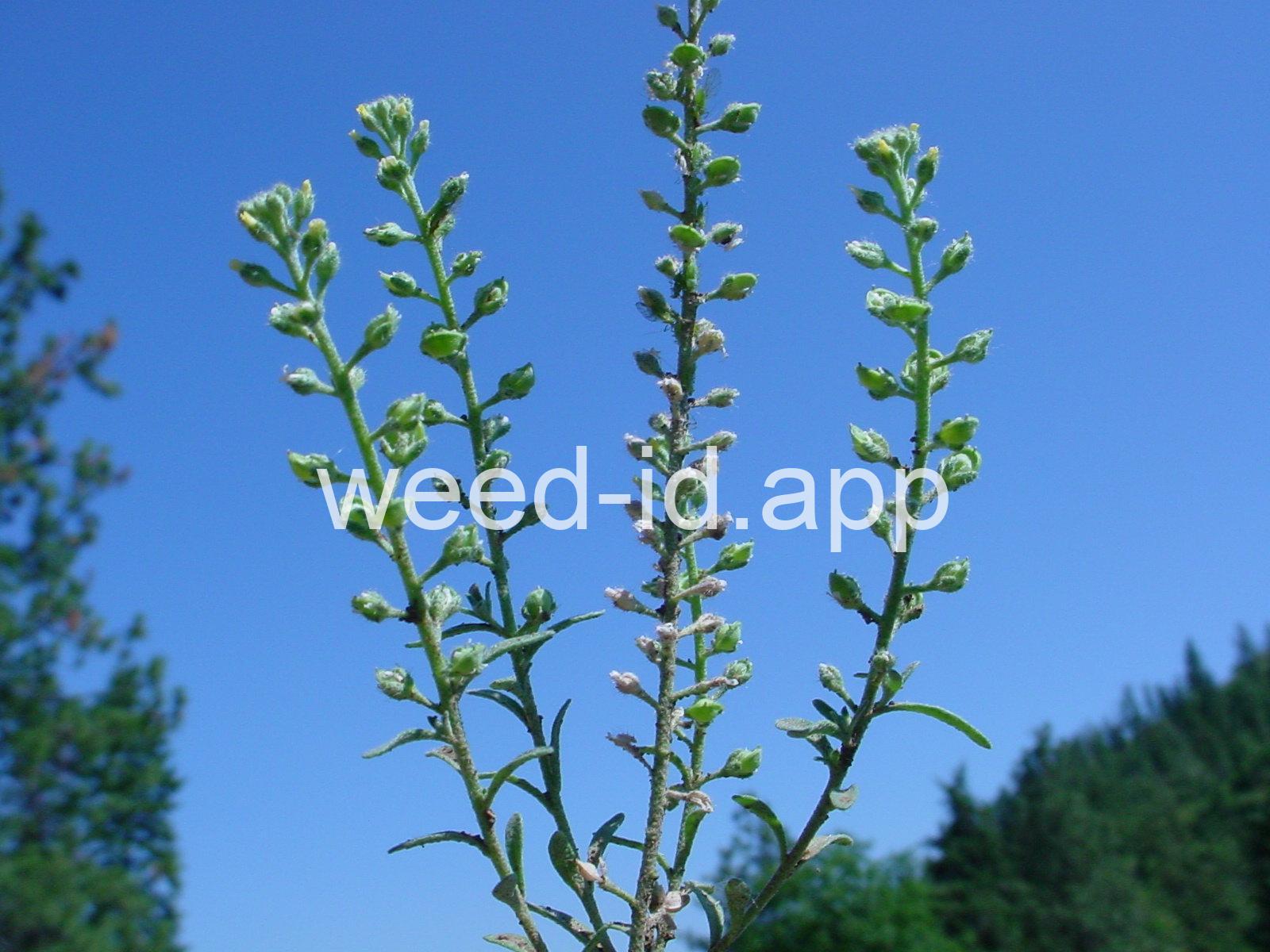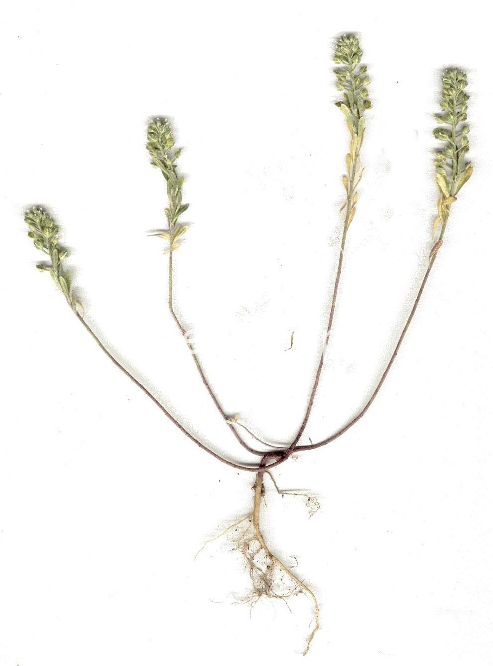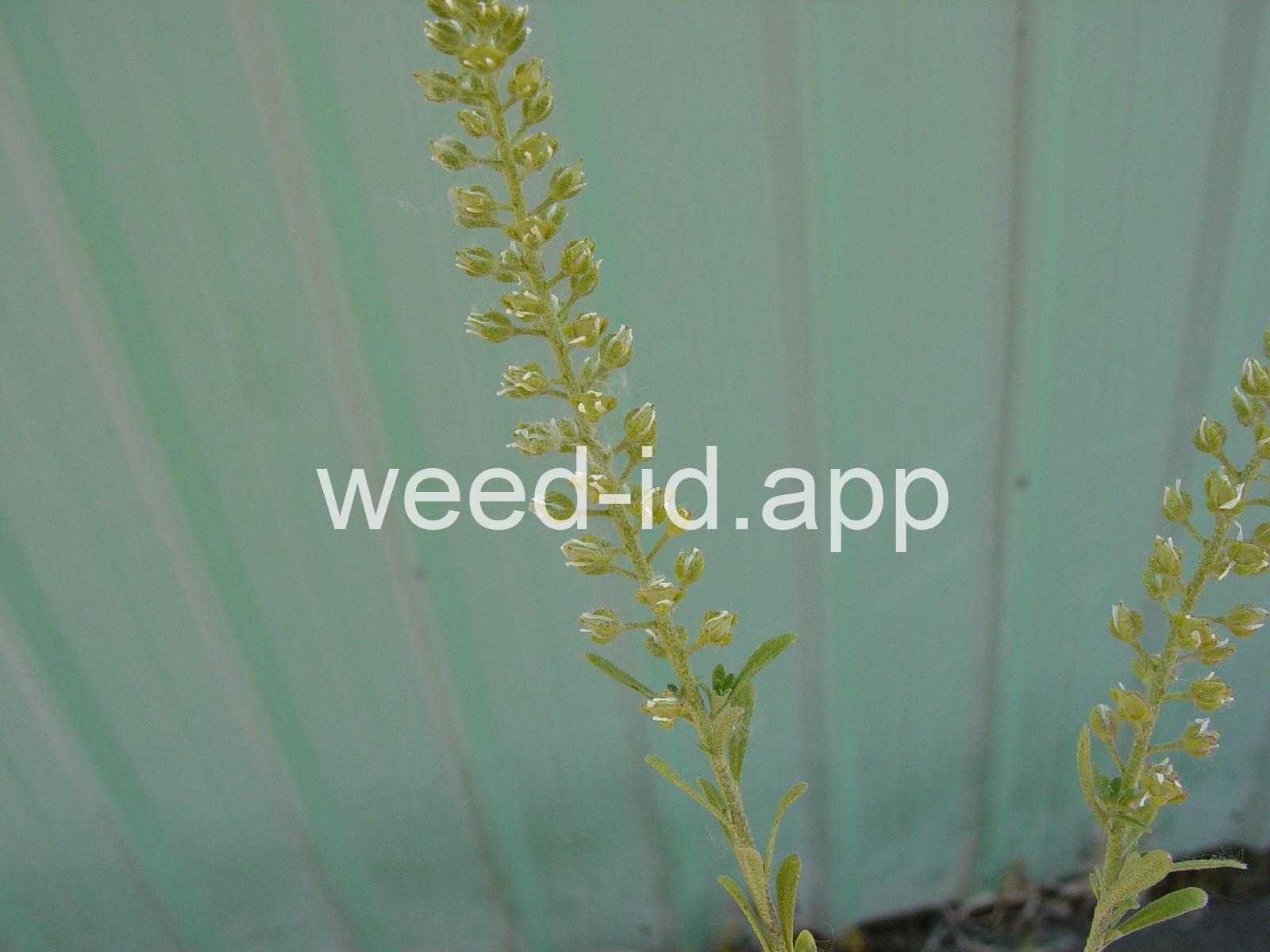 A small, annual weed of dry range and wasteland. The petals small, light yellow fading to white. The fruit is a small erect or spreading disk with a small winged margin. This species is very similar to yellow alyssum (Alyssum alyssoides) but differs in the following characteristics: Alyssum desertorum: Fruits hairless, sepals deciduous at maturity Alyssum alyssoides: Fruits covered with star shaped hairs, sepals present at maturity.