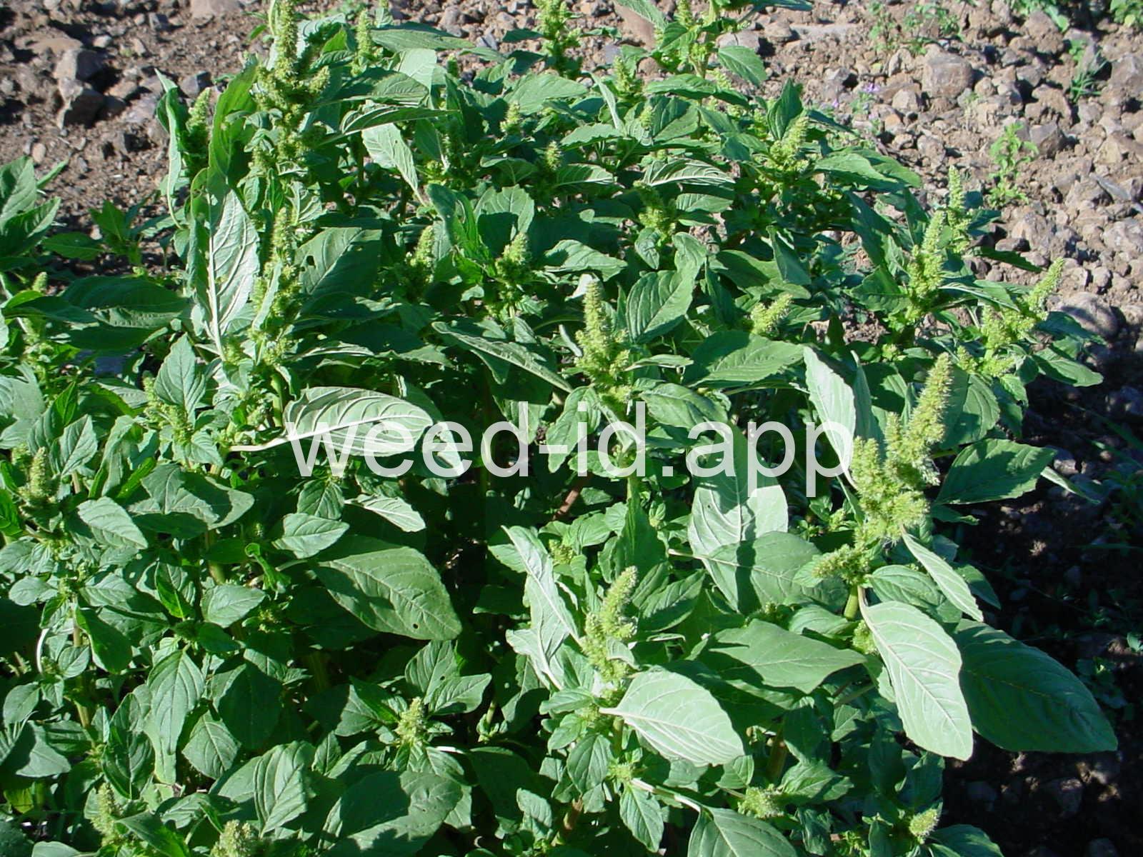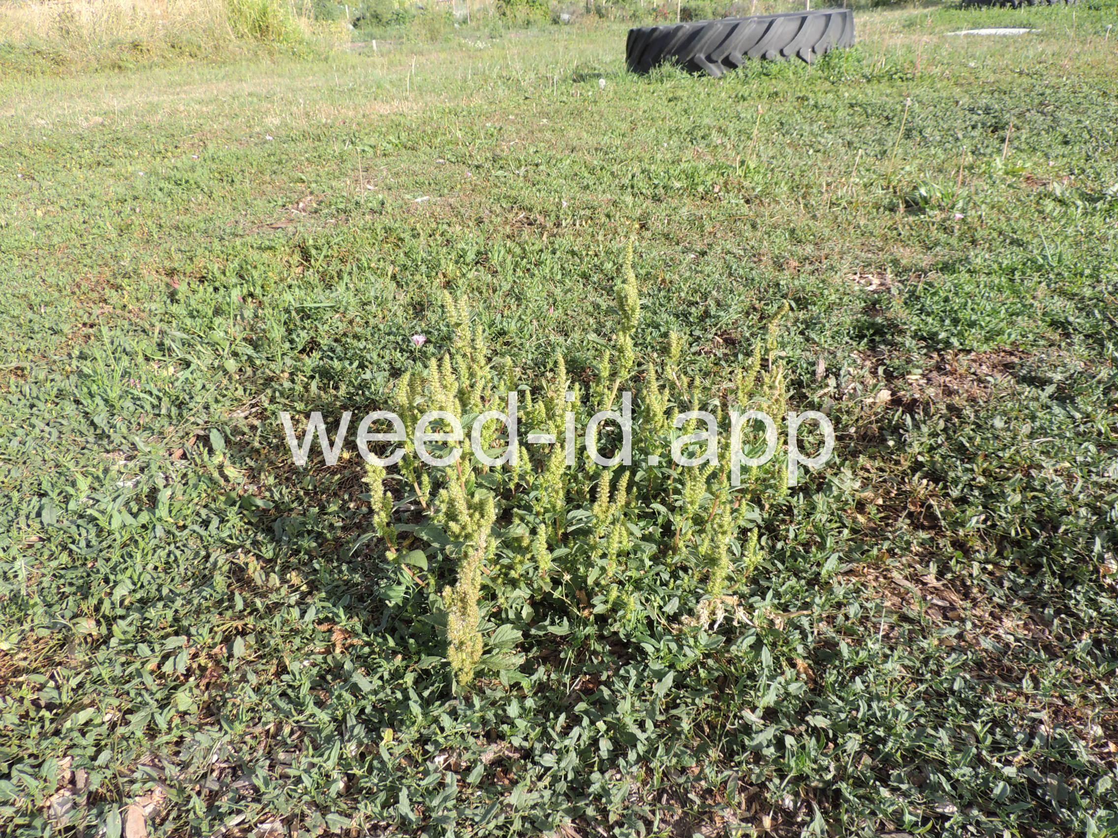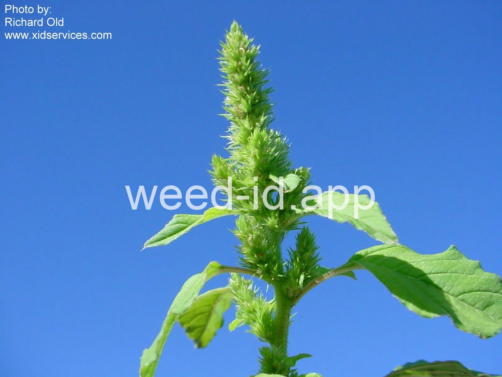 Also known as `rough pigweed.` The terminal spike is much shorter and broader than on the closely related Amaranthus powellii, Amaranthus palmeri, or Amaranthus hybridus. The taproot and often the lower stem base are reddish in color; hence the common name. As with all members of this genus, the flowers are small, green, and subtended by small spines.
