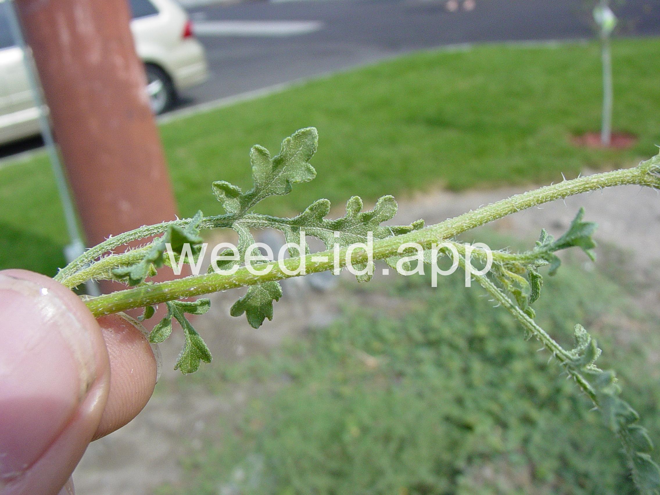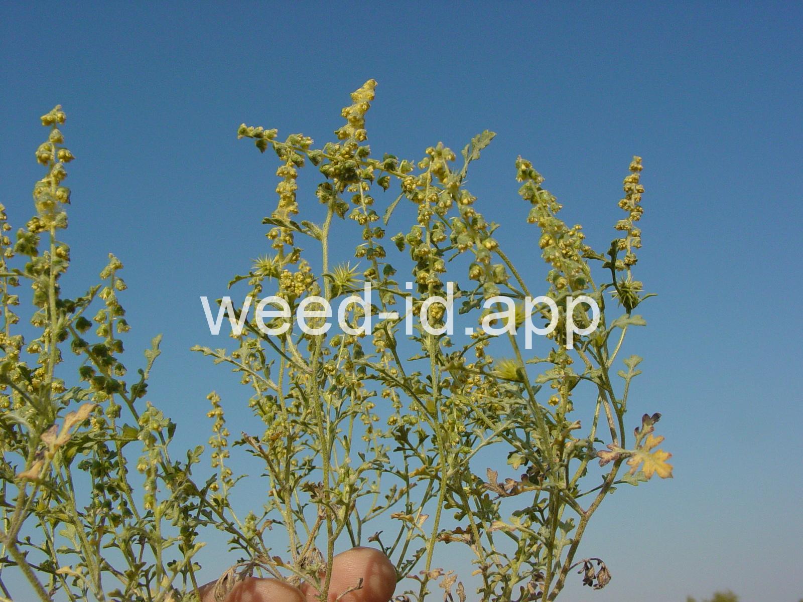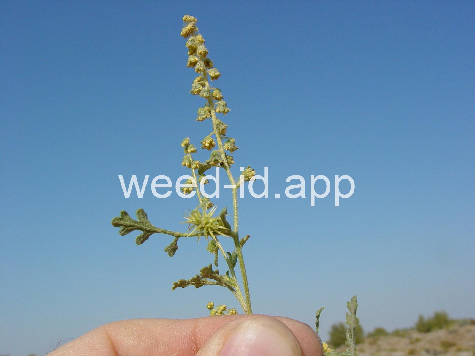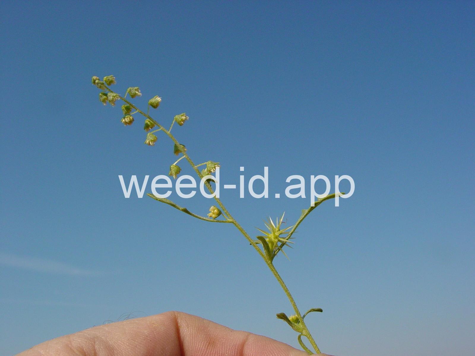 This scabrous annual grows in dry environments. The male and female flowers occur separately on the same plant. The male flowers form small, pendulous heads above the female flowers, which form small, spiny burs (the specific epithet `acanthicarpa` means `thorny fruit`).