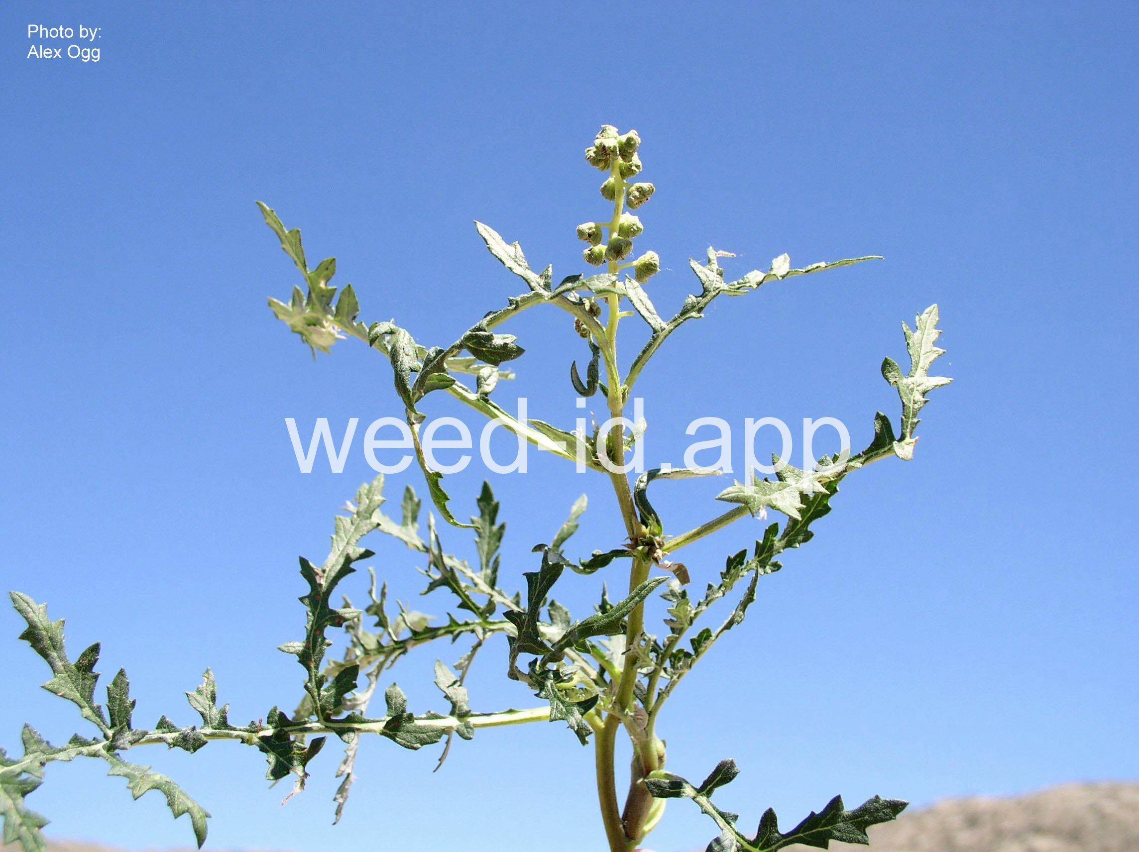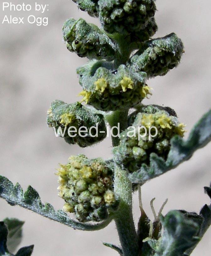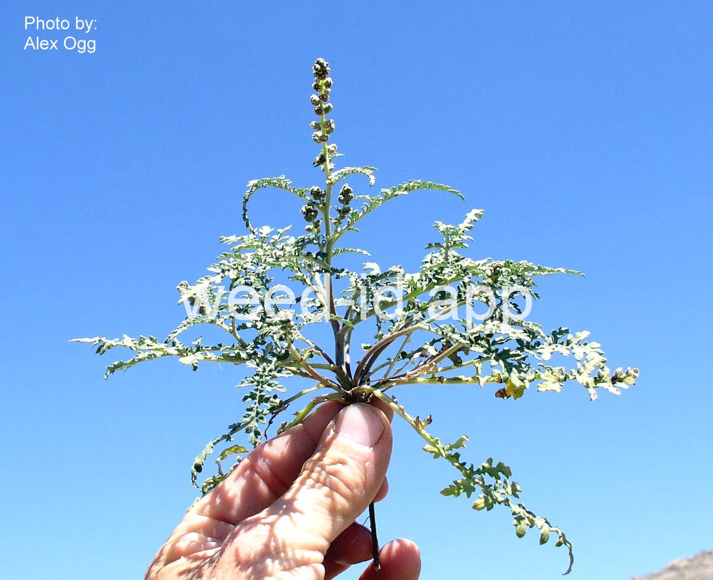 This strongly rhizomatous species has many lobed leaves. The lobes extend virtually to the midvein; these lobes have much shallower lobes along the margin. The leaves in this species are a much darker green than in Ambrosia grayi. The photo on page 50 of Weeds of the West is much more typical than that shown on page 212 of Nebraska Weeds.
