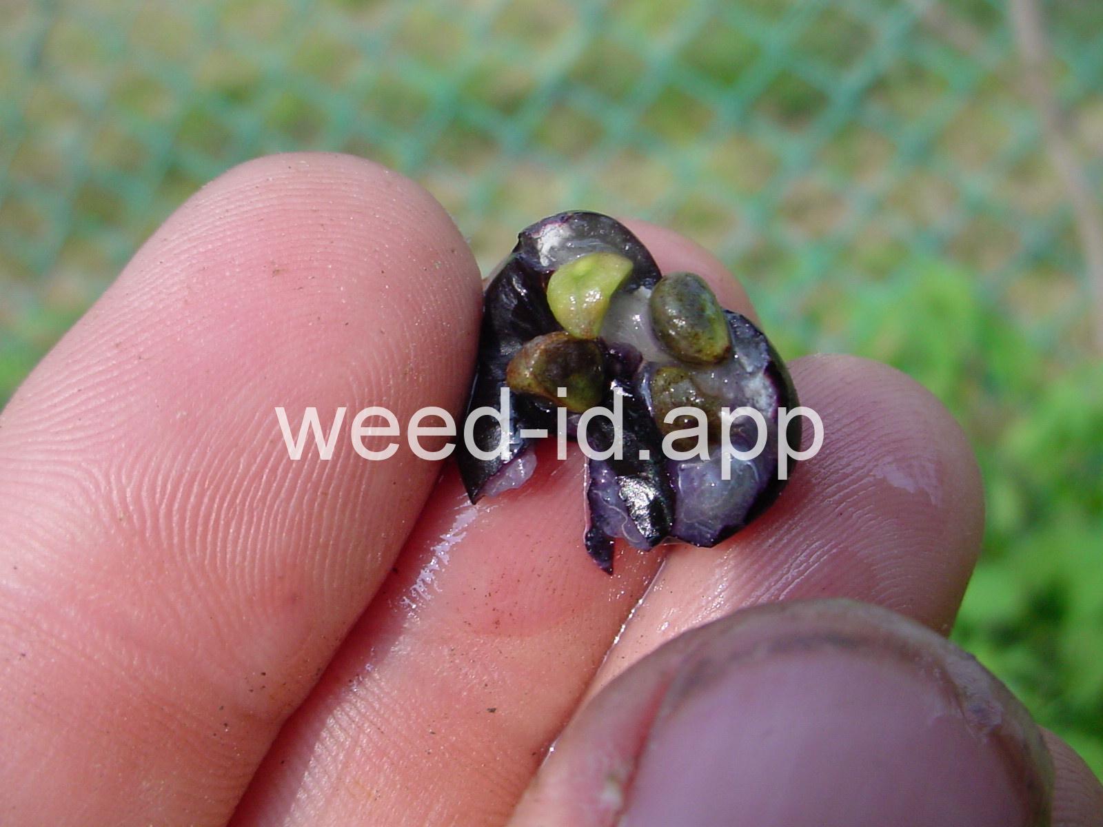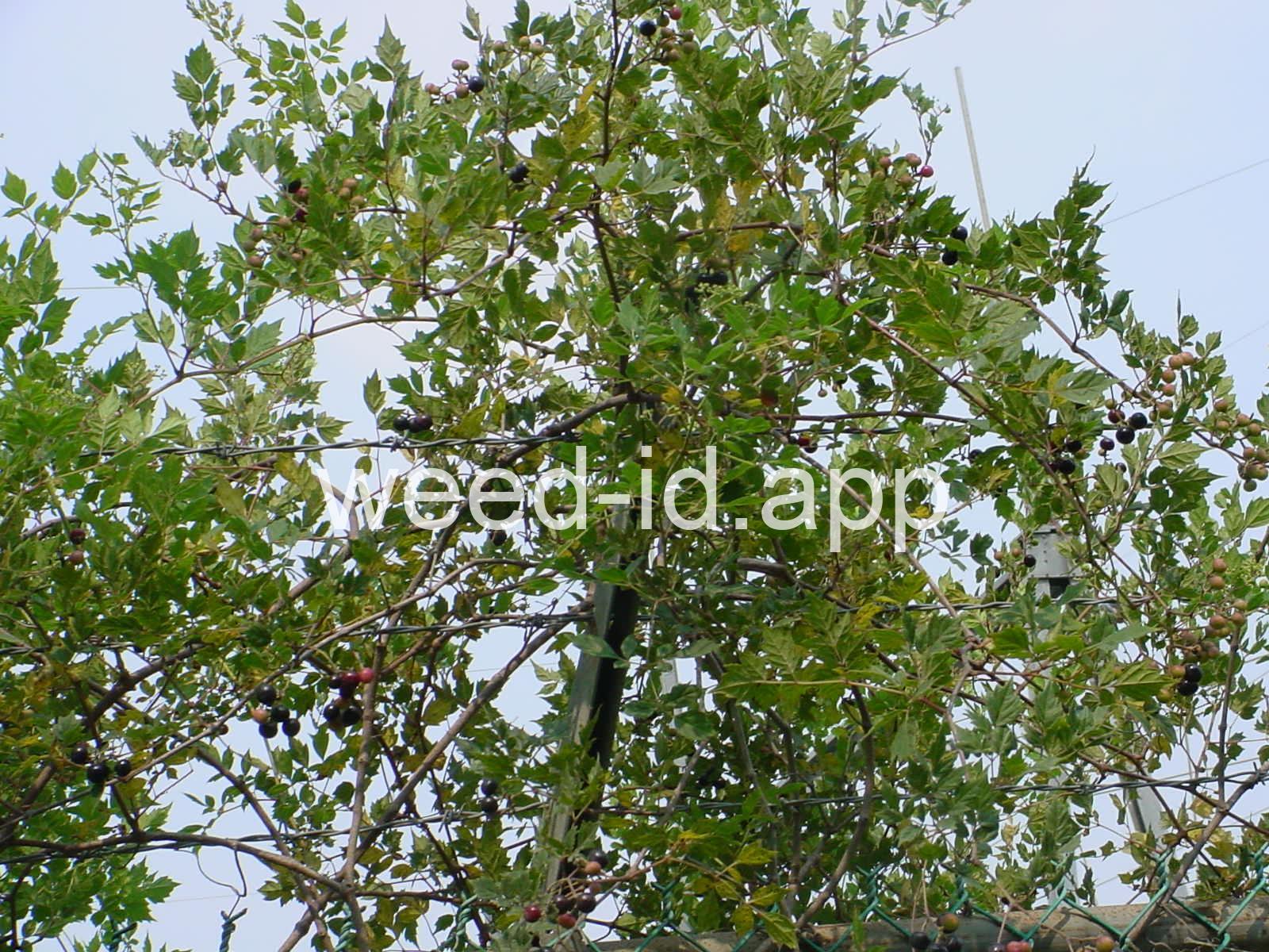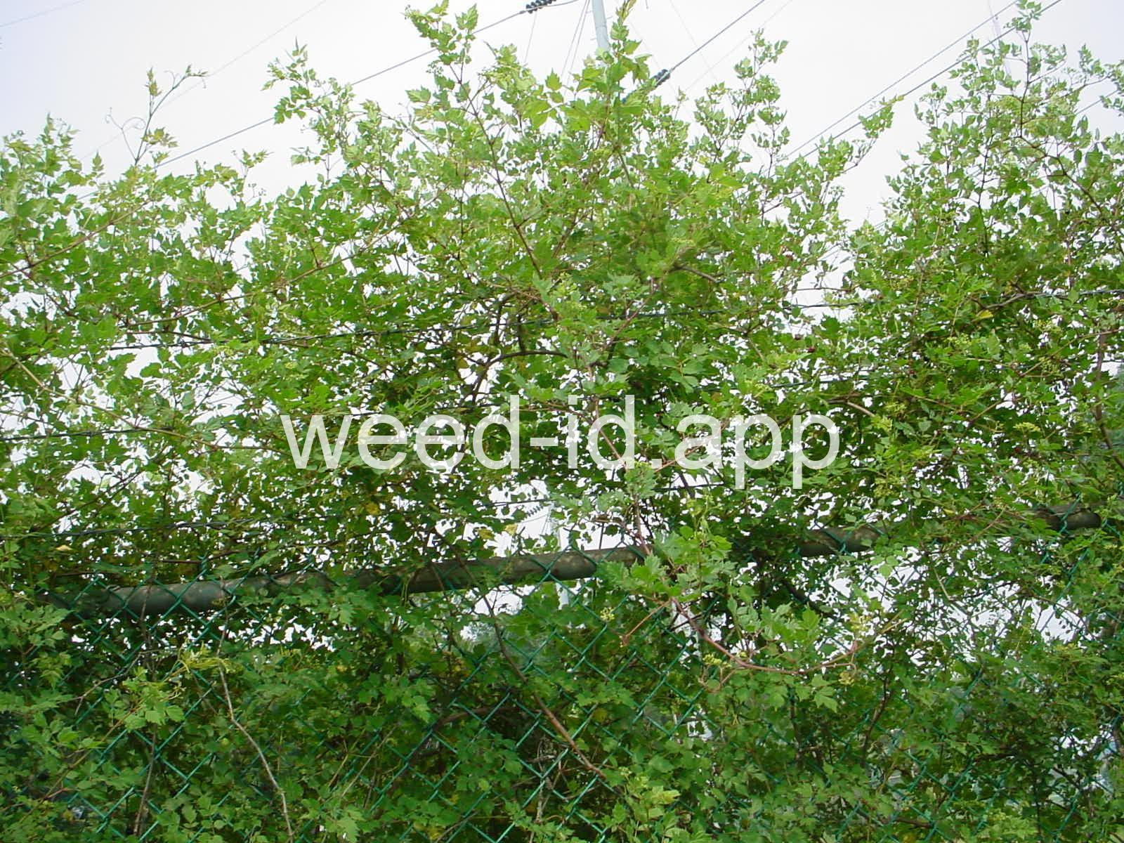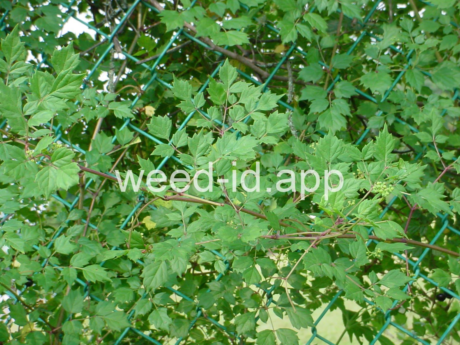 A deciduous vine with white pith and the inflorescences arising opposite the leaves. The leaves are pinnately dissected with each segment toothed or lobed and pointed at the tip. The mature fruits are black to blue berries which are somewhat broader than long.