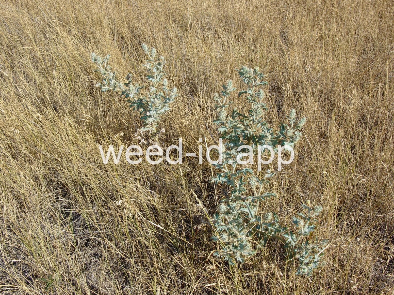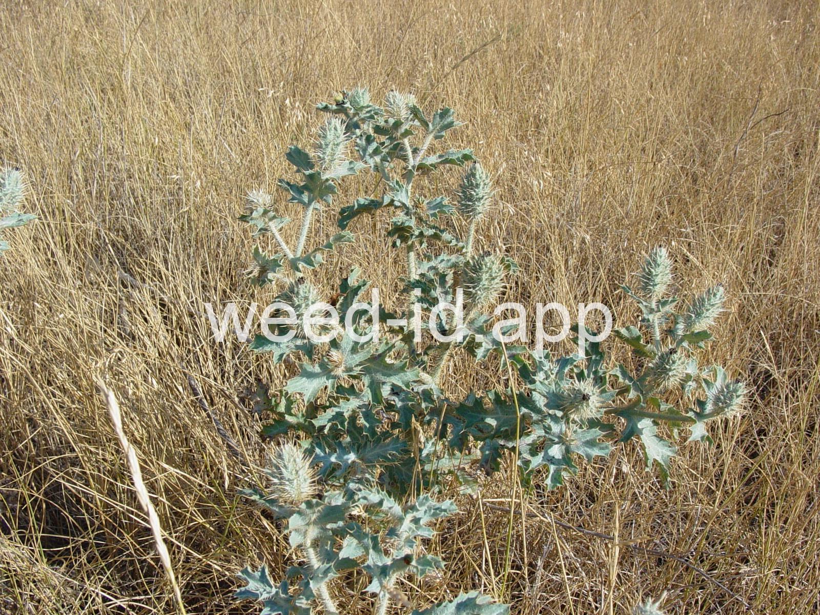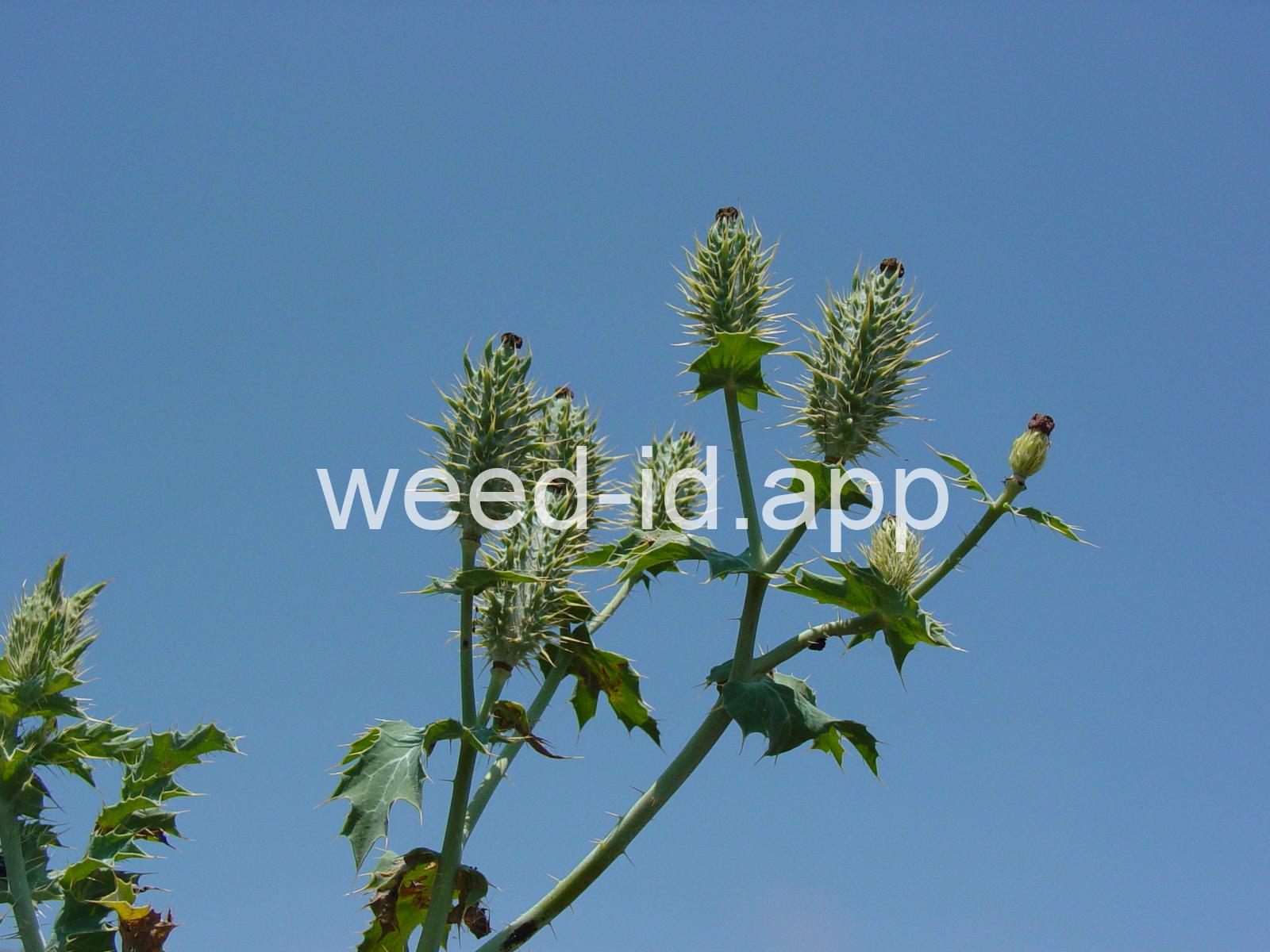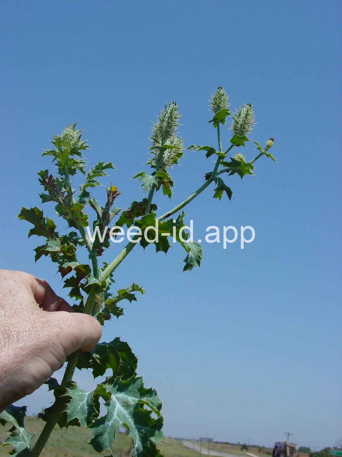 Leaf and stem surface smooth and hairless except for the very sharp, yellow spines. Plants exuding a yellow, milky substance when broken. Flowers with 6 large, white petals. Also known as prickly poppy. According to Arizona Weeds a very similar species, Argemone platyceras = Argemone hispida (crested pricklepoppy) can be distinguished by the fact that the horns which terminate the fruit are shorter and covered with spines; however, some sources consider these as synonyms for Argemone polyanthemos.