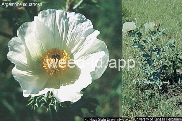 Spiny plants with yellowish juice and thick waxy leaves. A. squarrosa can be easily distinguished from Argemone polyanthemos whose leaves and stems are prickly but not hispid; however, mature fruits are needed to distinguish A. squarrosa from Argemone hispida (which has no spines at the base of the capsules).