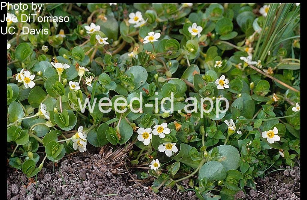 A trailing or creeping aquatic annual with hollow stems often rooting at the nodes. The leaves are round and opposite.