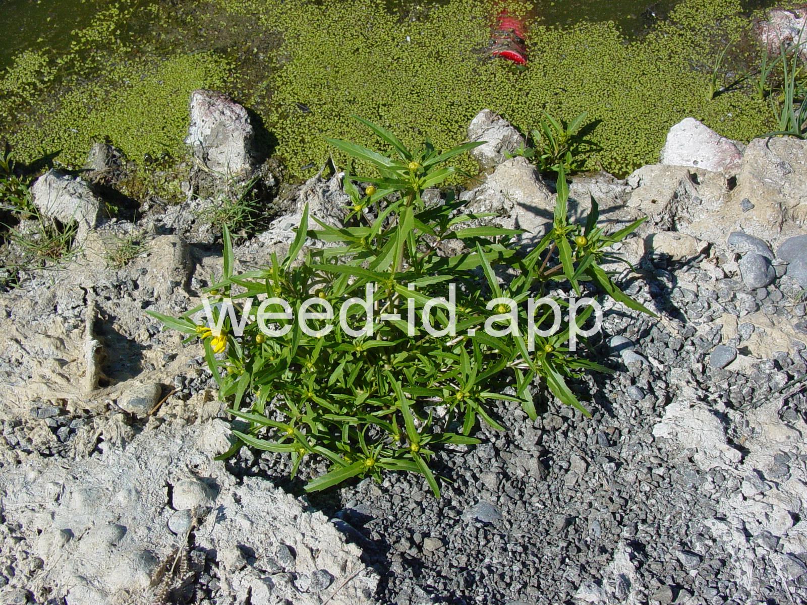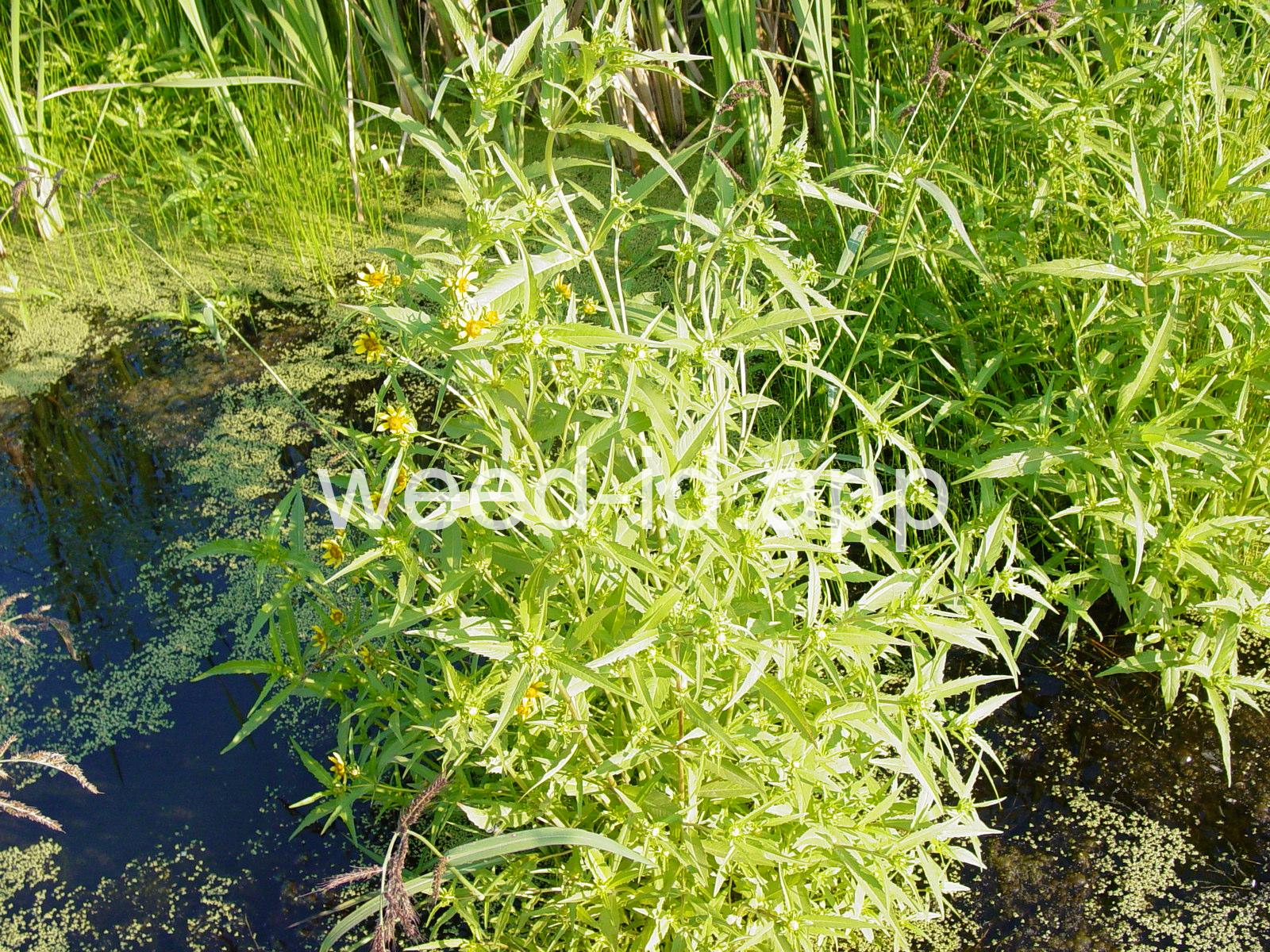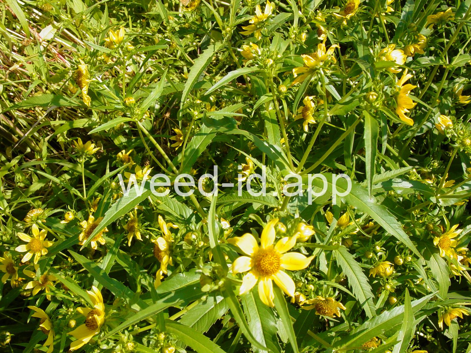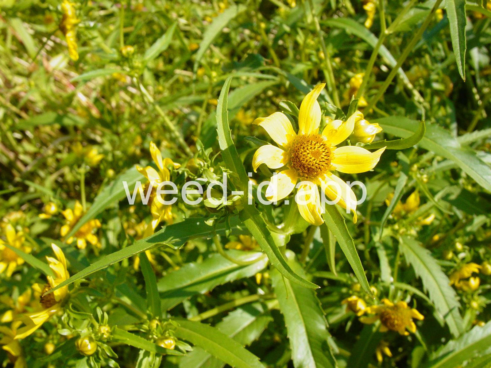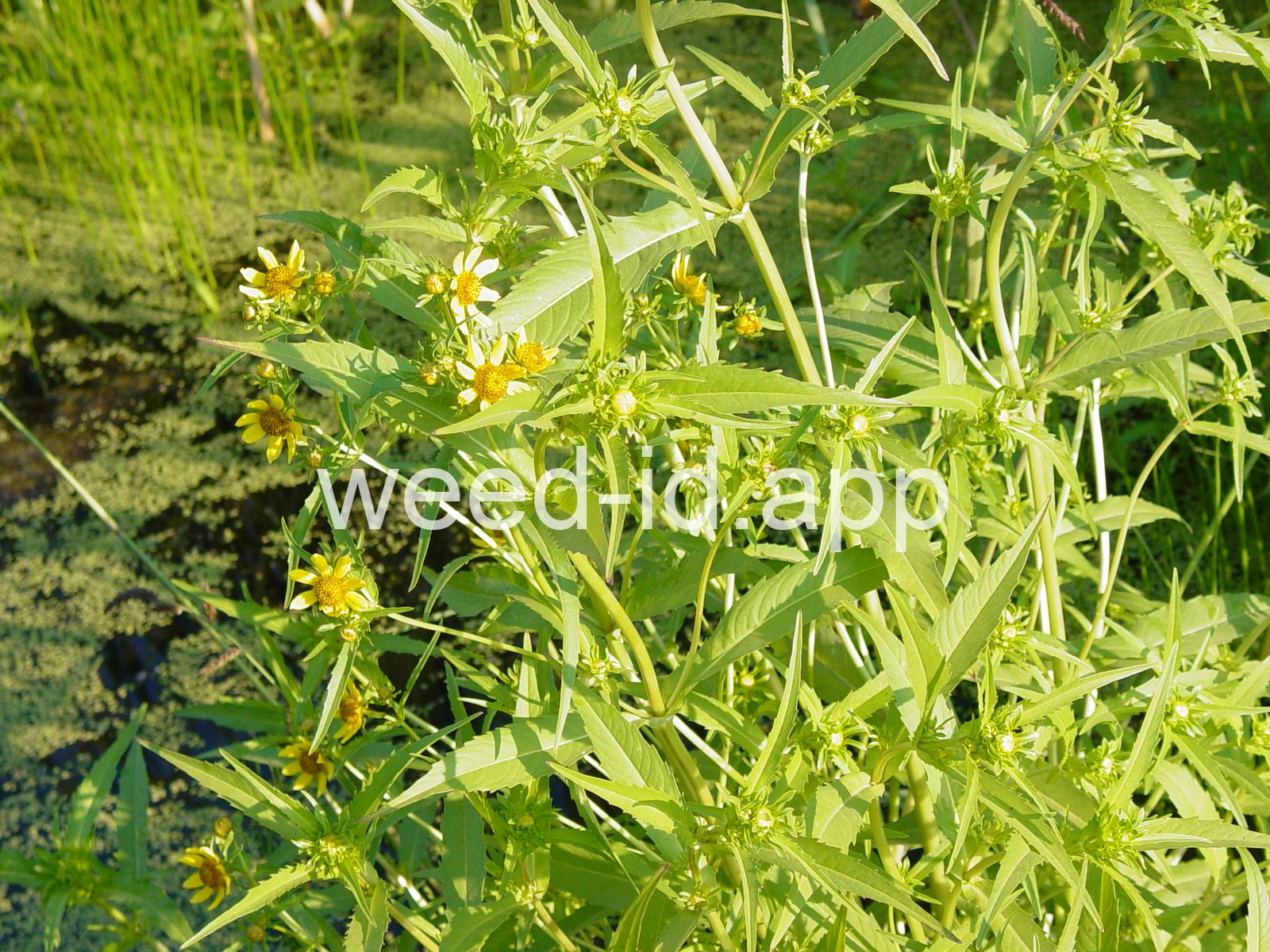 Leaves opposite, simple, and toothed. Flowers yellow with the ray flowers prominent, up to 15 mm long. Plants usually in very damp to wet areas. Seeds forming a bur with 4 terminal spines.