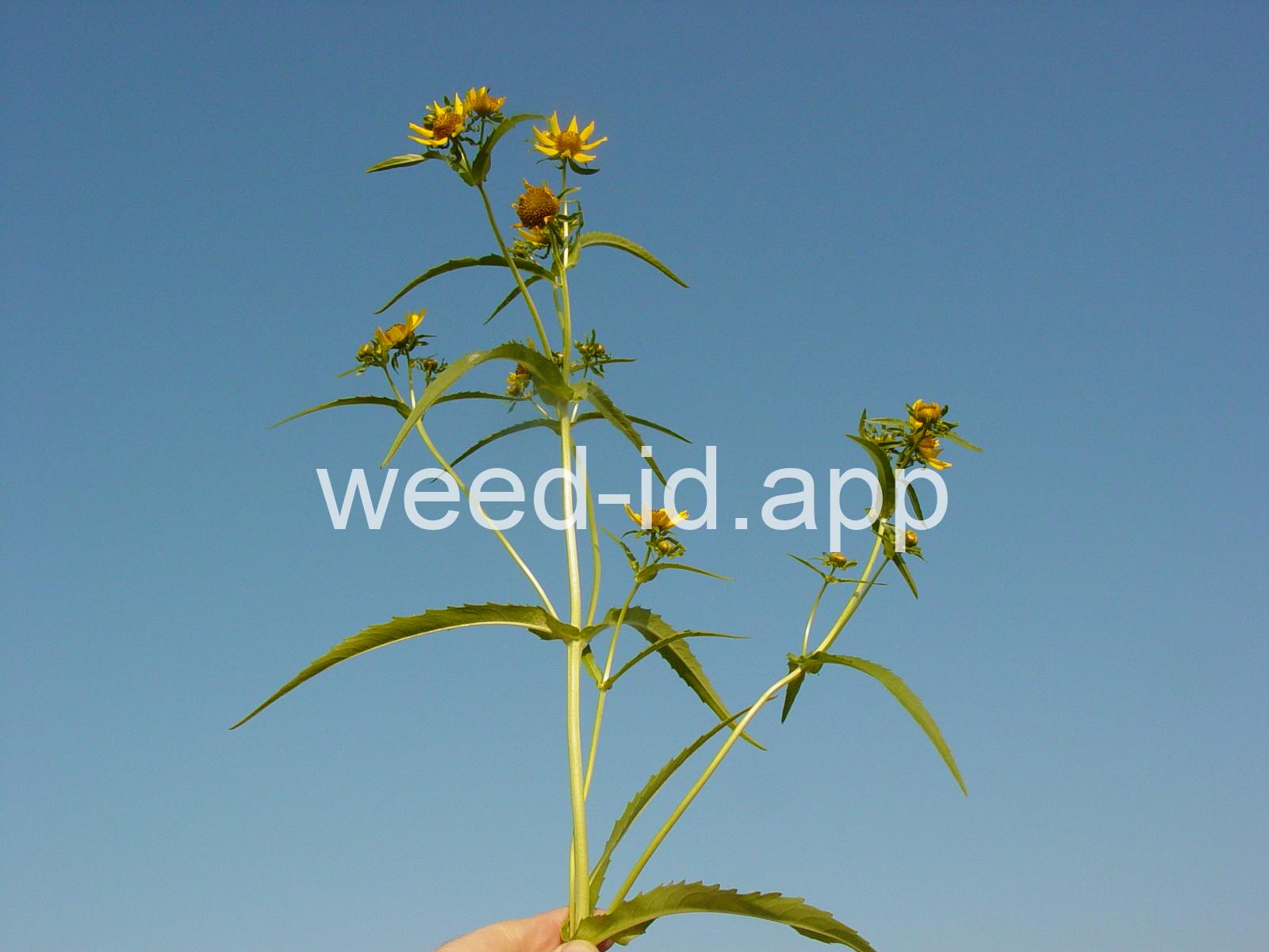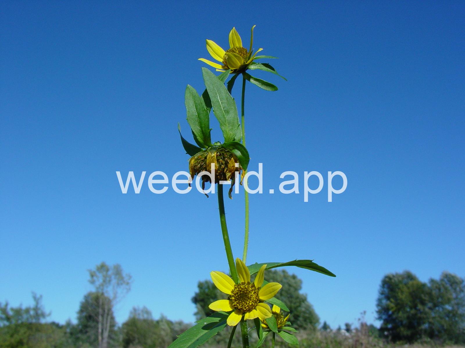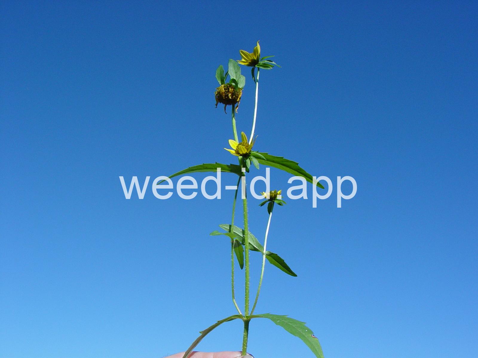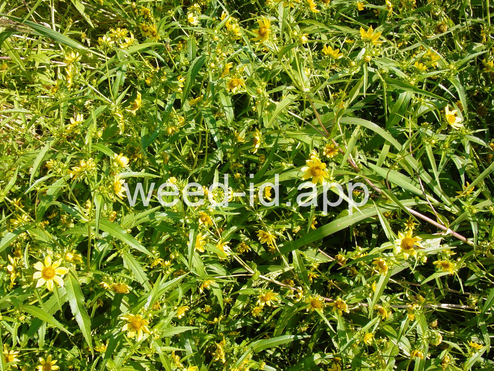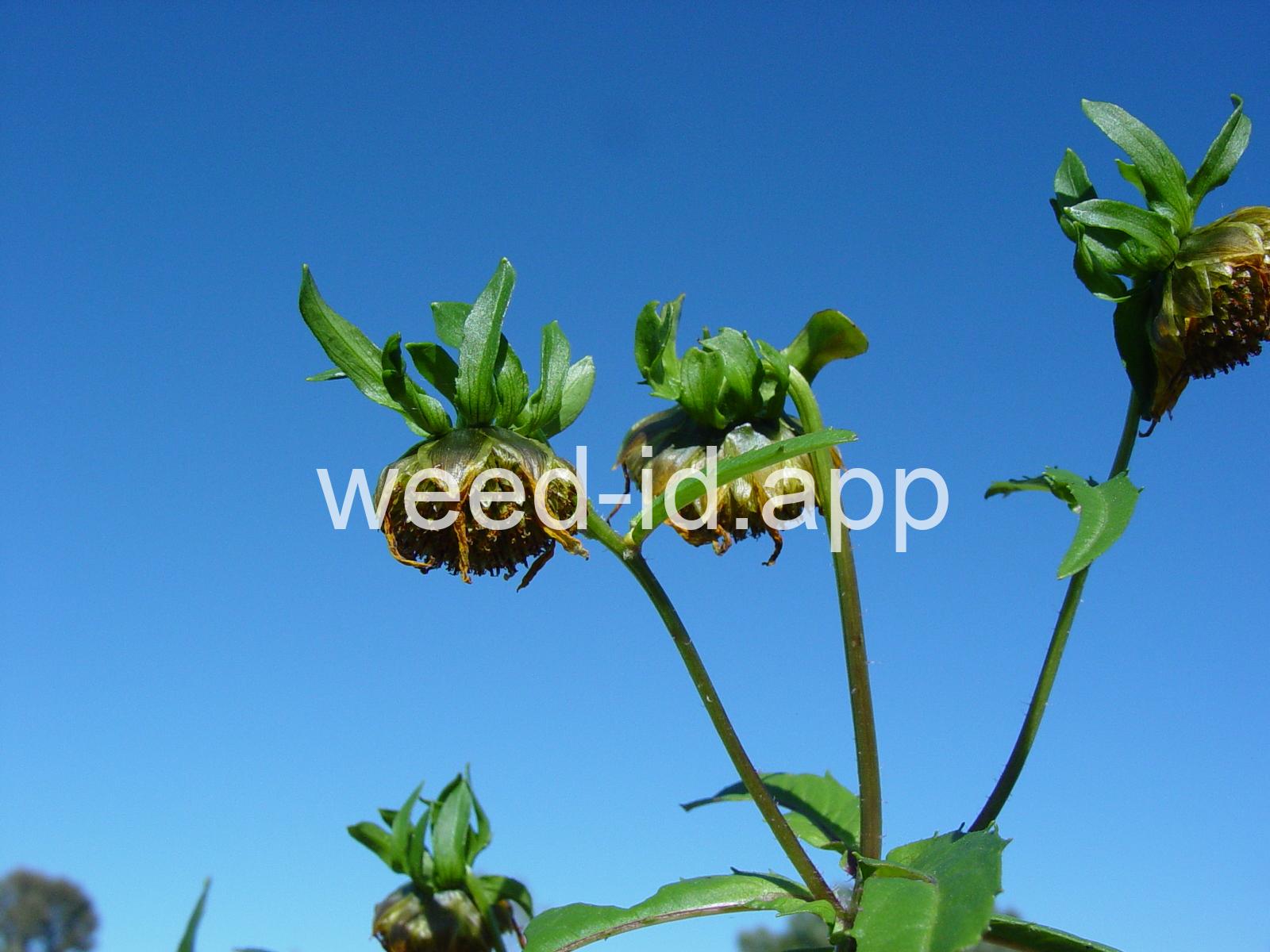 Leaves opposite, simple, and toothed. Flowers yellow with the ray flowers prominent, up to 15 mm long. Plants usually in very damp to wet areas. Seeds forming a bur with 4 terminal spines.