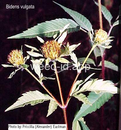 A coarse annual with 3-5 leaflets per leaf. The stems often red to purple. Very similar in most regards to Bidens frondosa (devils beggarticks) but with 10-16 (mostly 13) involucral bracts and olive to yellowish-brown seeds.