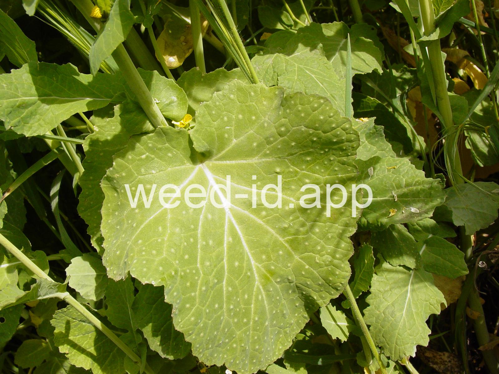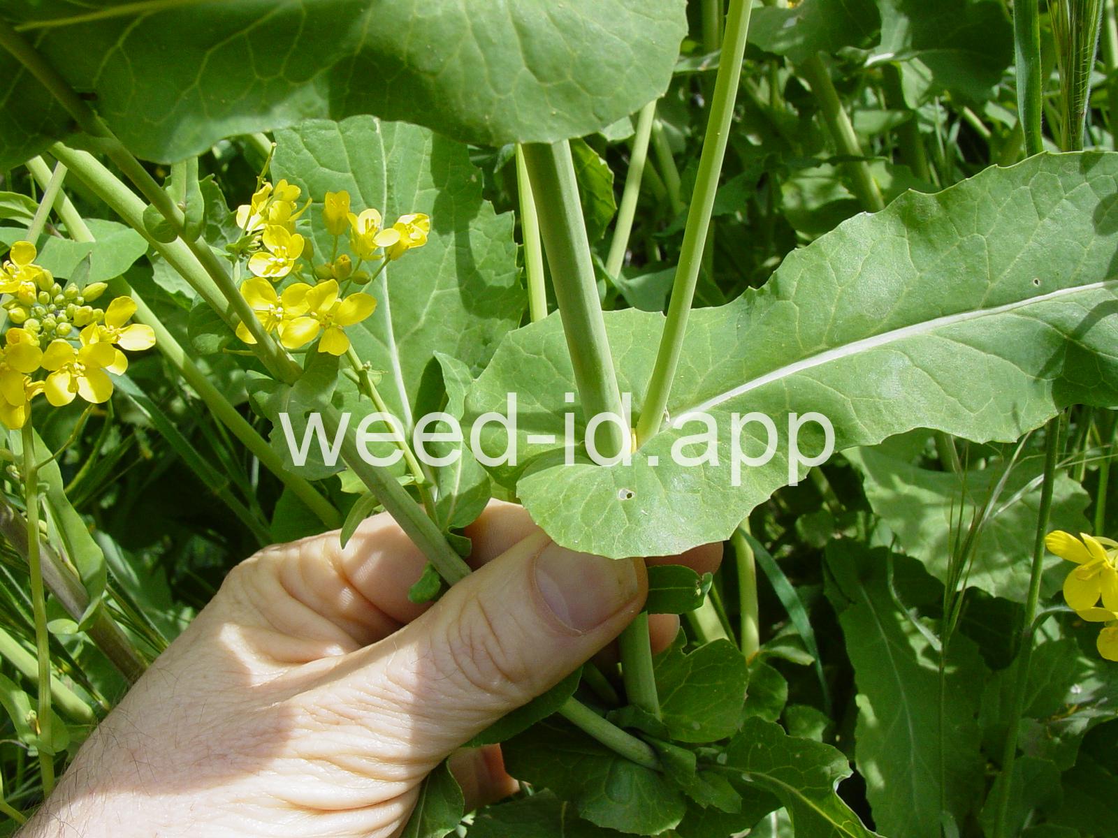 This is one of a group of species planted a crop under the names of `mustard`, `rape`, or `canola.` The leaves are bluish-green, hairless, and waxy. The upper leaves clasp the main stem. This species is common as a weed in winter wheat. In non-crop land the species is often referred to as `wild turnip.`