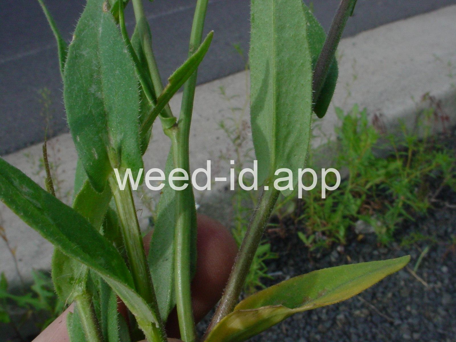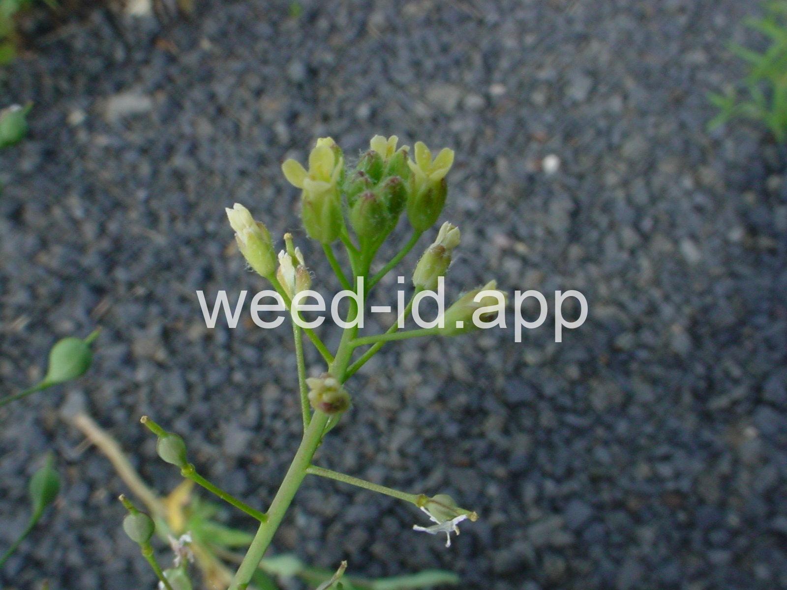 Flowers very small and yellow. The leaves forming small `ears` where they clasp the stem. A good hand lens will show these leaves to be covered with branched hairs. Pods are small, spherical to somewhat flattened, with a prominent beak.