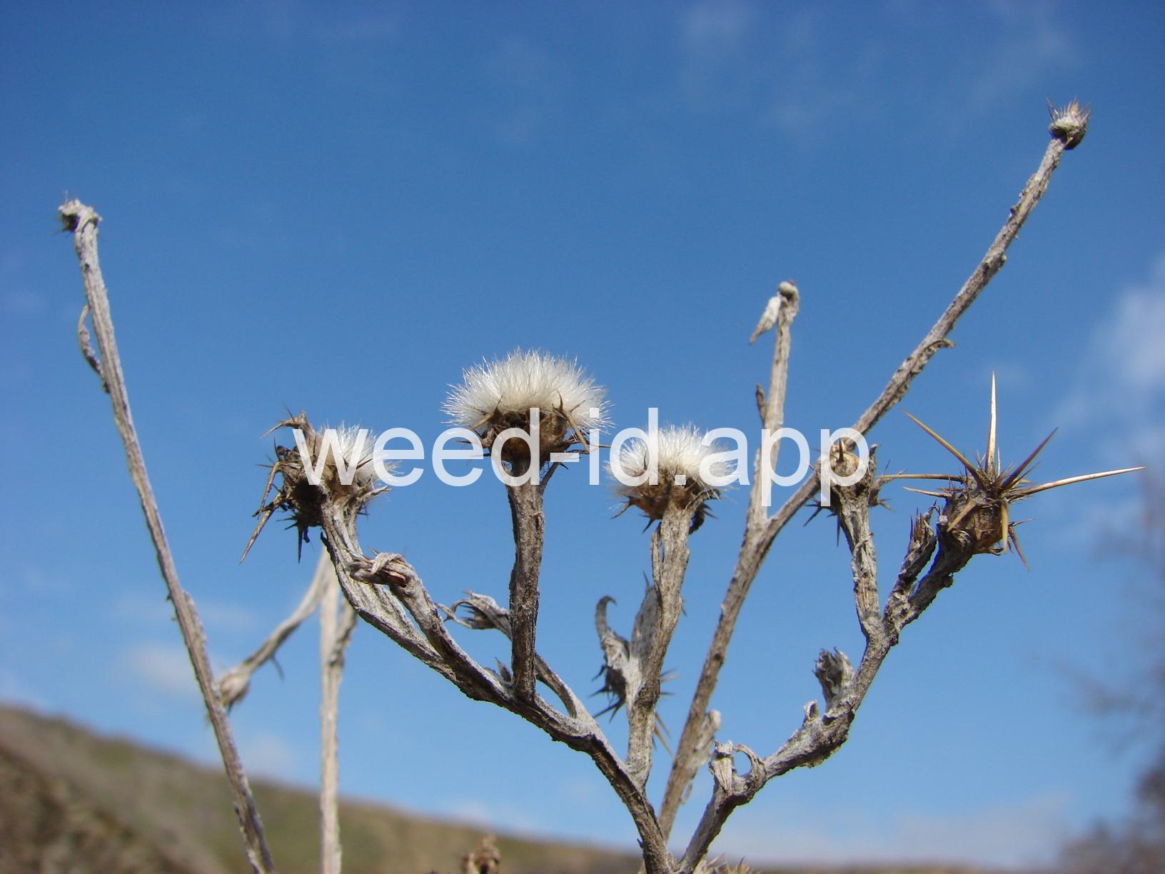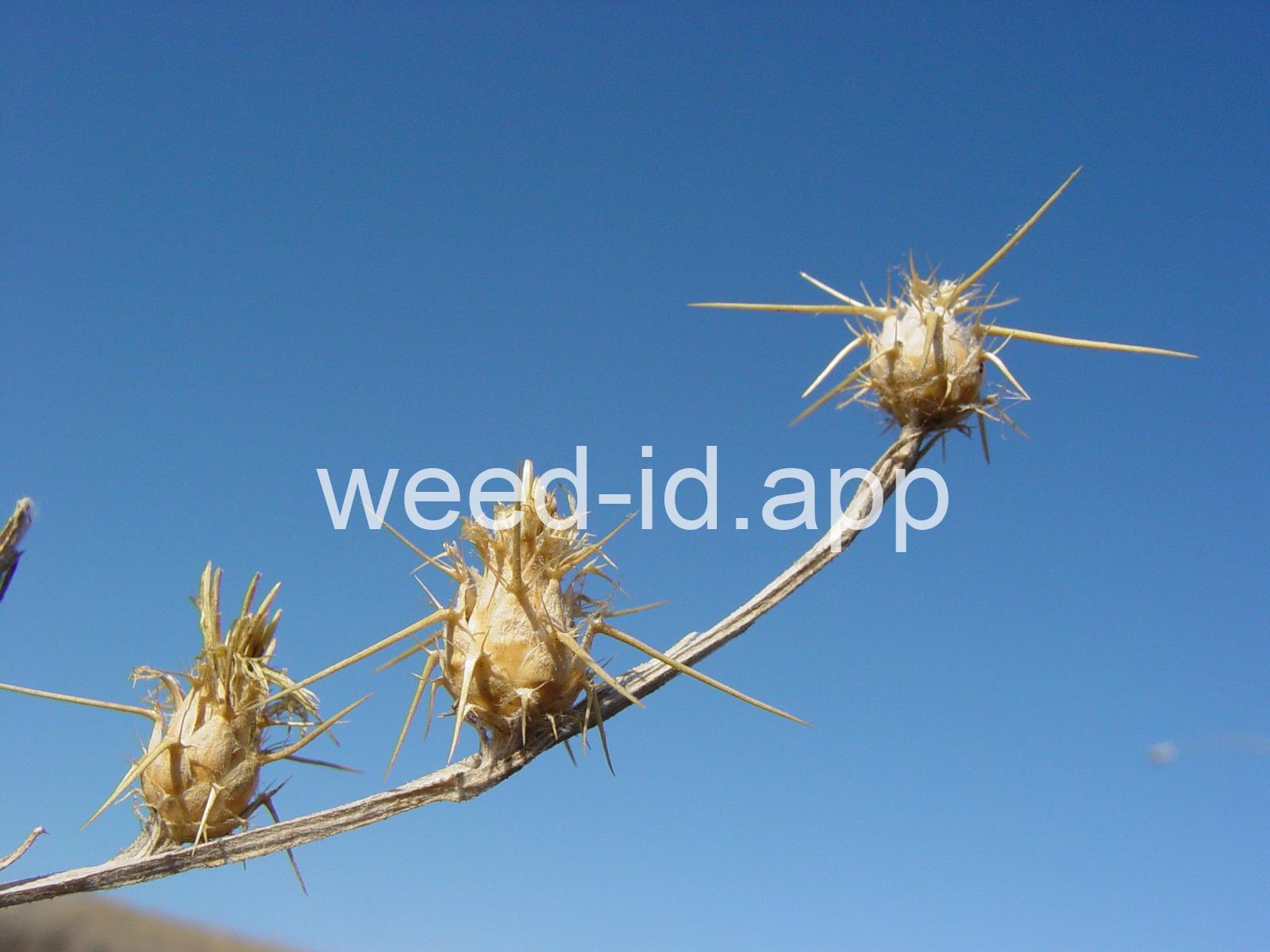 An extremely aggressive weed in dry habitats, this species often forms extensive monocultural stands. The stiff spines beneath the flower heads are often greater than an inch long. Each head produces 2 types of seeds, some with fluffy attachments for wind dissemination and the other without such attachments which fall near the parent plant. After seed shed, the prominently white, fuzzy receptacle remains and has earned the plant the common name of `cotton-top thistle` in Britain. The plant is very toxic to horses. In some areas it is called Barnaby or Barnaby`s thistle.