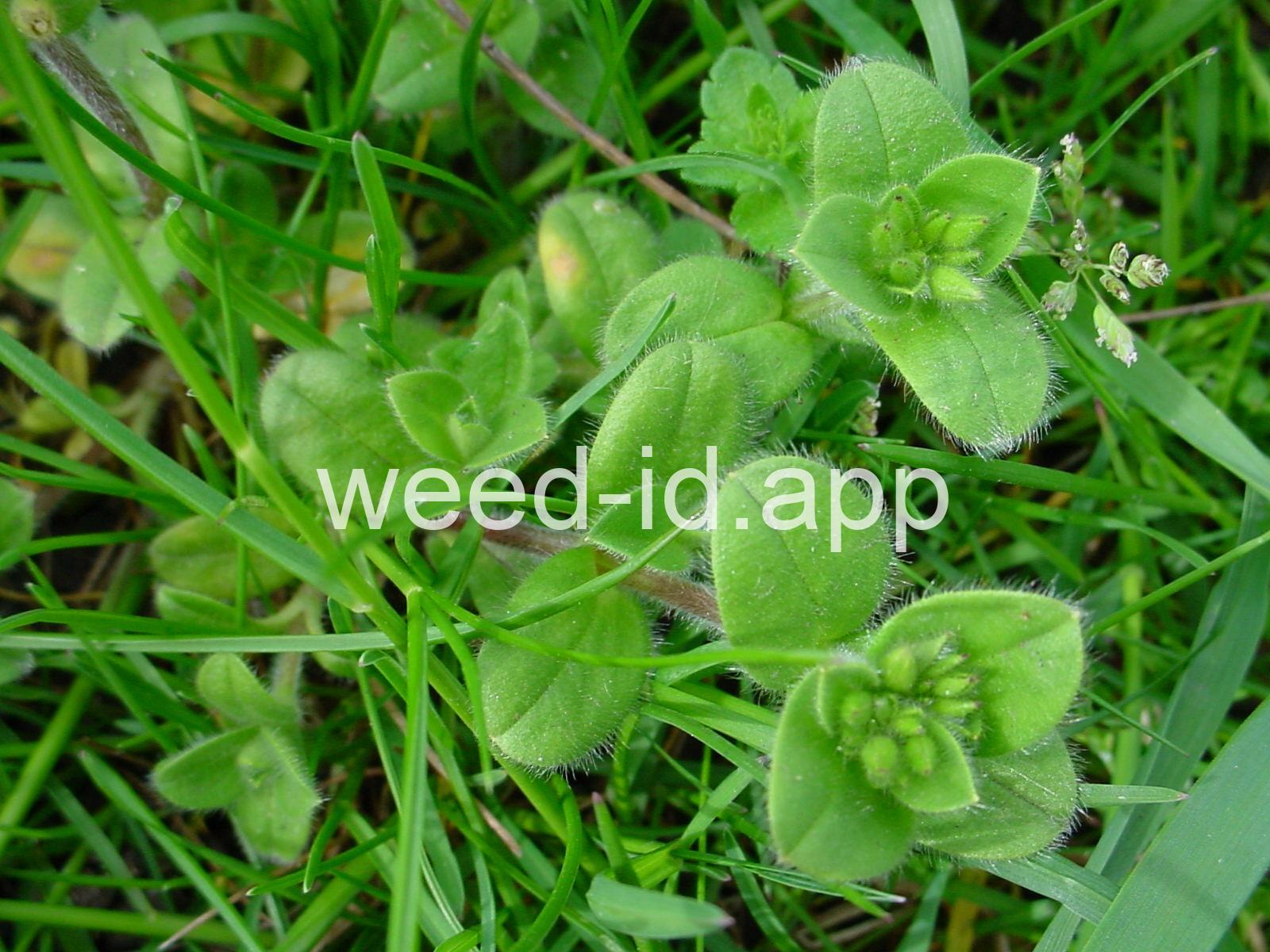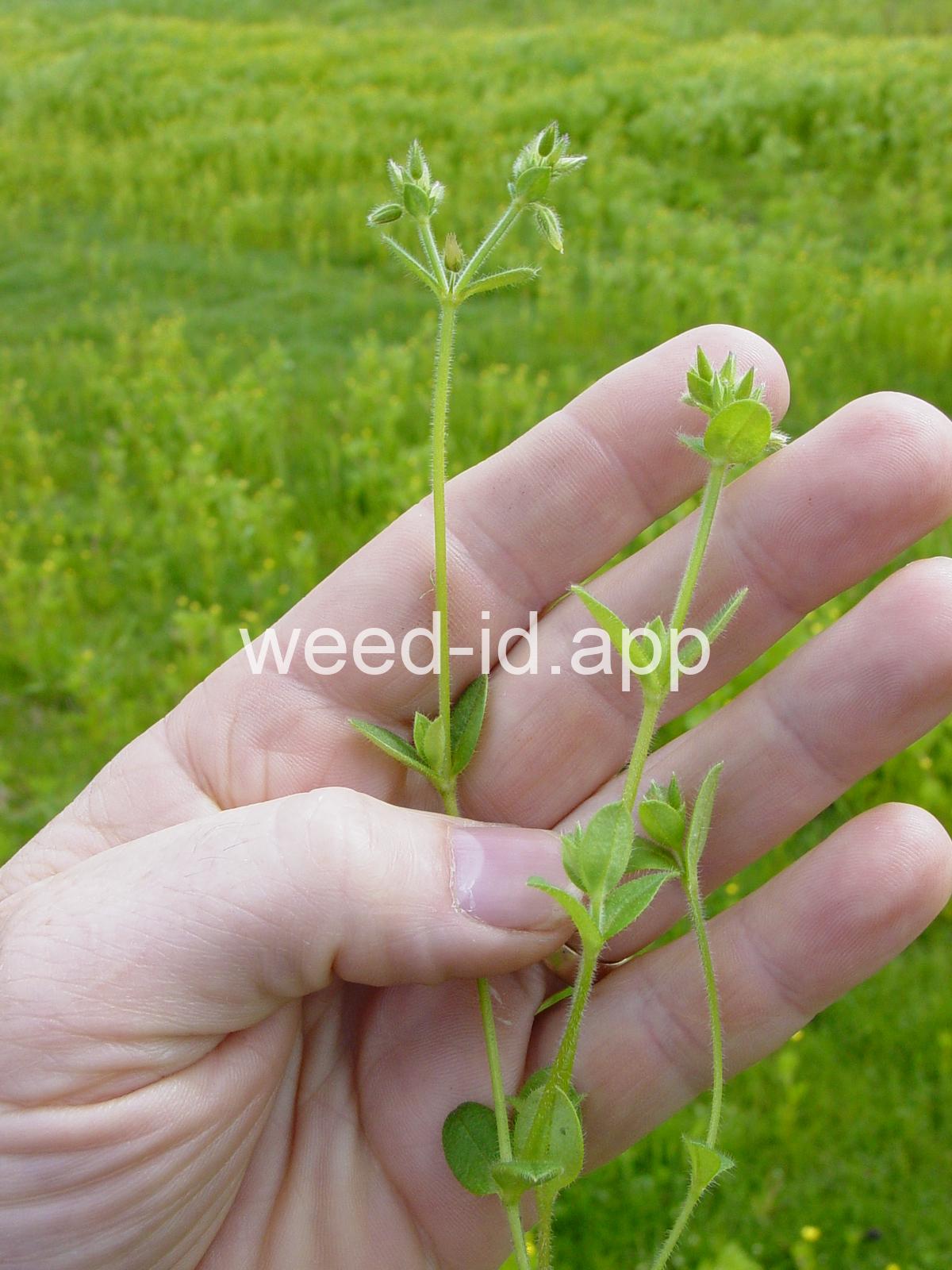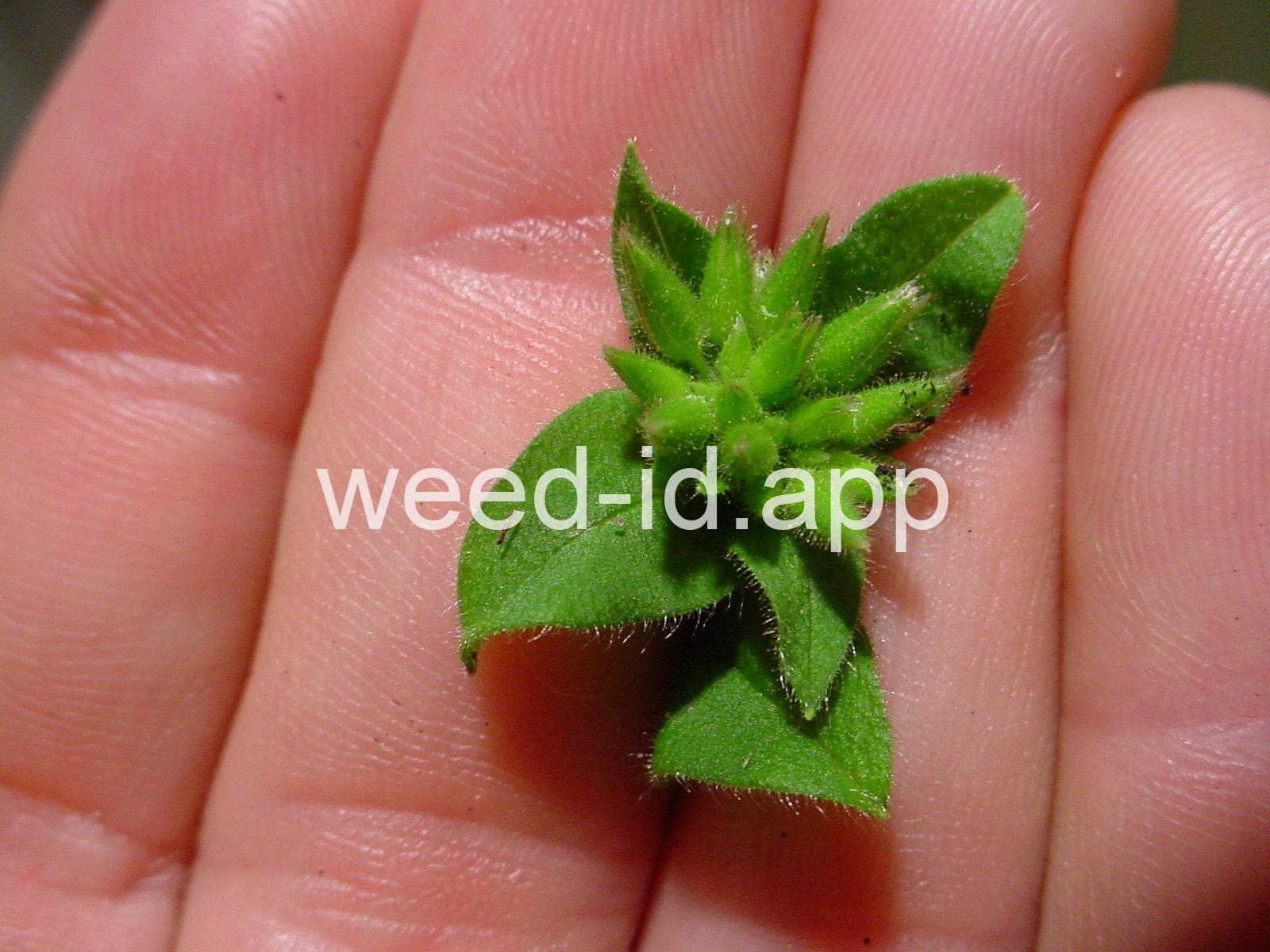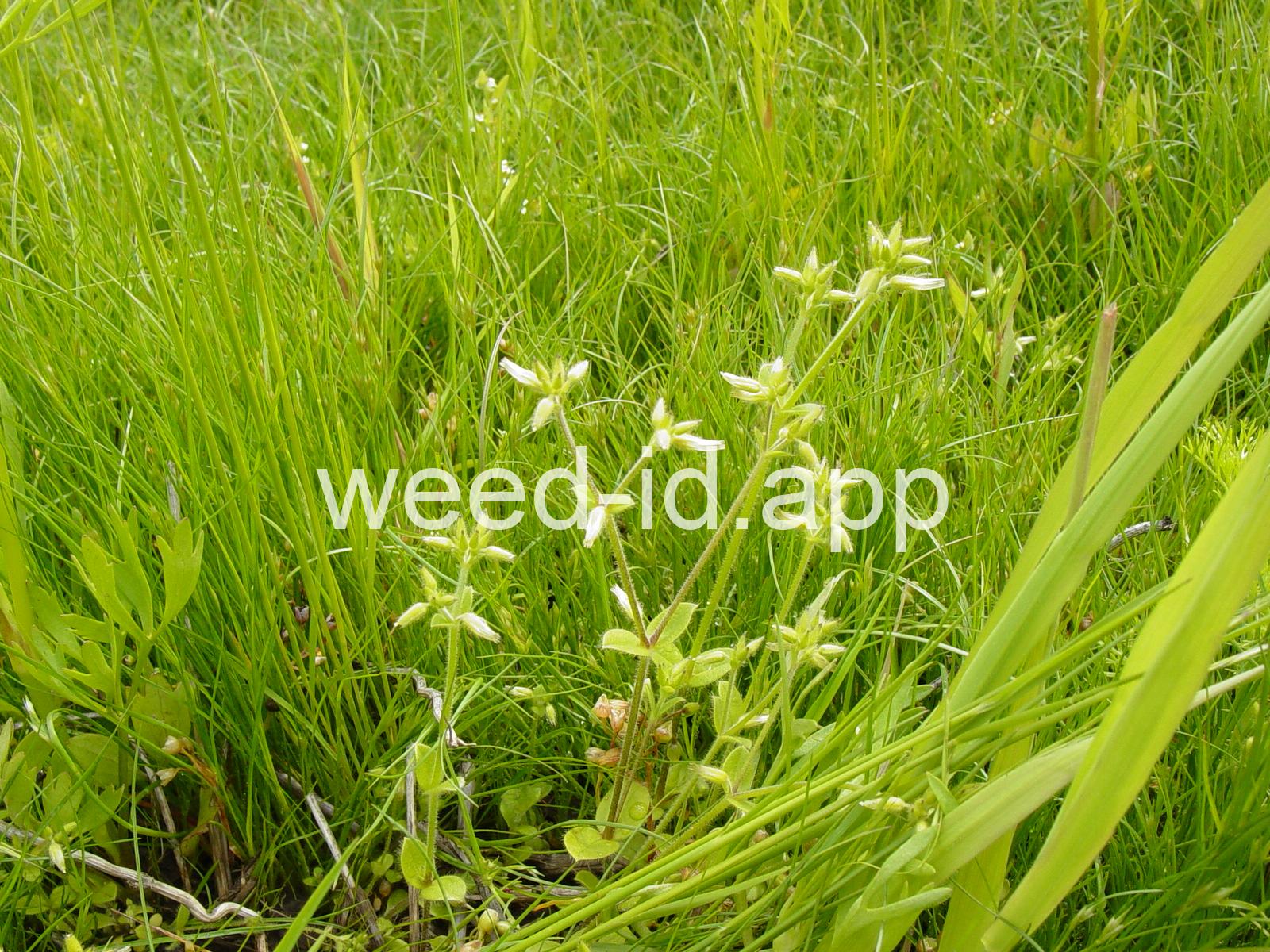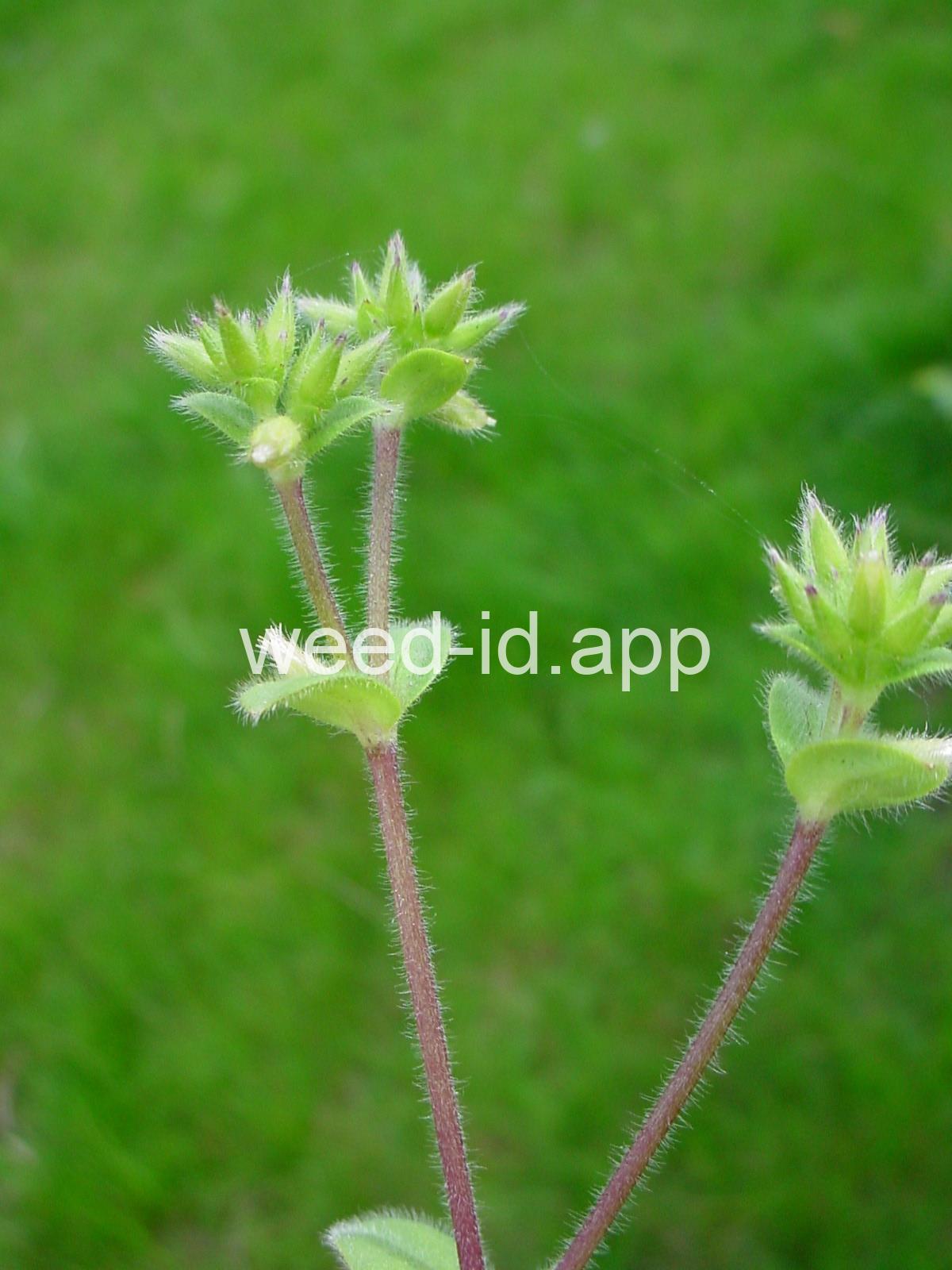 Leaves fuzzy. The plant, in many respects, very similar to mouseear chickweed (Cerastium vulgatum) but annual. Petal white and bilobed (sometimes lacking), about as long as the sepals. The upper portions of the plant often with sticky glands.