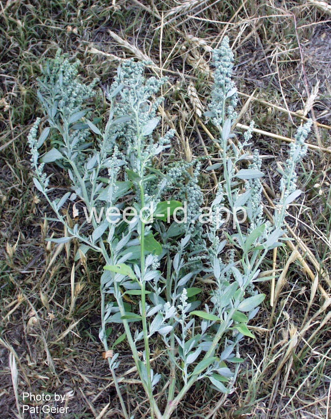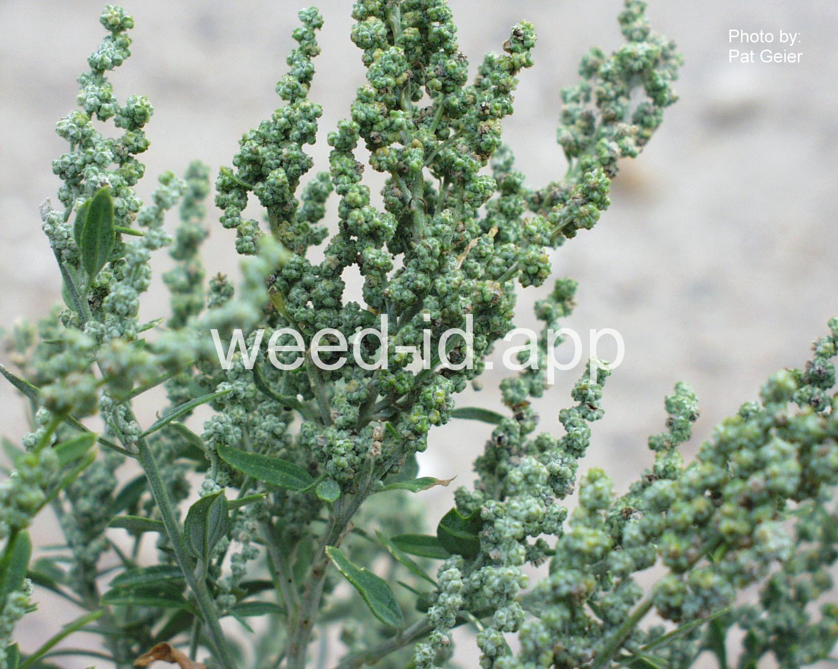 Also called `thickleaf goosefoot.` At least some of the lower leaves with a pair of lobes near the base. The leaves are densely scurfy-mealy. The seeds are disk-shaped and, therefore, broader than long. This species is often confused with Chenopodium leptophyllum which never has the leaves lobed near the base.