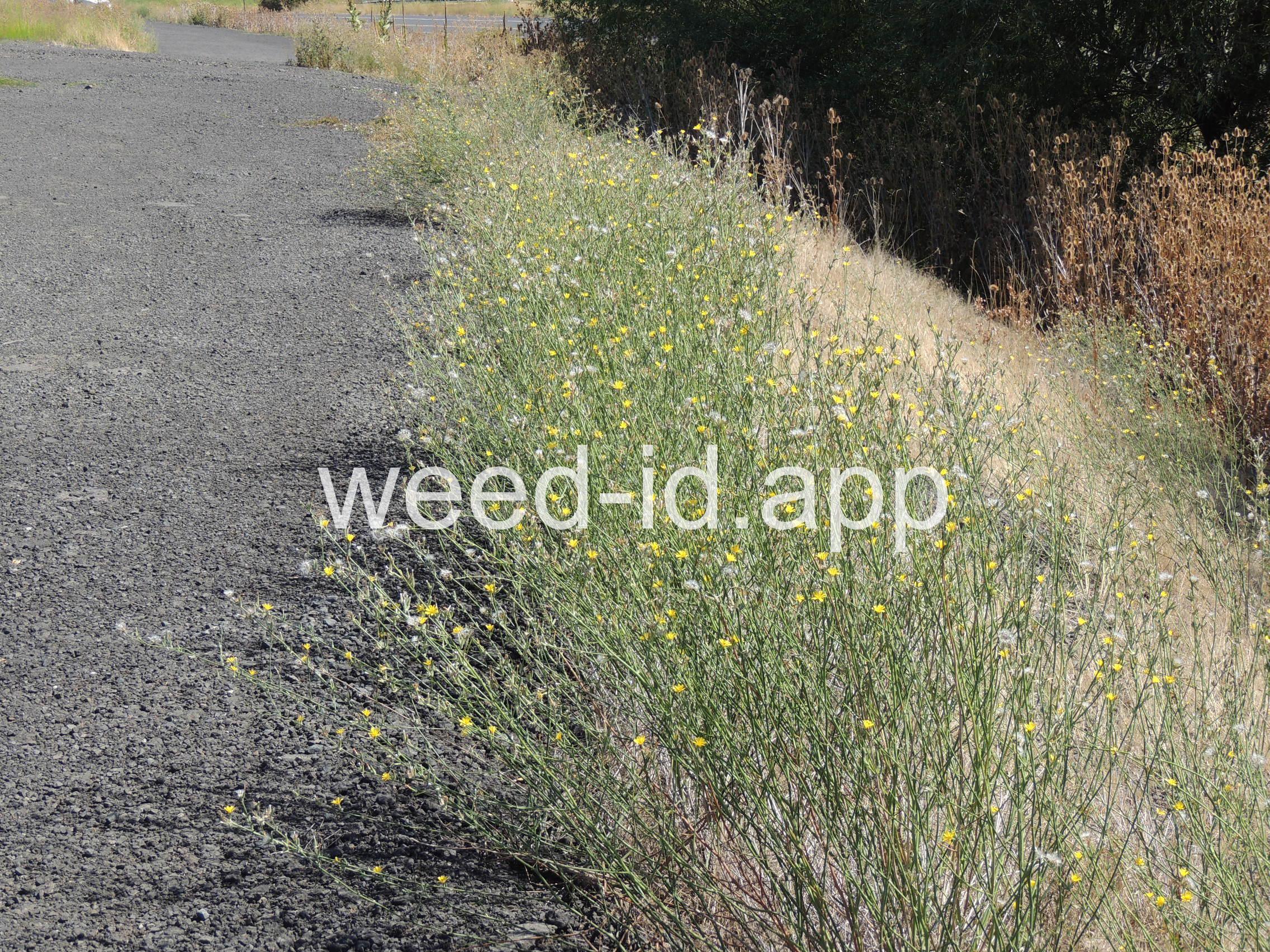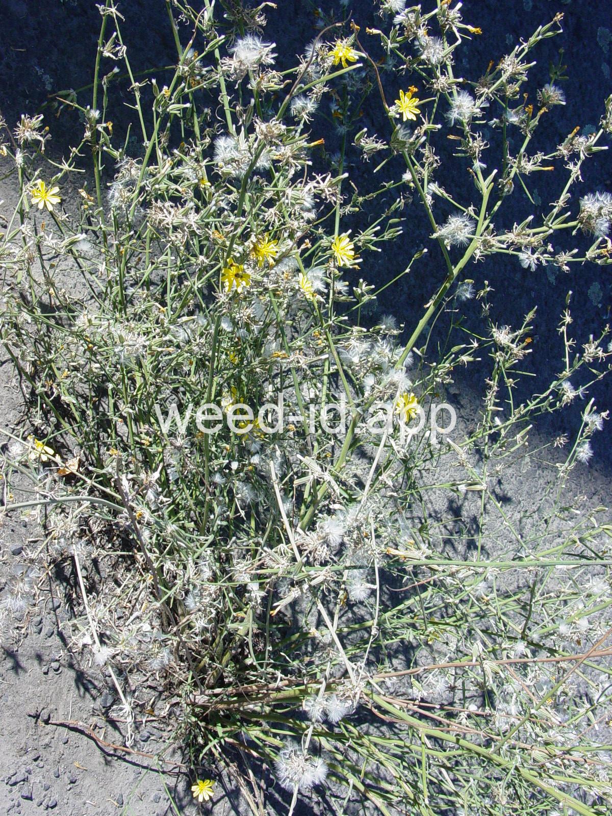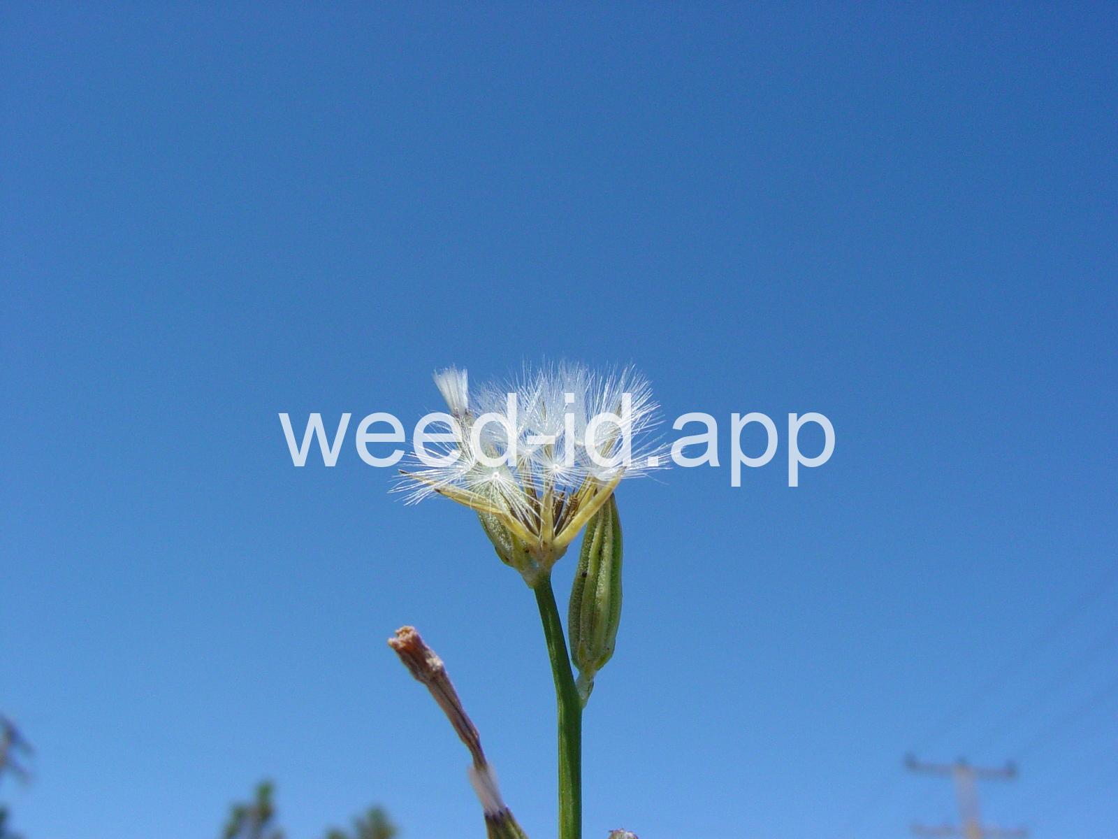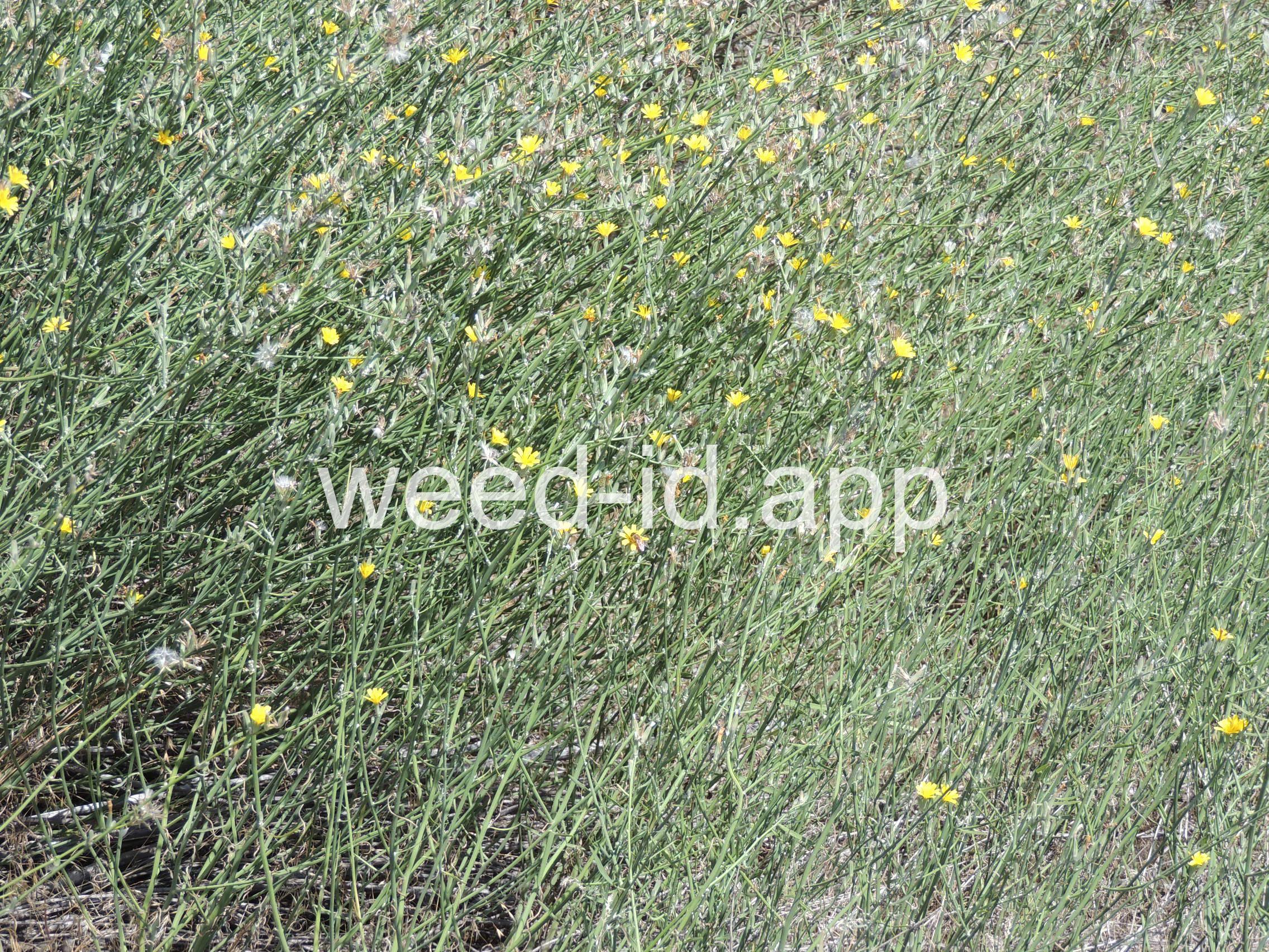 The name skeletonweed refers to the practically naked stems. The small heads generally have 10 ray flowers. The definitive characteristic for identification is the presence of reddish, down-turned hairs on the bottom 4 inches of the stem. The rosettes are indistinguishable from those of dandelion except for the rhizomes.