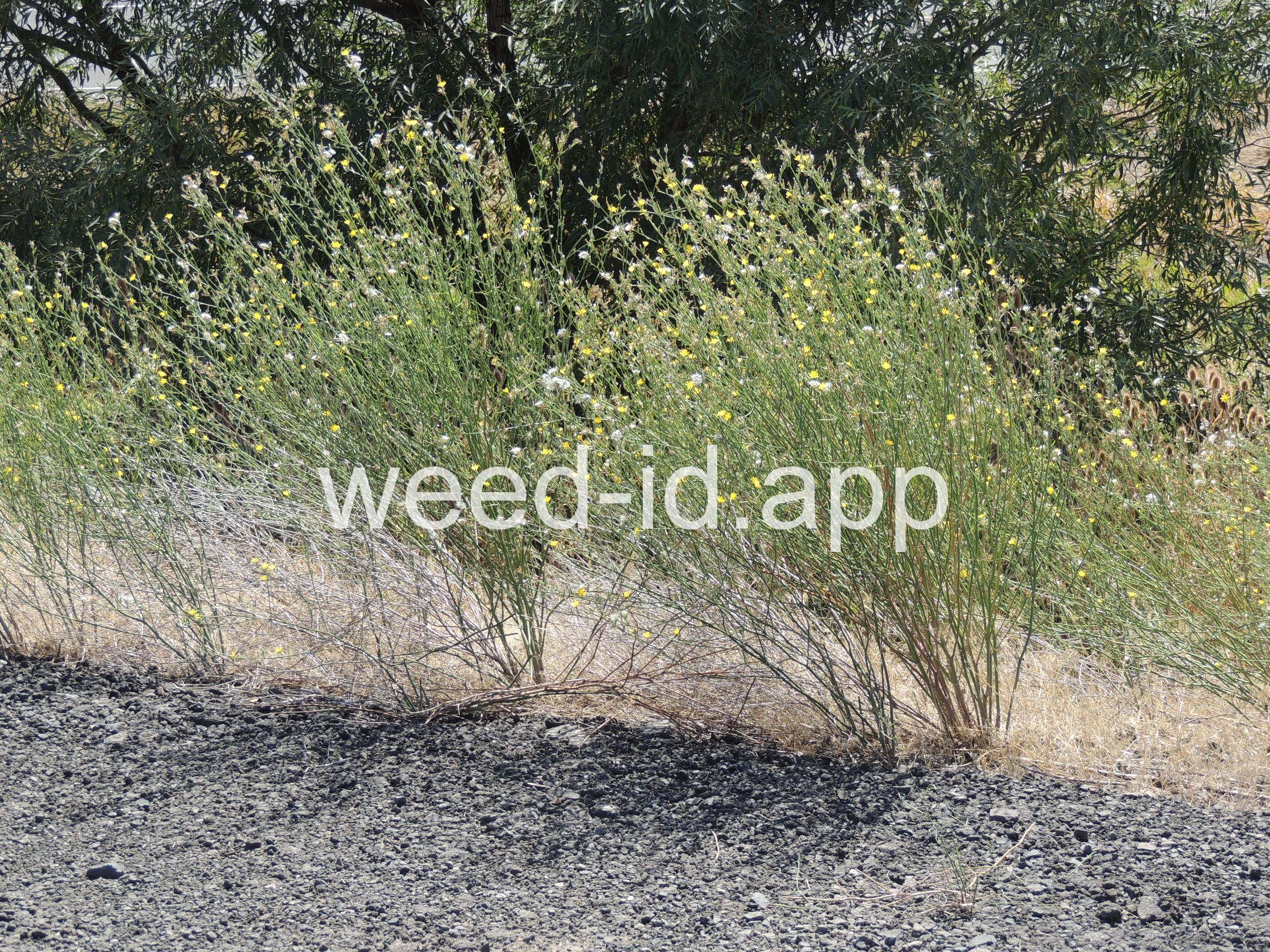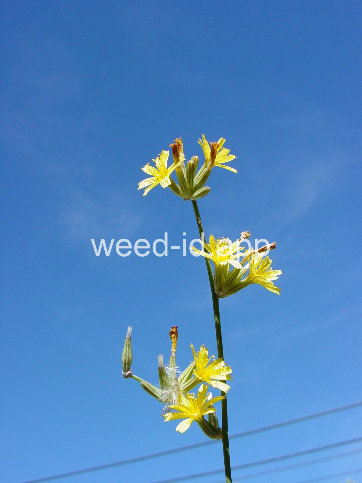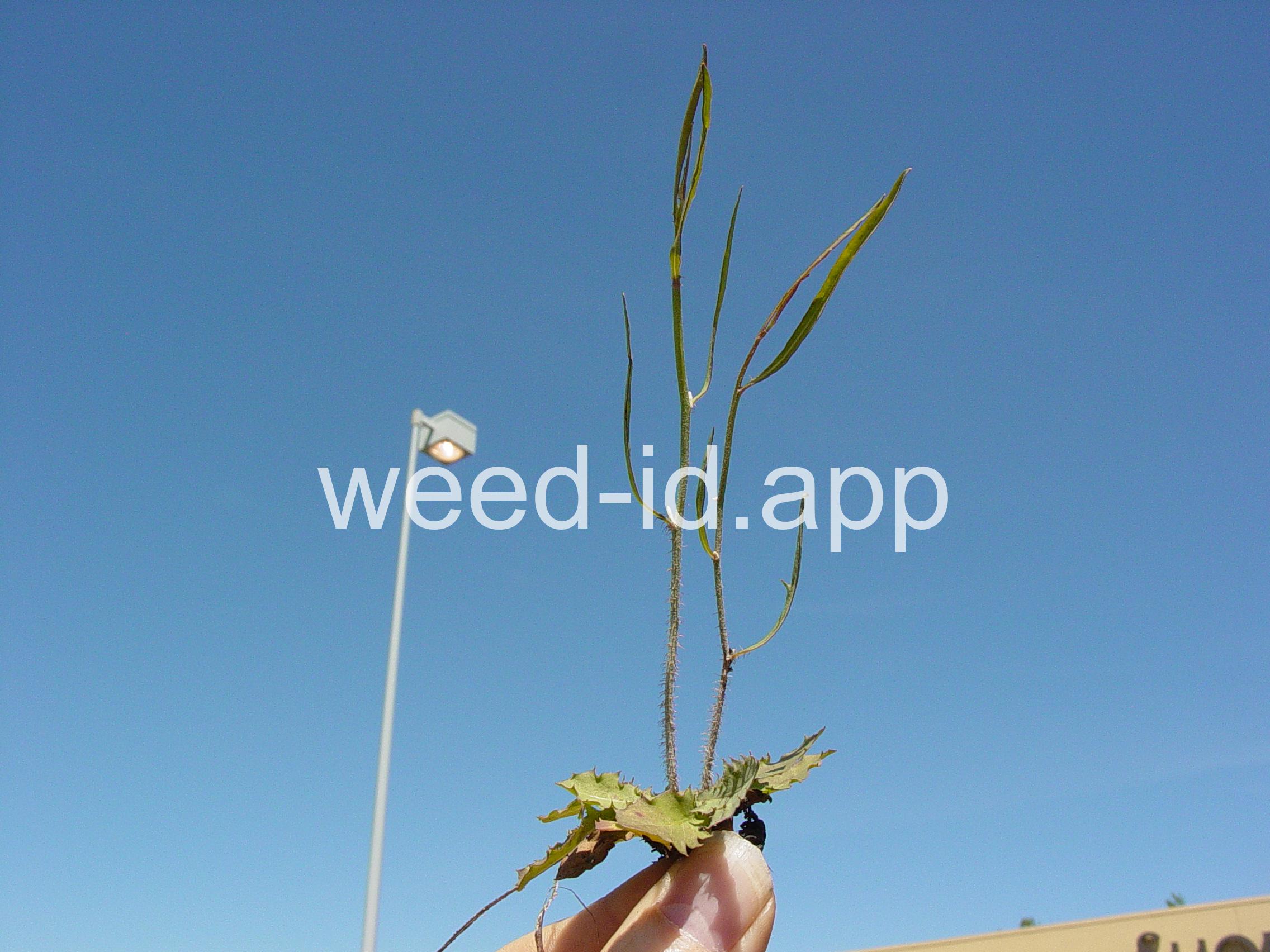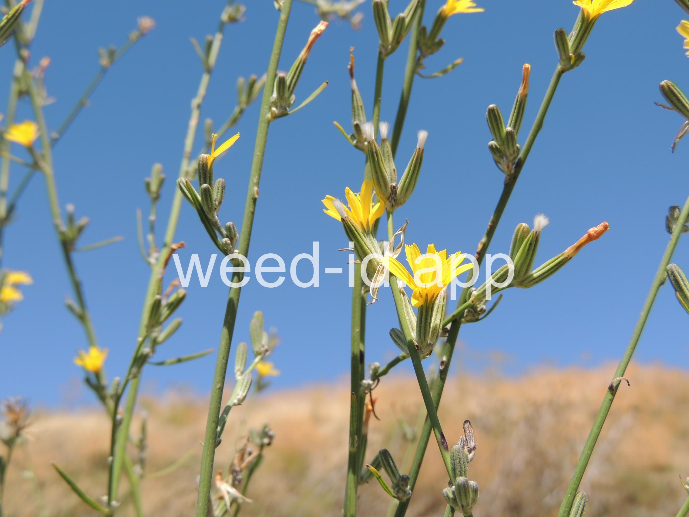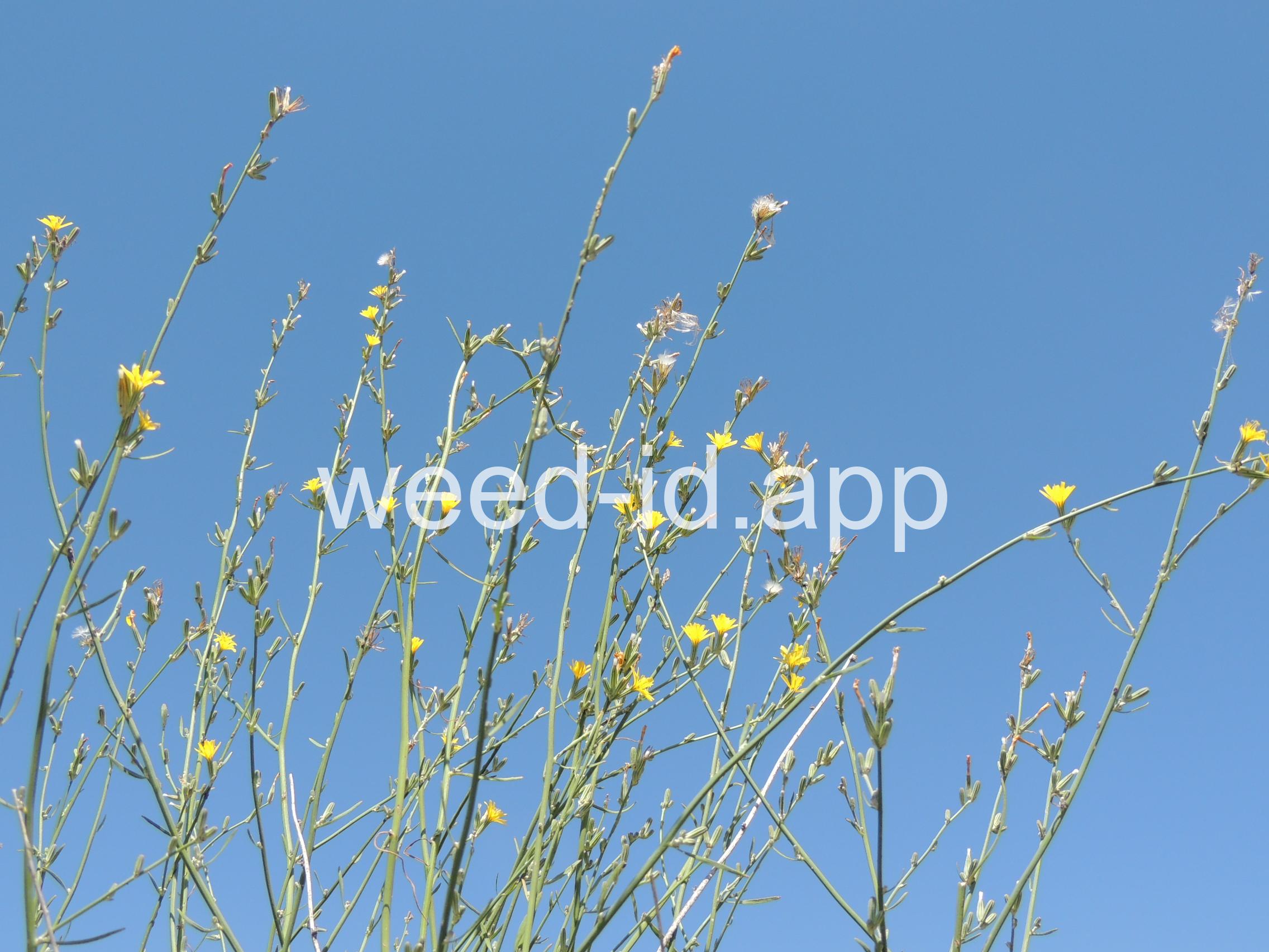 The name skeletonweed refers to the practically naked stems. The small heads generally have 10 ray flowers. The definitive characteristic for identification is the presence of reddish, down-turned hairs on the bottom 4 inches of the stem. The rosettes are indistinguishable from those of dandelion except for the rhizomes.
