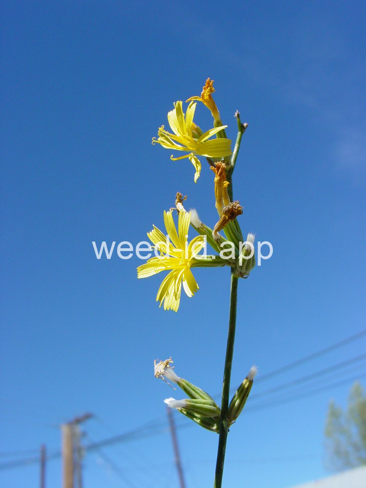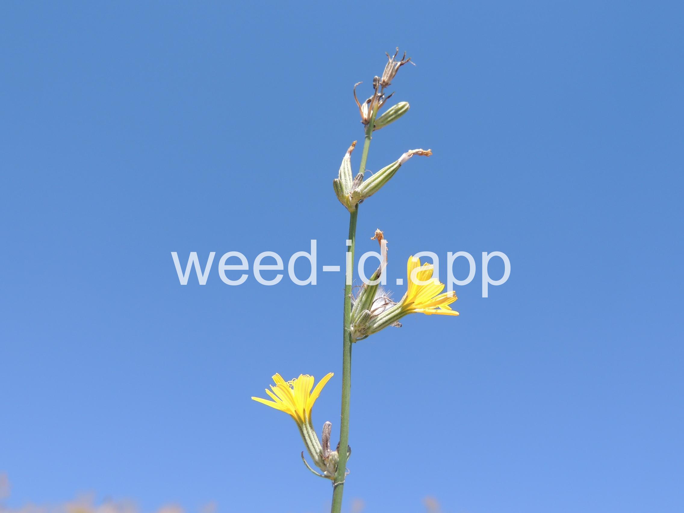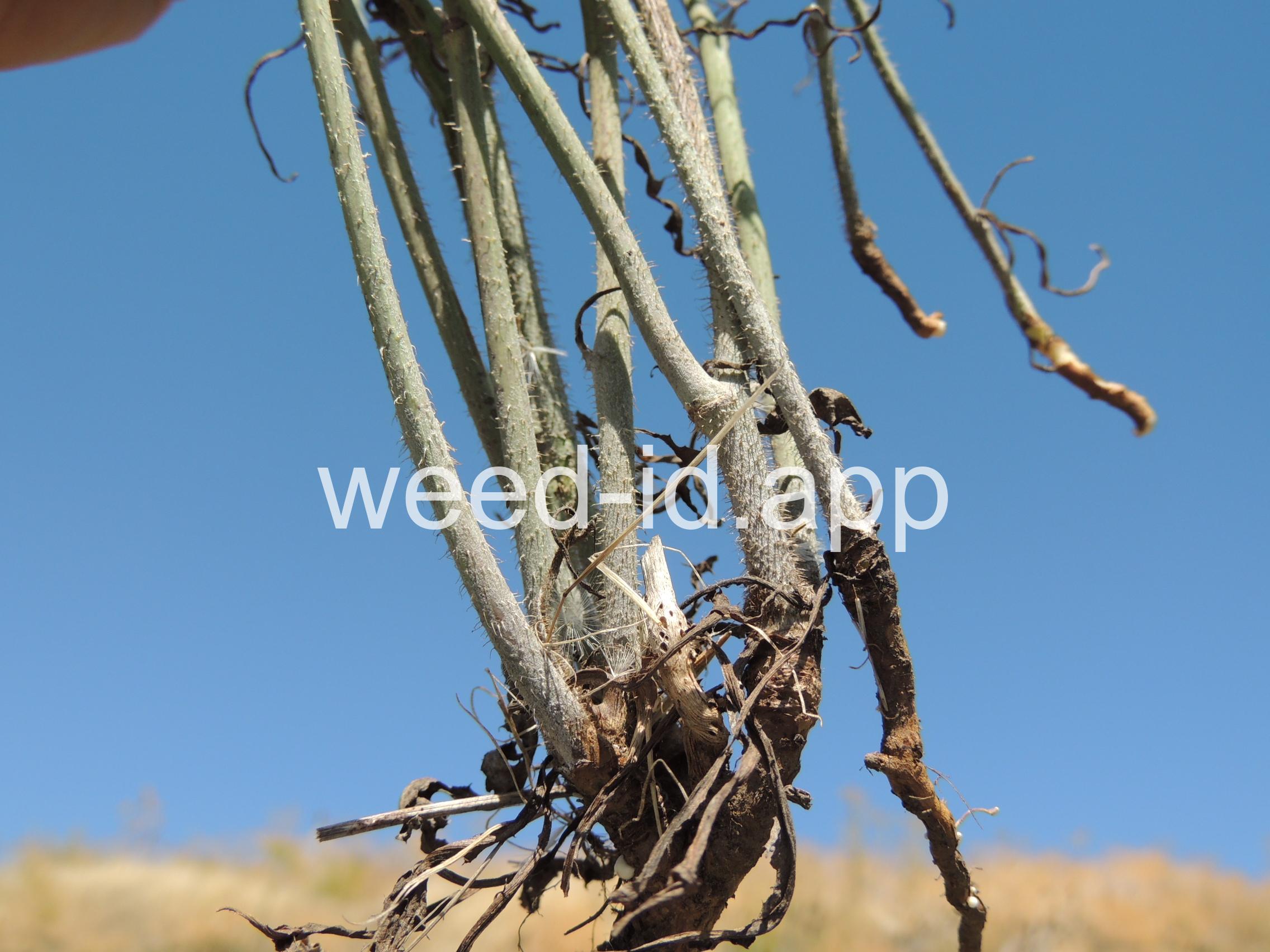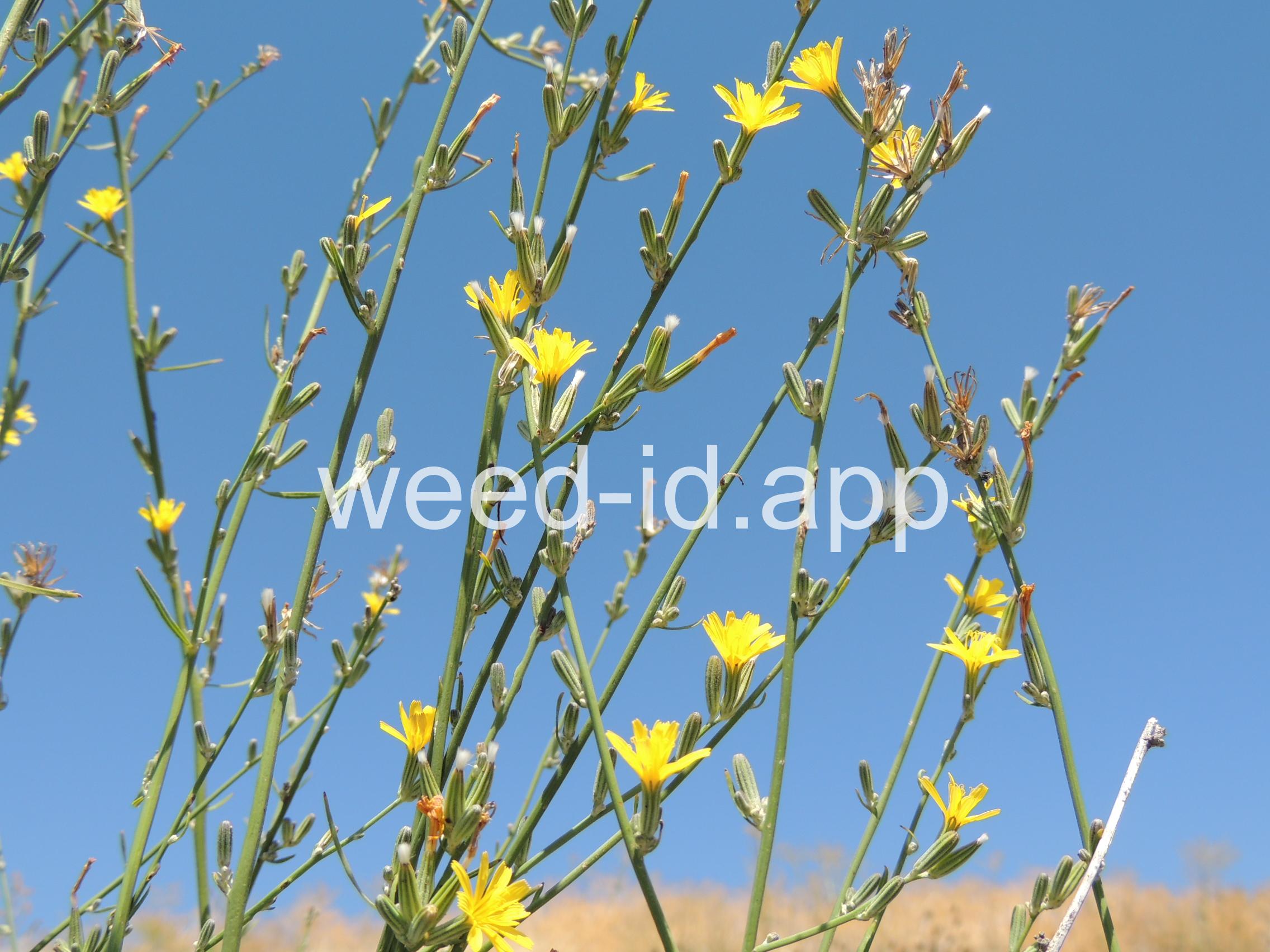 The name skeletonweed refers to the practically naked stems. The small heads generally have 10 ray flowers. The definitive characteristic for identification is the presence of reddish, down-turned hairs on the bottom 4 inches of the stem. The rosettes are indistinguishable from those of dandelion except for the rhizomes.