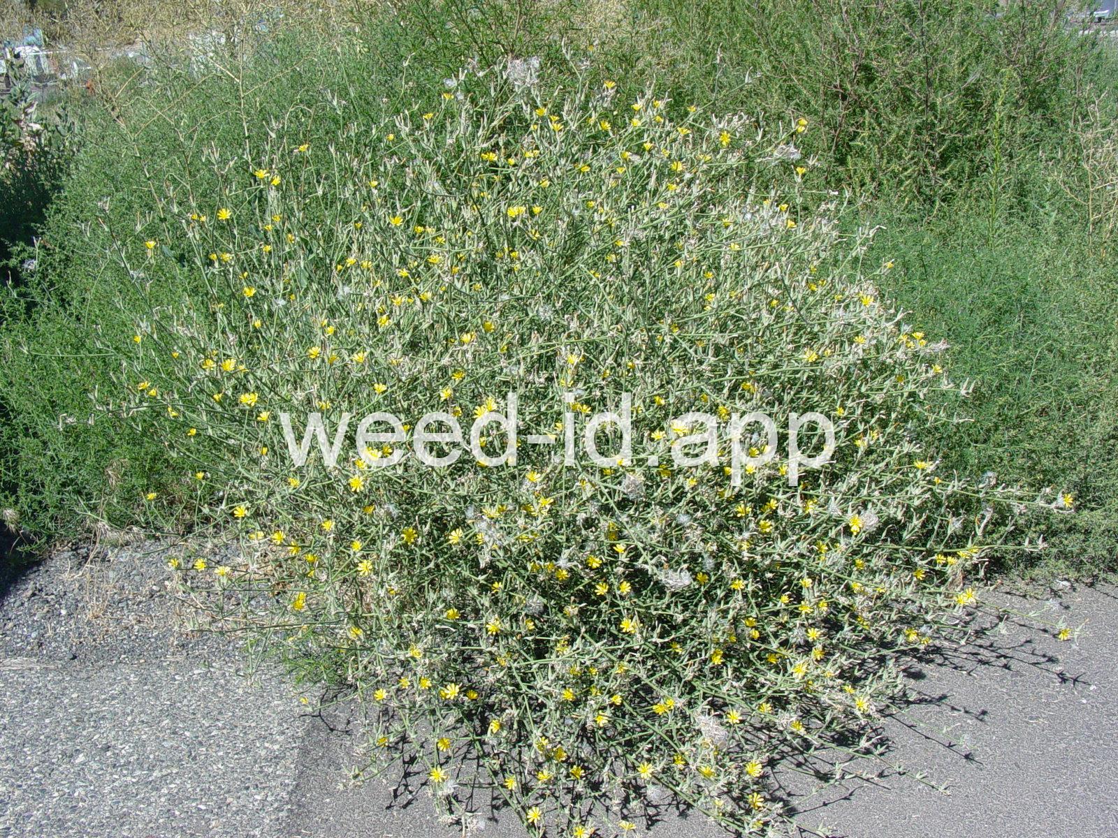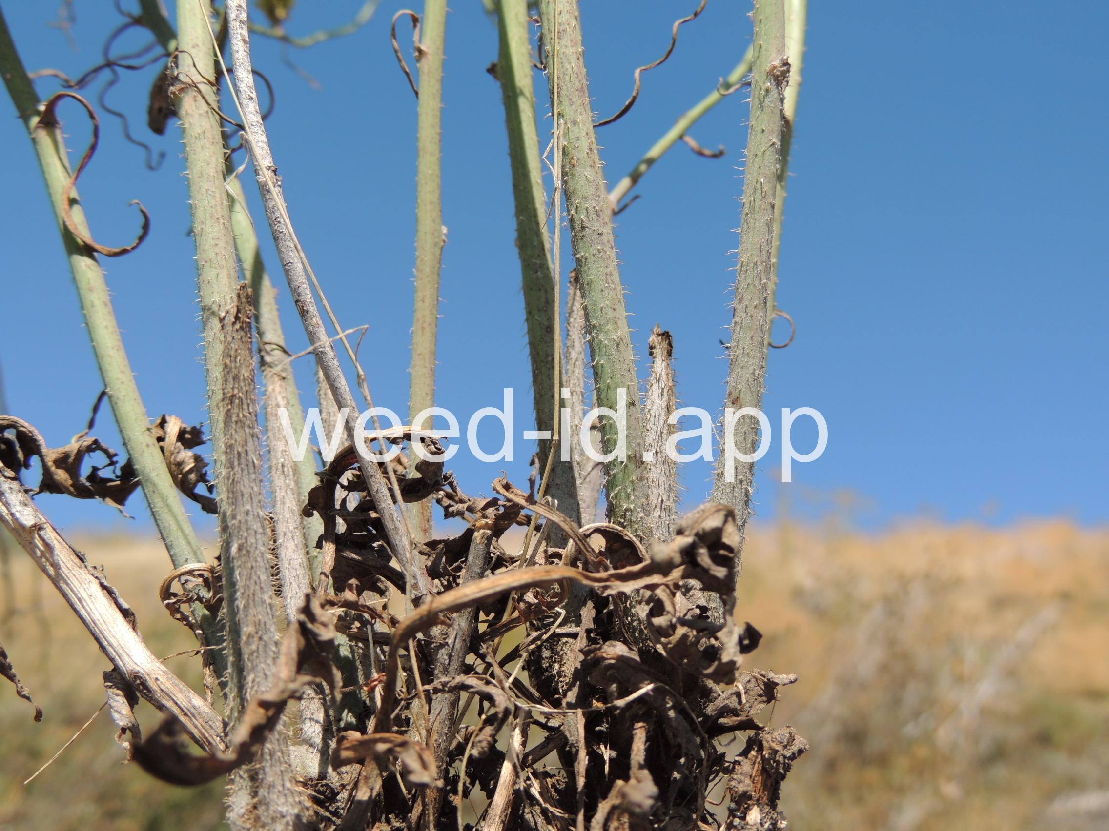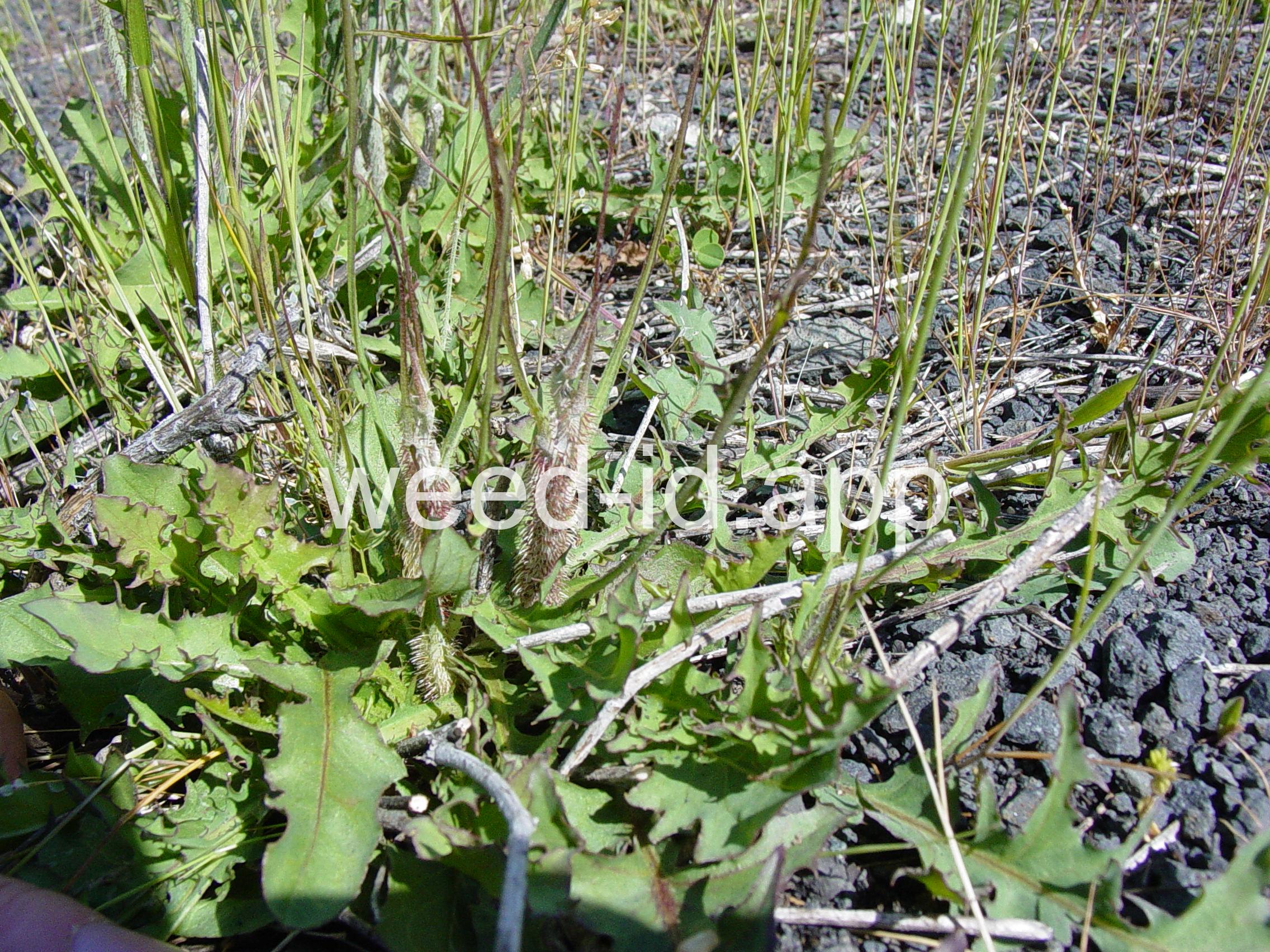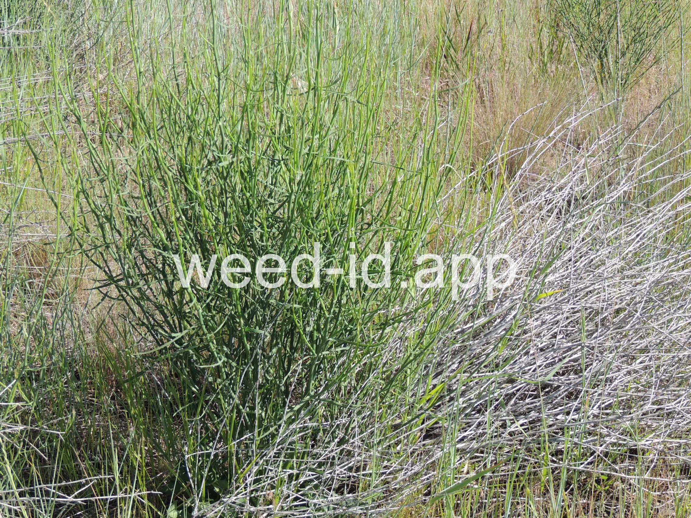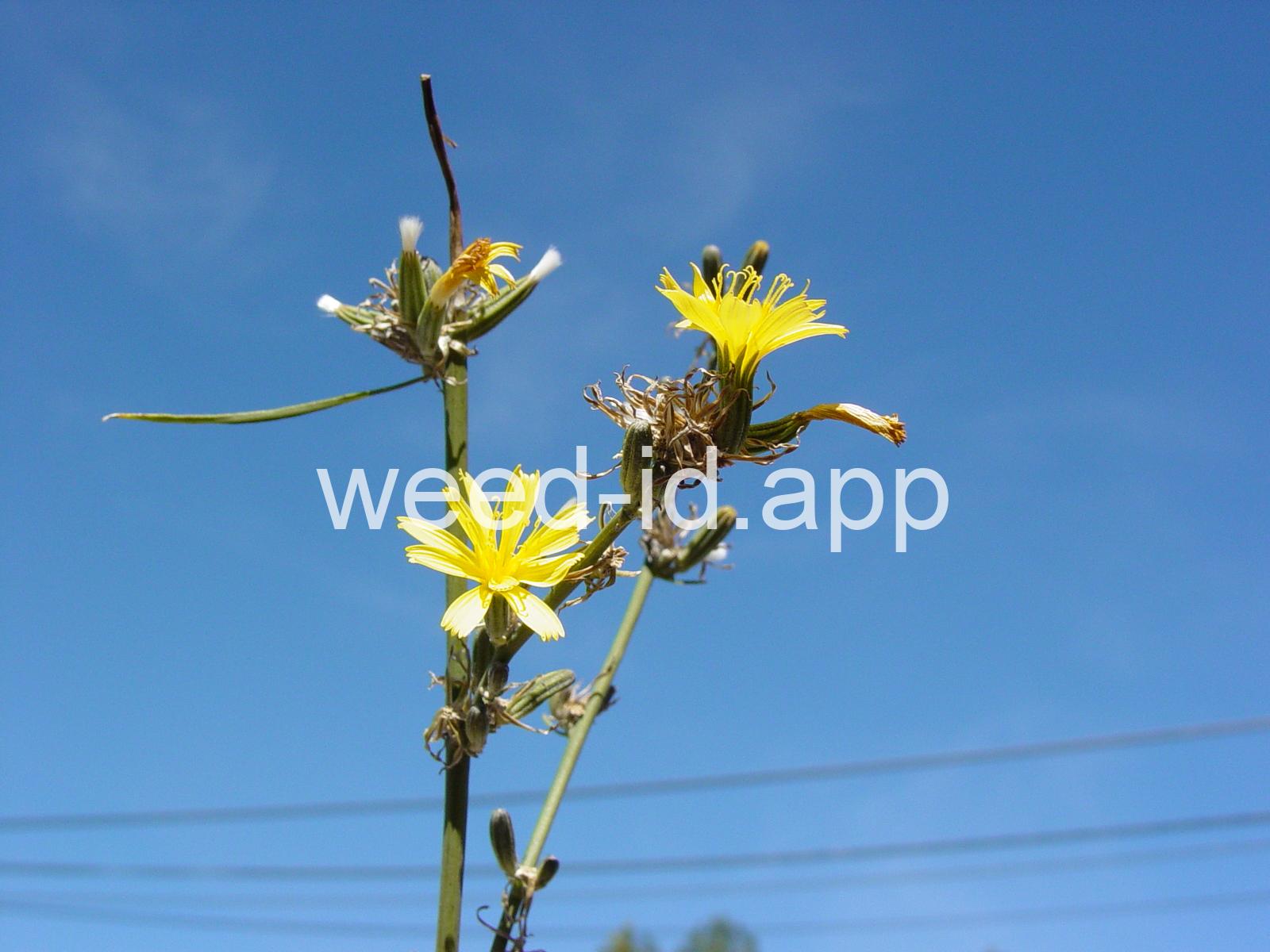 The name skeletonweed refers to the practically naked stems. The small heads generally have 10 ray flowers. The definitive characteristic for identification is the presence of reddish, down-turned hairs on the bottom 4 inches of the stem. The rosettes are indistinguishable from those of dandelion except for the rhizomes.