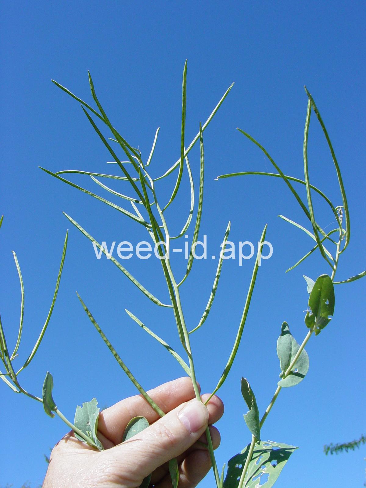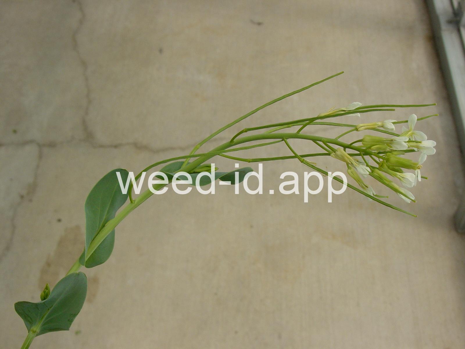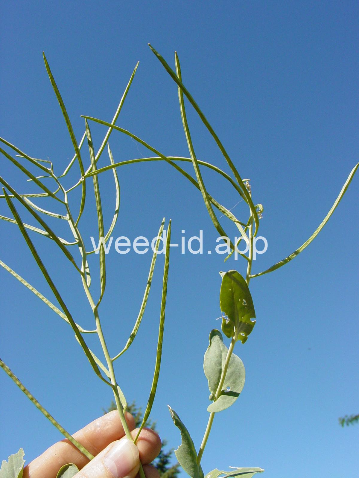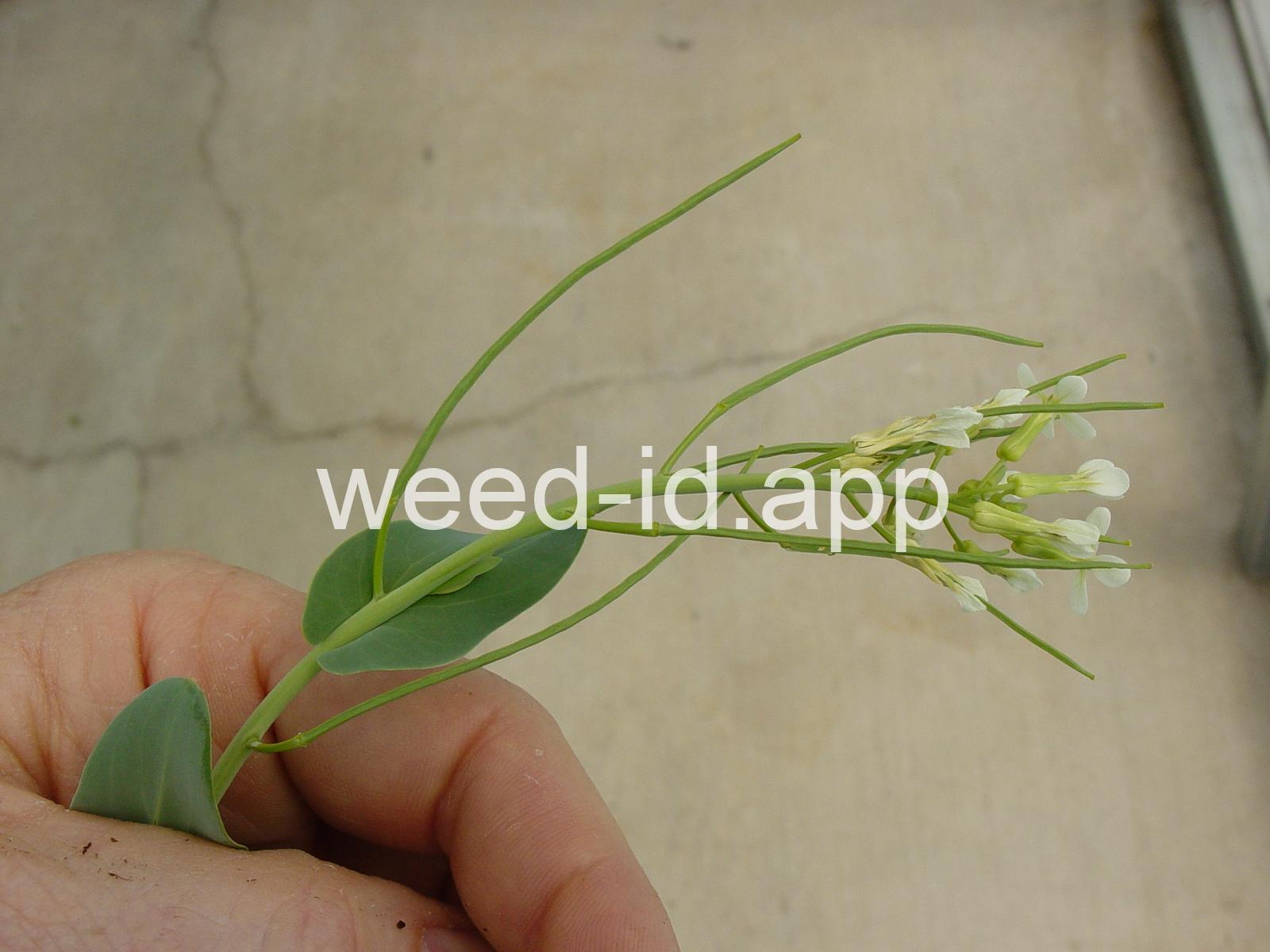 A waxy, hairless mustard with clasping stem leaves. The petals are light yellow and the fruits are 2-5 inches long but only 1-2 mm wide.