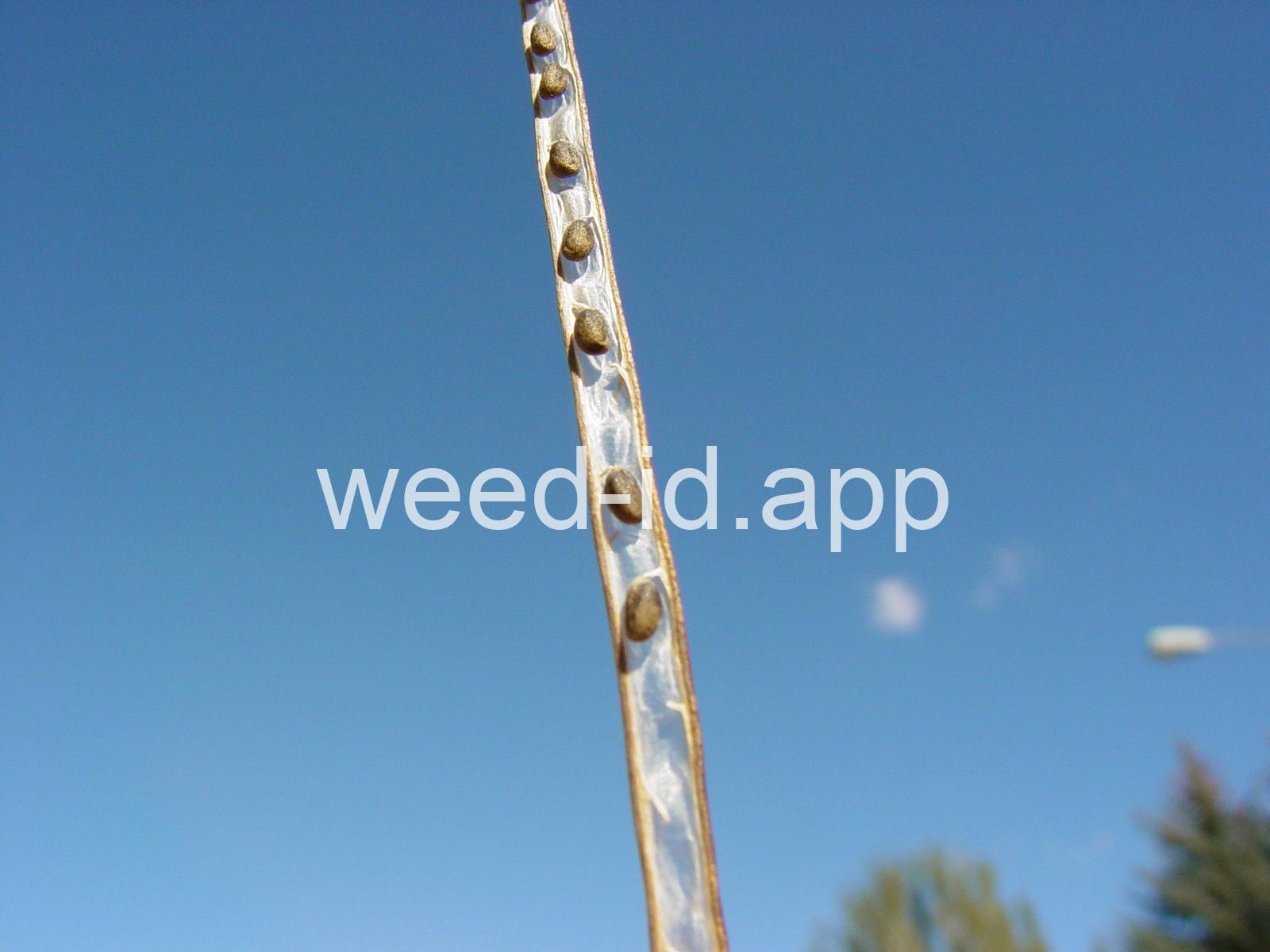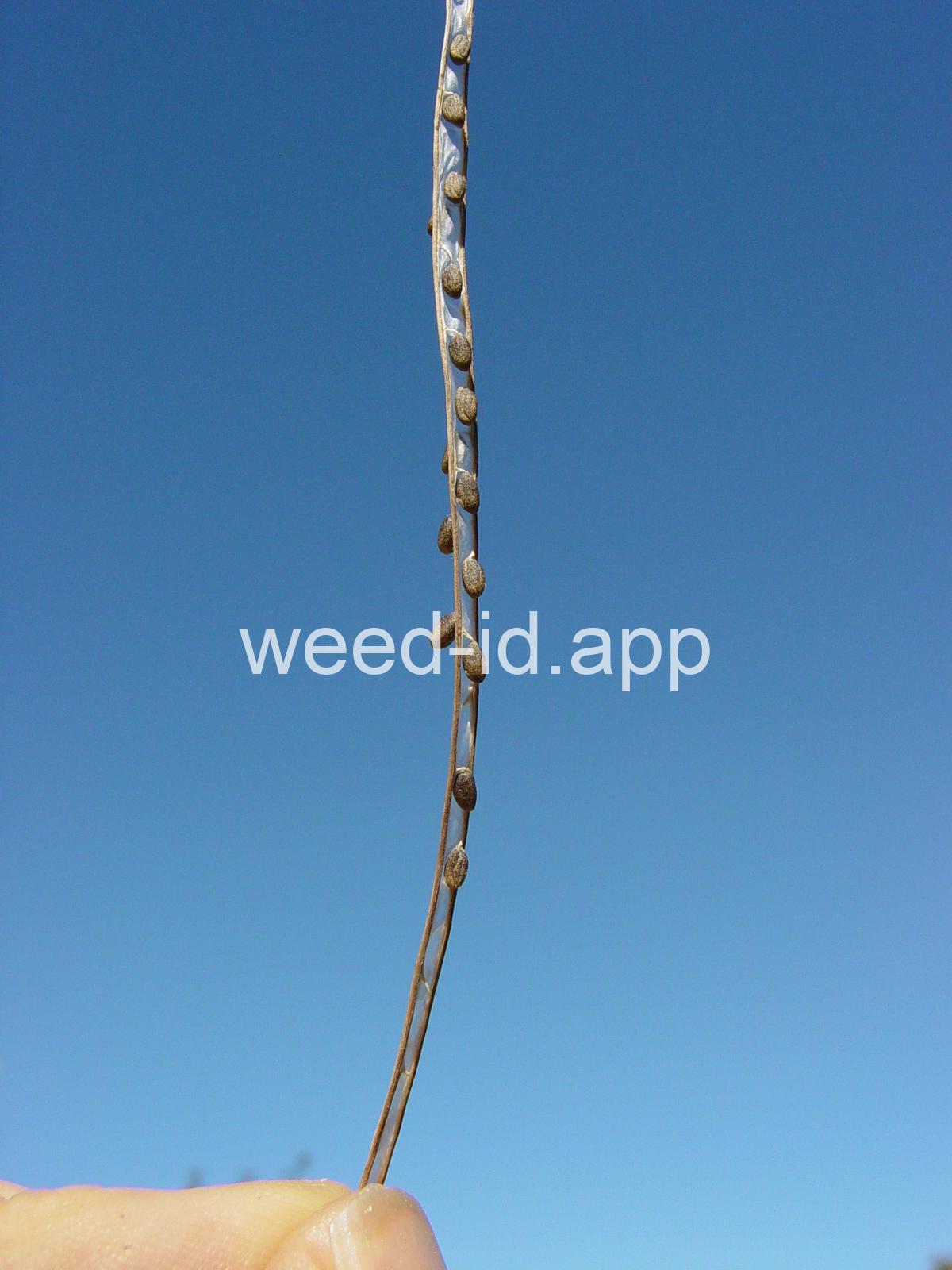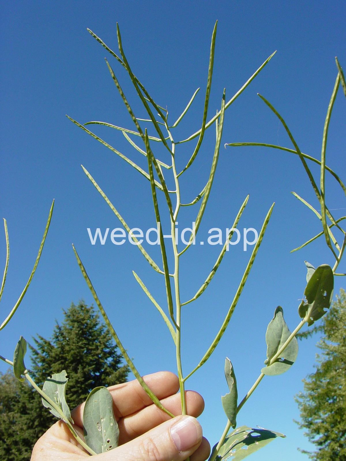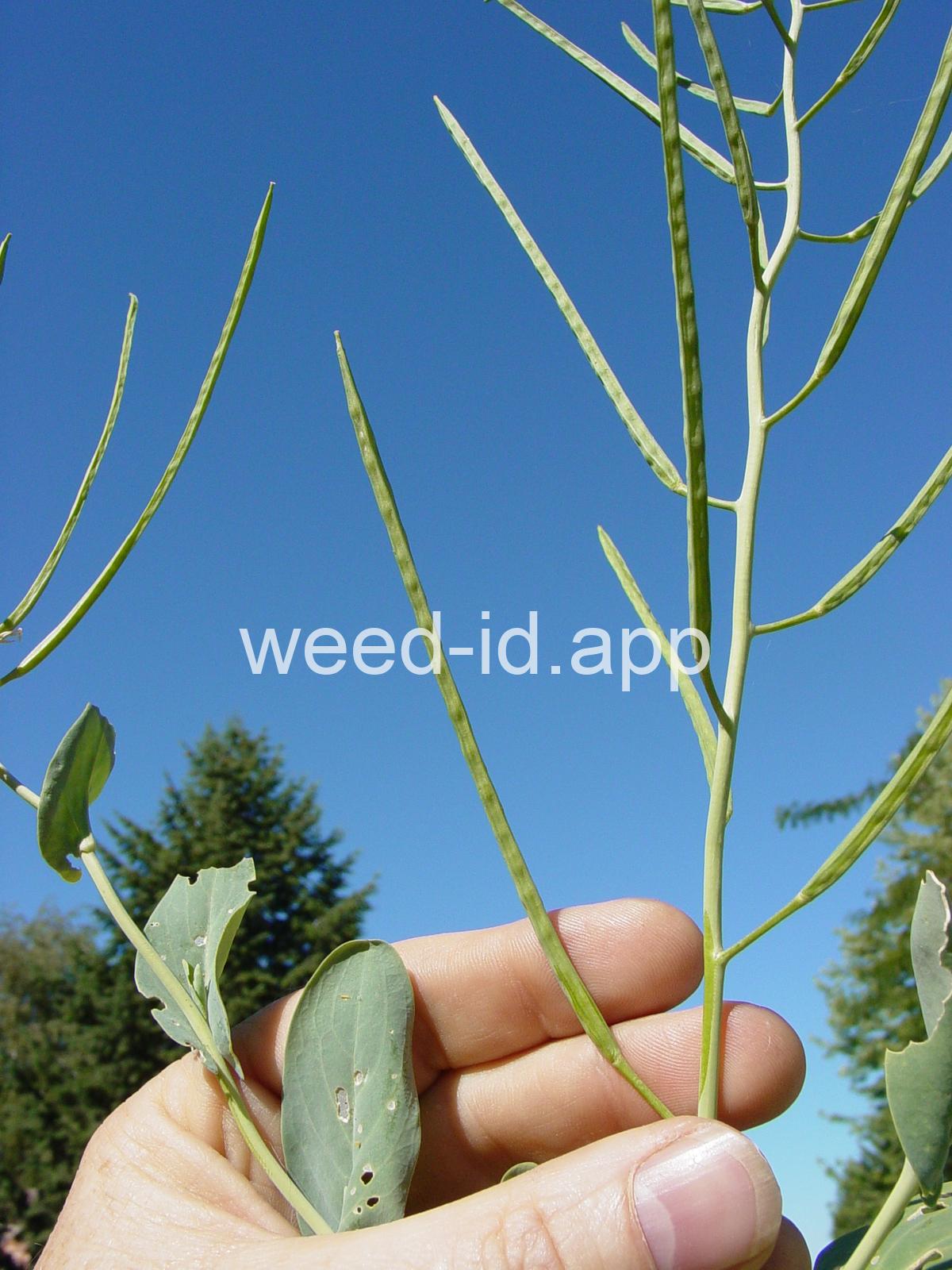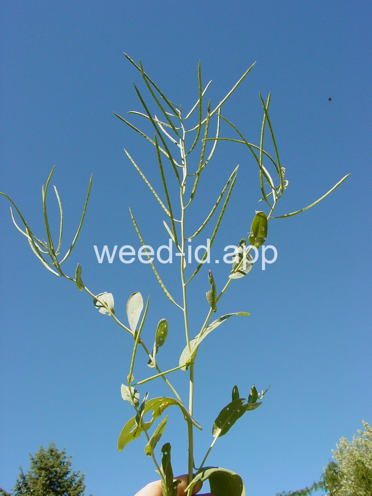 A waxy, hairless mustard with clasping stem leaves. The petals are light yellow and the fruits are 2-5 inches long but only 1-2 mm wide.
