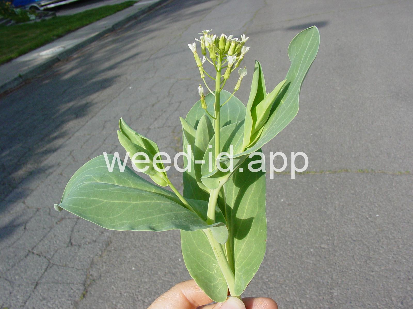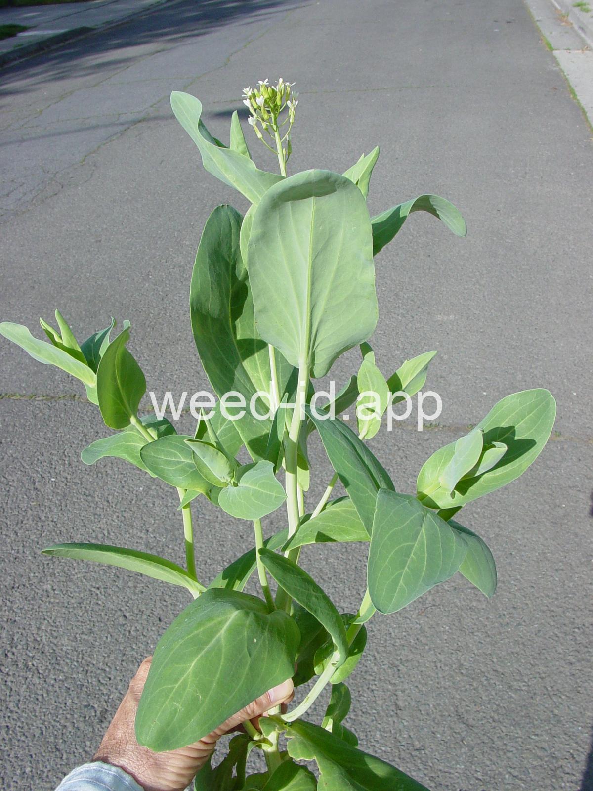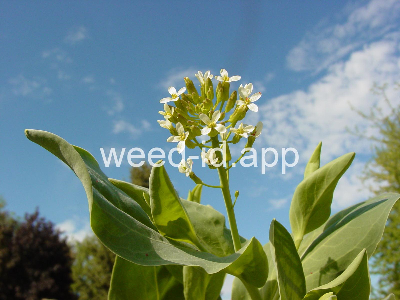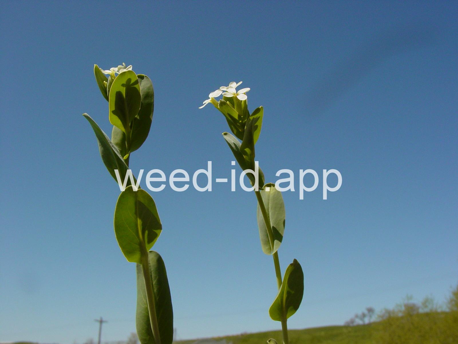 A waxy, hairless mustard with clasping stem leaves. The petals are light yellow and the fruits are 2-5 inches long but only 1-2 mm wide.