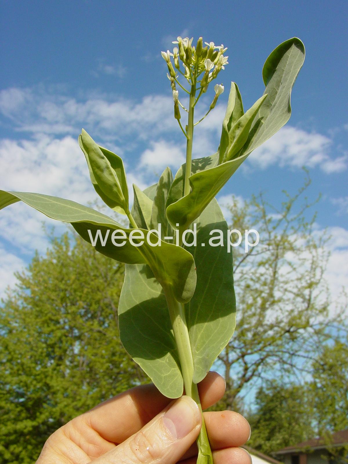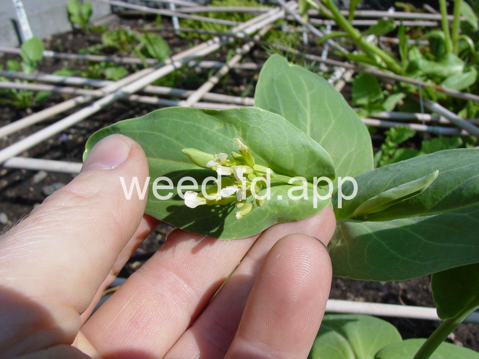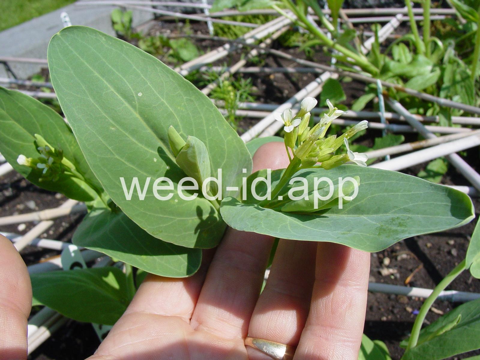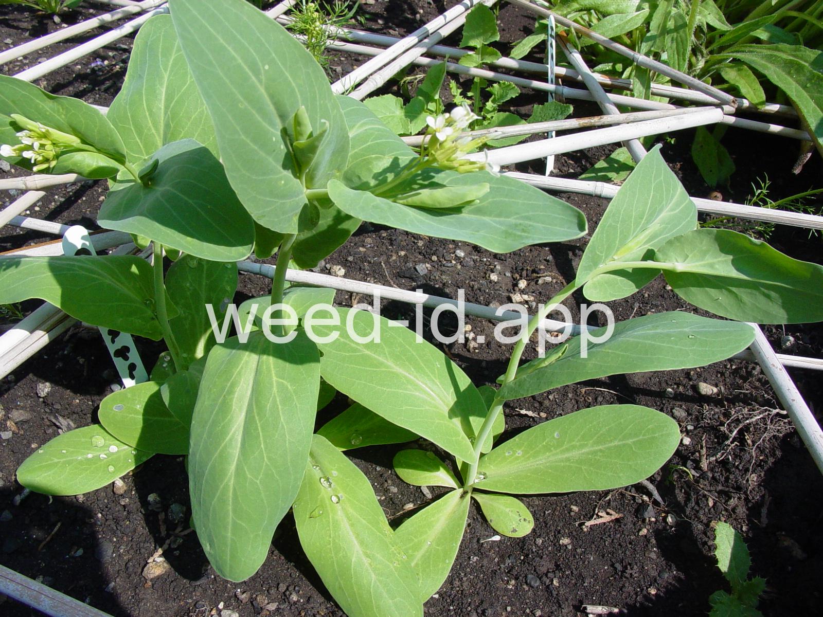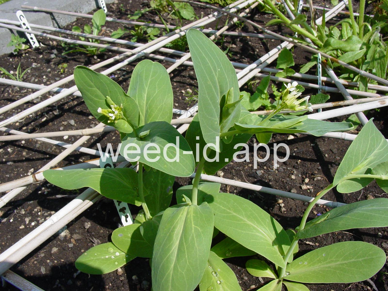 A waxy, hairless mustard with clasping stem leaves. The petals are light yellow and the fruits are 2-5 inches long but only 1-2 mm wide.