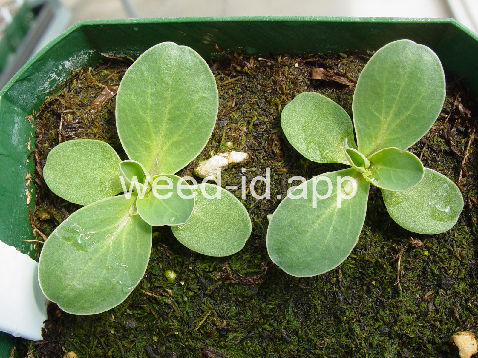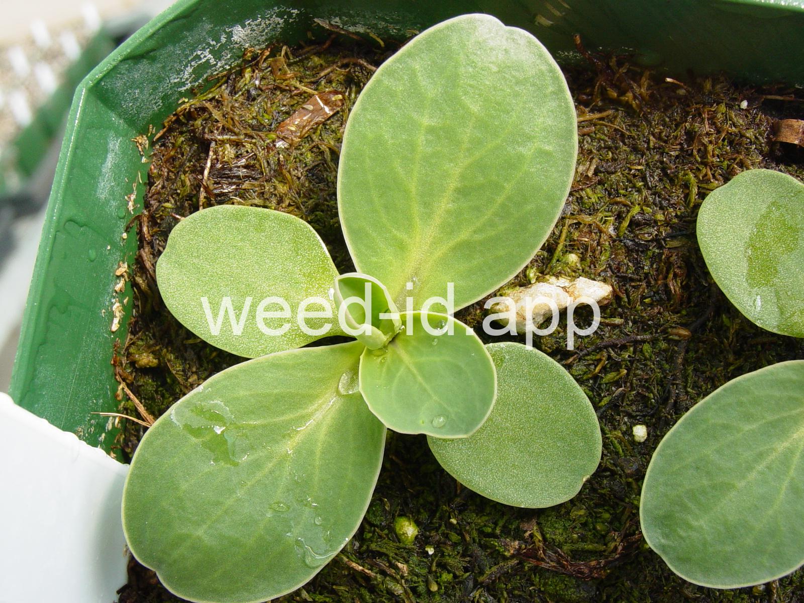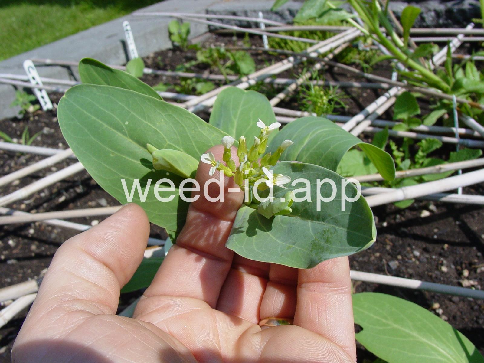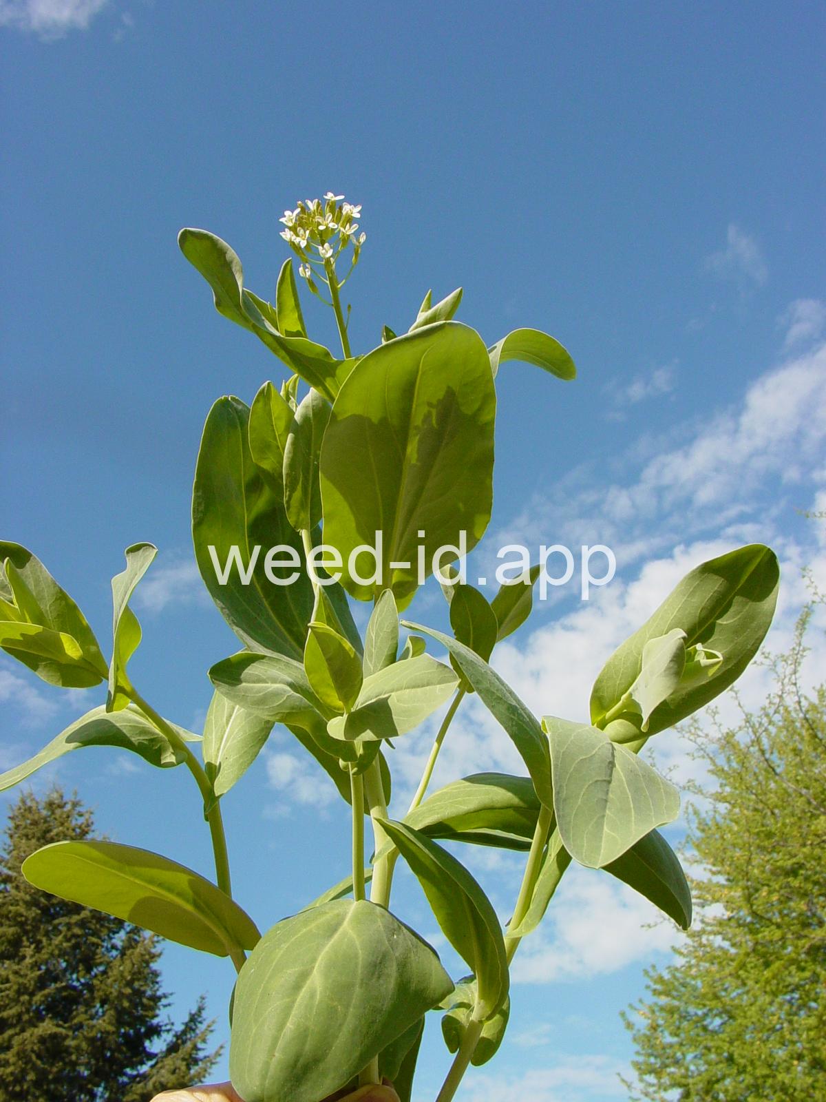 A waxy, hairless mustard with clasping stem leaves. The petals are light yellow and the fruits are 2-5 inches long but only 1-2 mm wide.