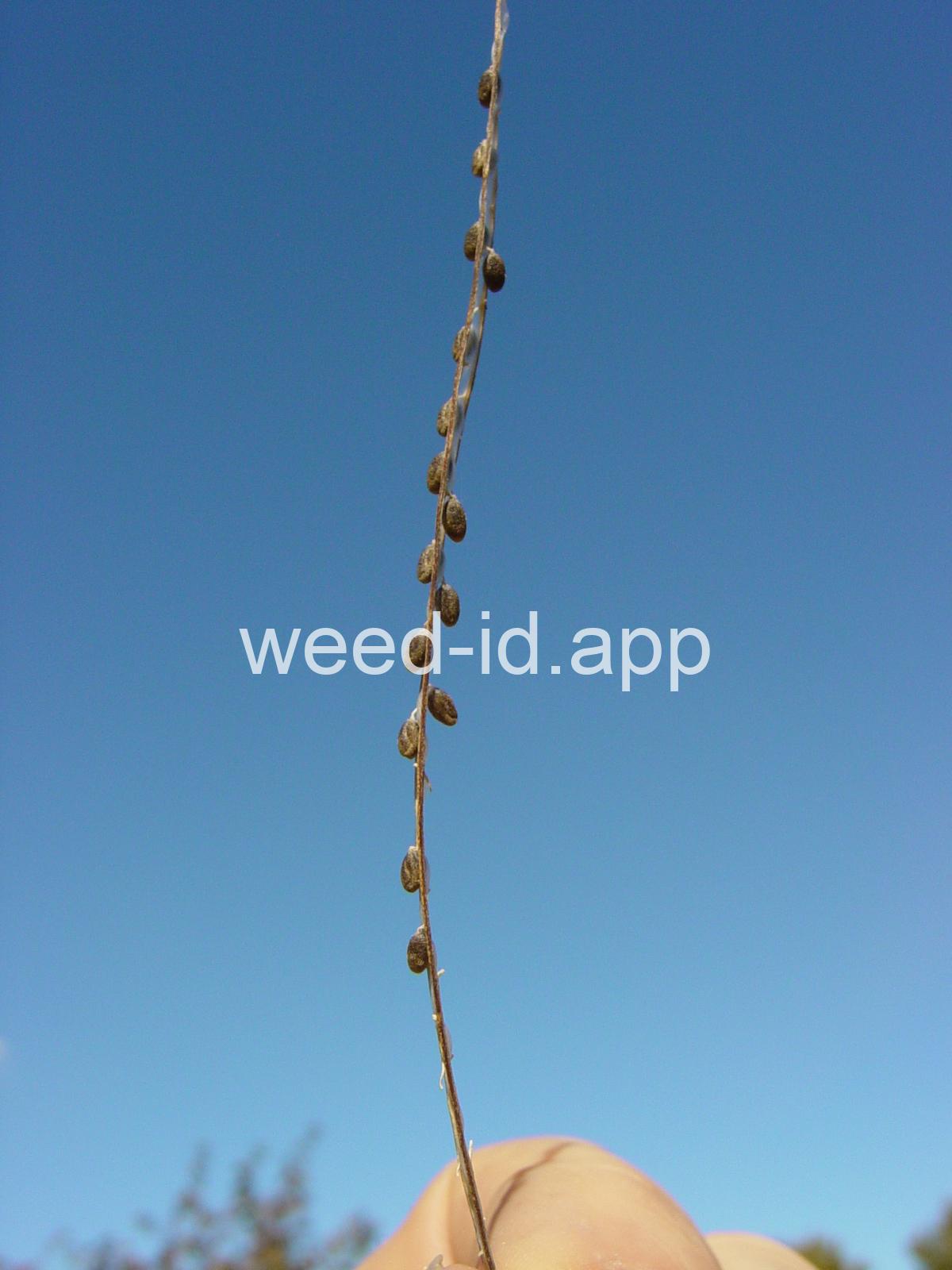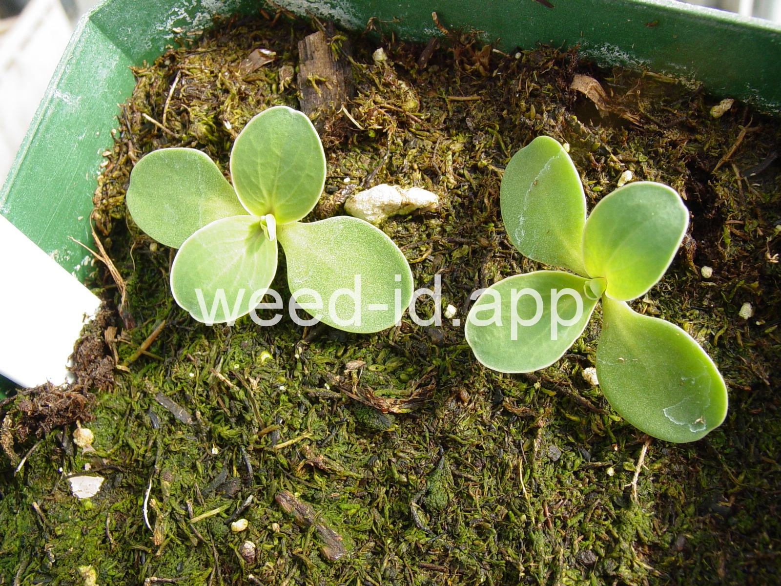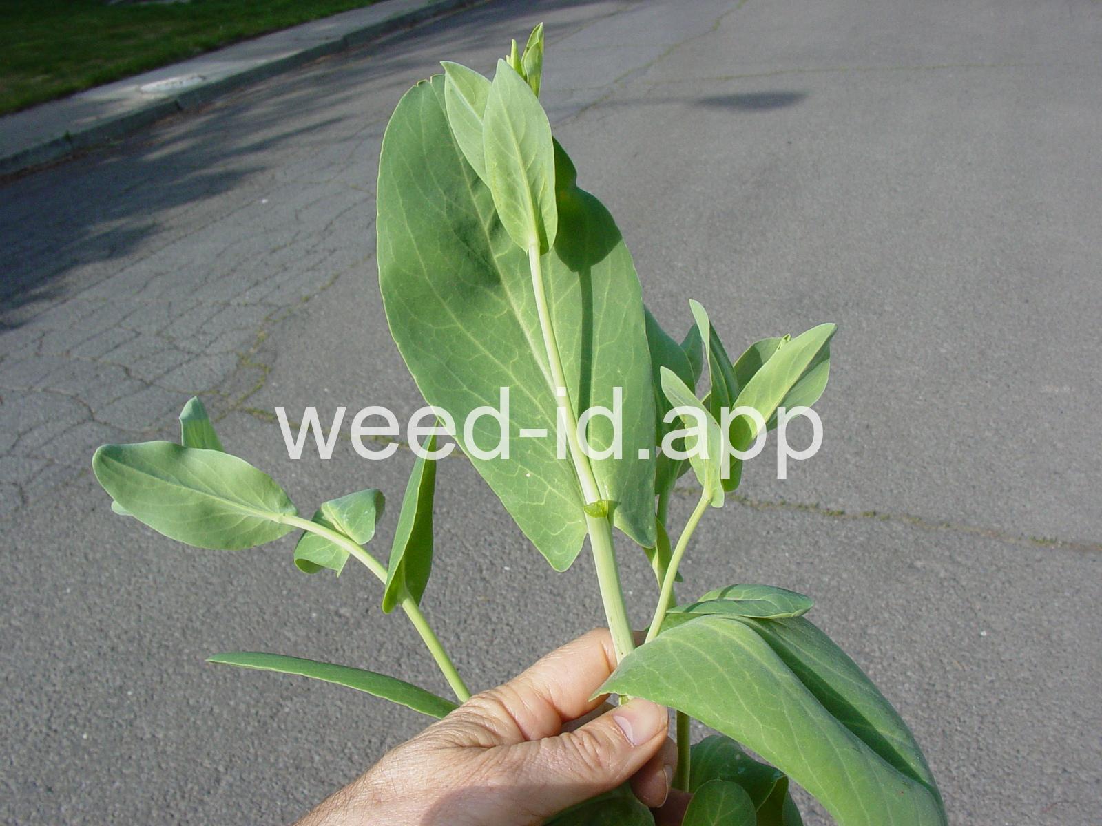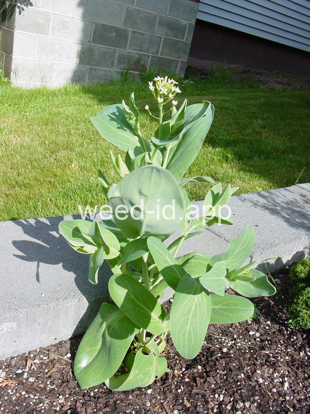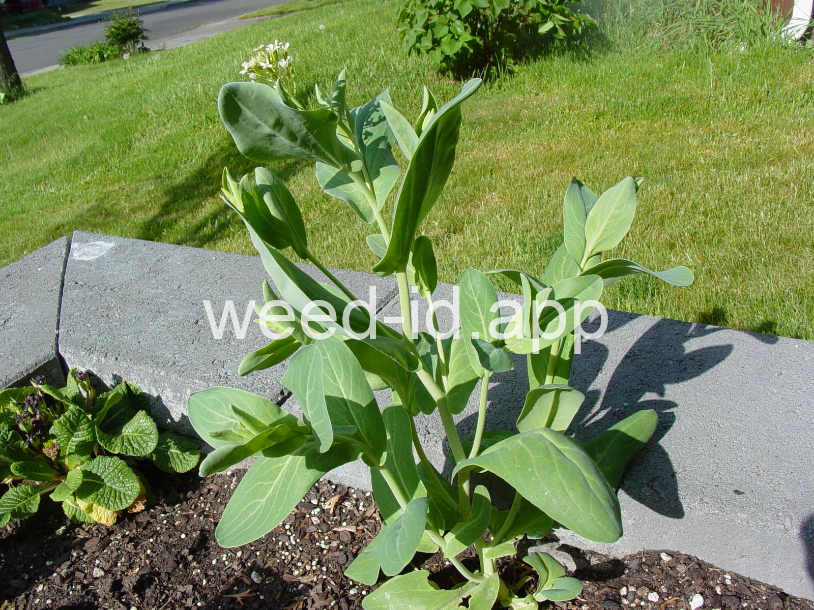 A waxy, hairless mustard with clasping stem leaves. The petals are light yellow and the fruits are 2-5 inches long but only 1-2 mm wide.