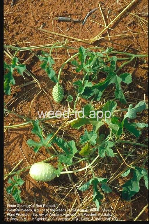 A scratchy, tendril bearing vine with palmately 3 - 5 lobed leaves. The fruits are oval, about two inches long, prickly, and terminate a curved fruit stem.