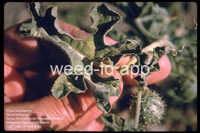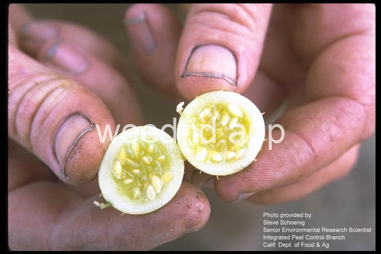 A vine with spherical spiny fruits. A relatively new introduction to California and thus not listed in most floras. This species is currently only reported for California, where it is considered noxious, and any new finds should be reported. The fruits reported to be toxic to humans.