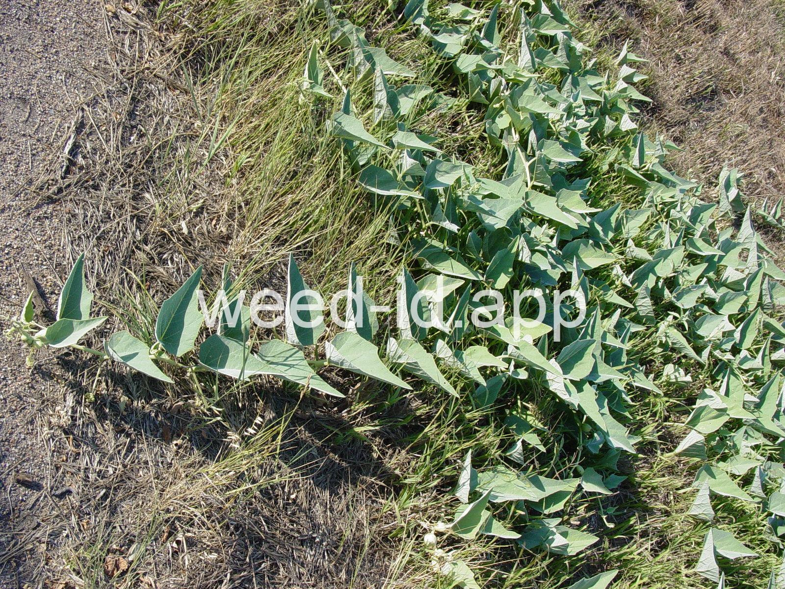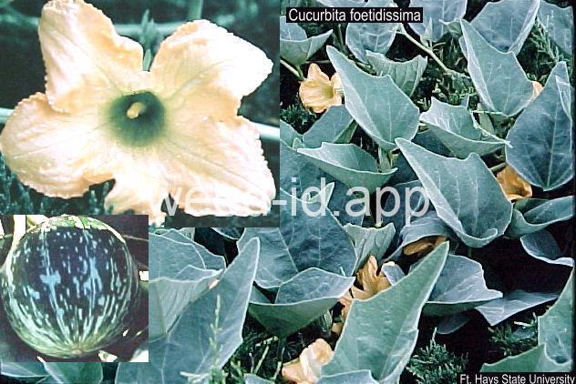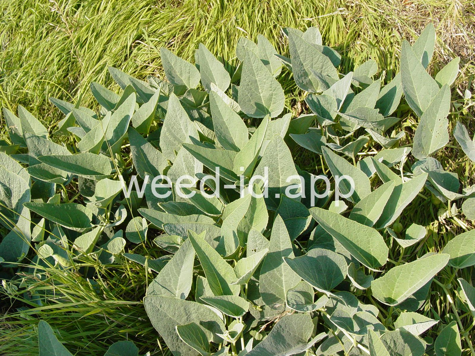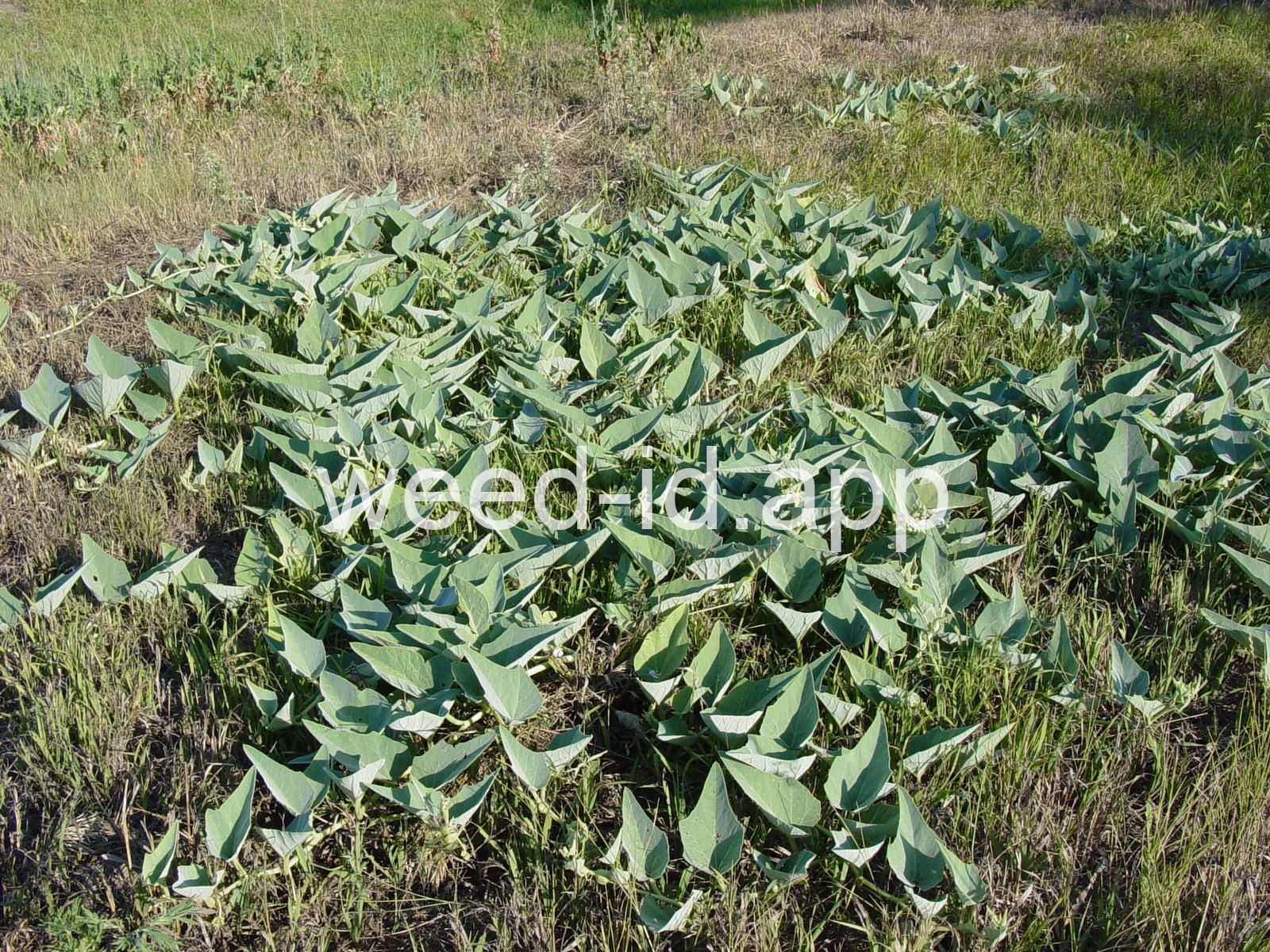 This is a native, squash-like plant with large, scabrous (scratchy), triangular, bluish-green leaves. It has a large, yellow flower which is tubular below the middle. Often found in sandy or gravelly soils.