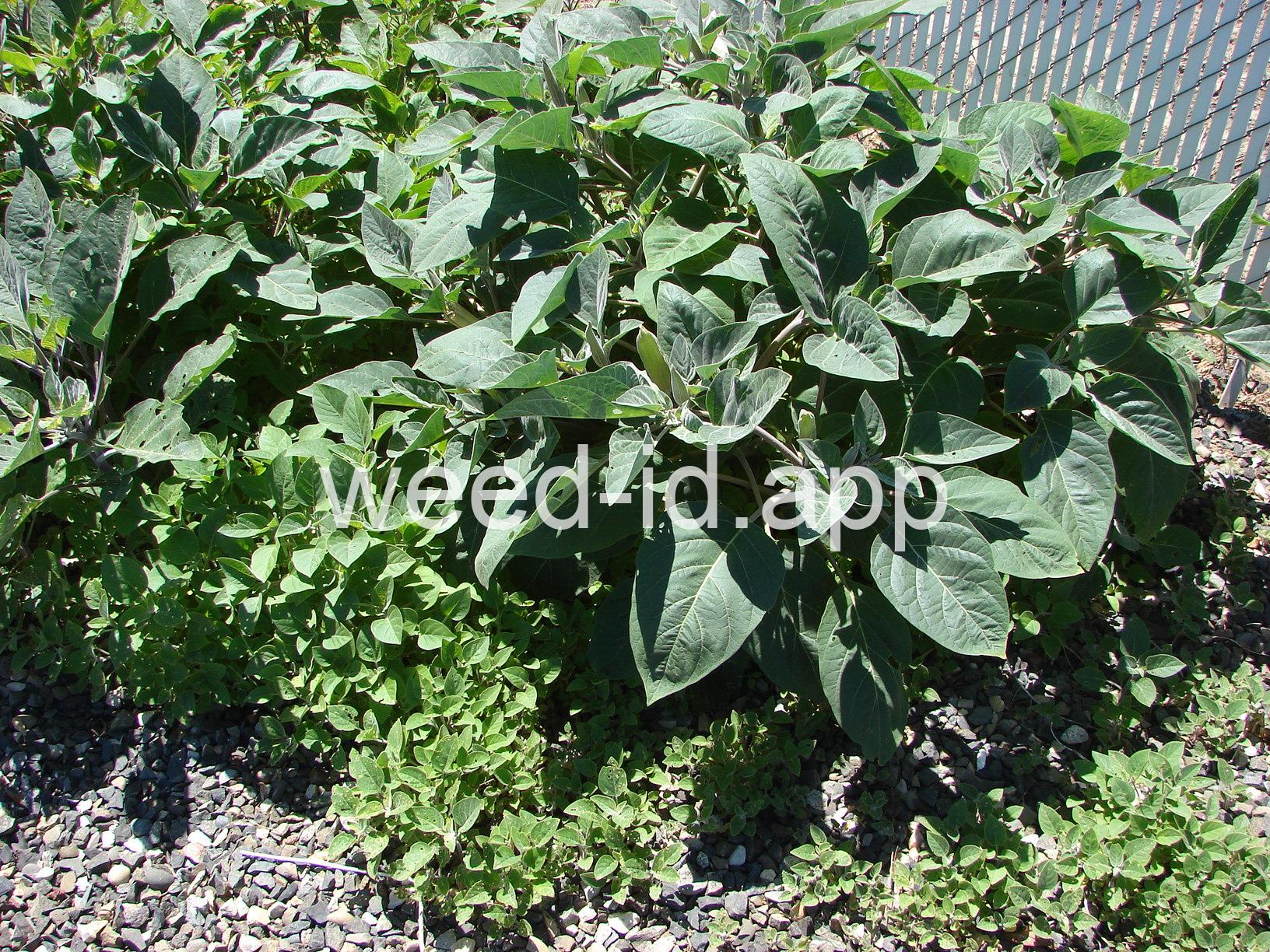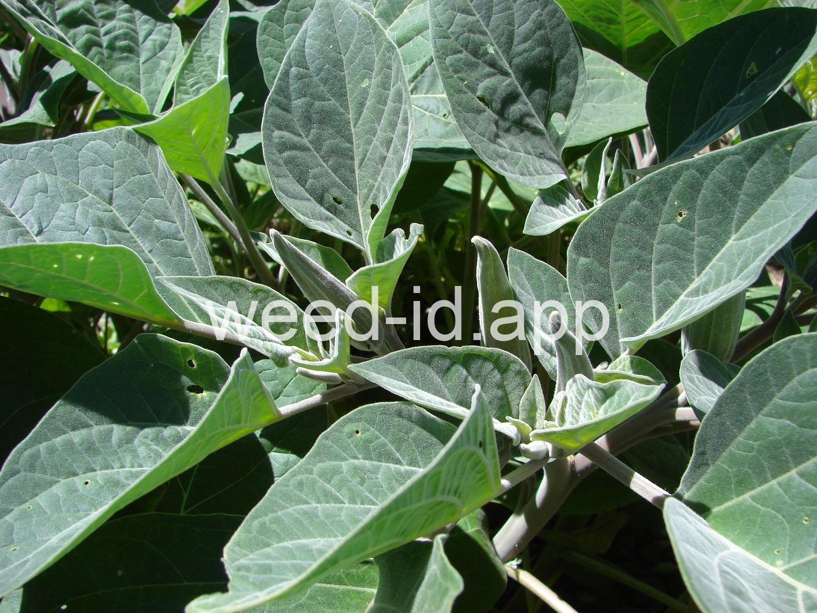 The very large (15-20 cm), trumpet-shaped white flowers are the reason this plant is often grown as an ornamental. As with many species in the nightshade family, the fruits are highly toxic. The large, spherical fruits are formed in the leaf axils and are nodding at maturity.