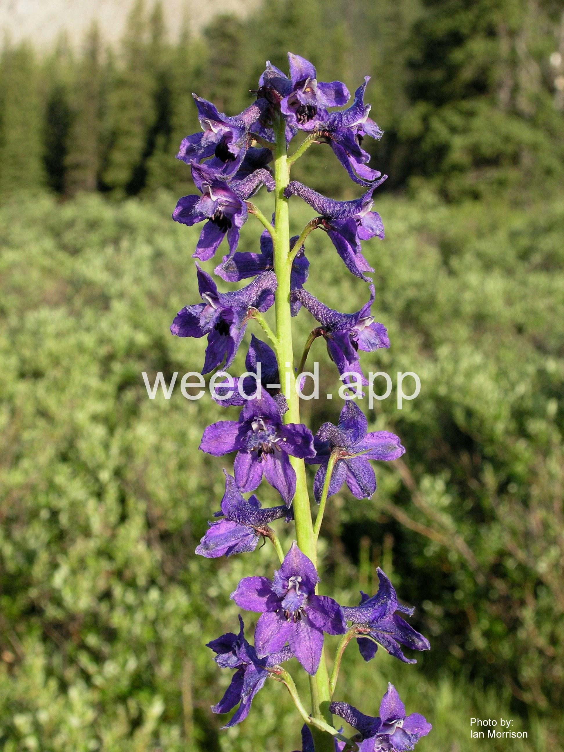 Weeds of Alberta refers to this species as `tall larkspur` but WSSA uses that name to refer to the very similar species, Delphinium barbeyi, which occurs in the Rocky Mountains from Wyoming southward. It is also similar to Delphinium occidentale but can be distinguished from both these species by the fact that its fruits are totally hairless.