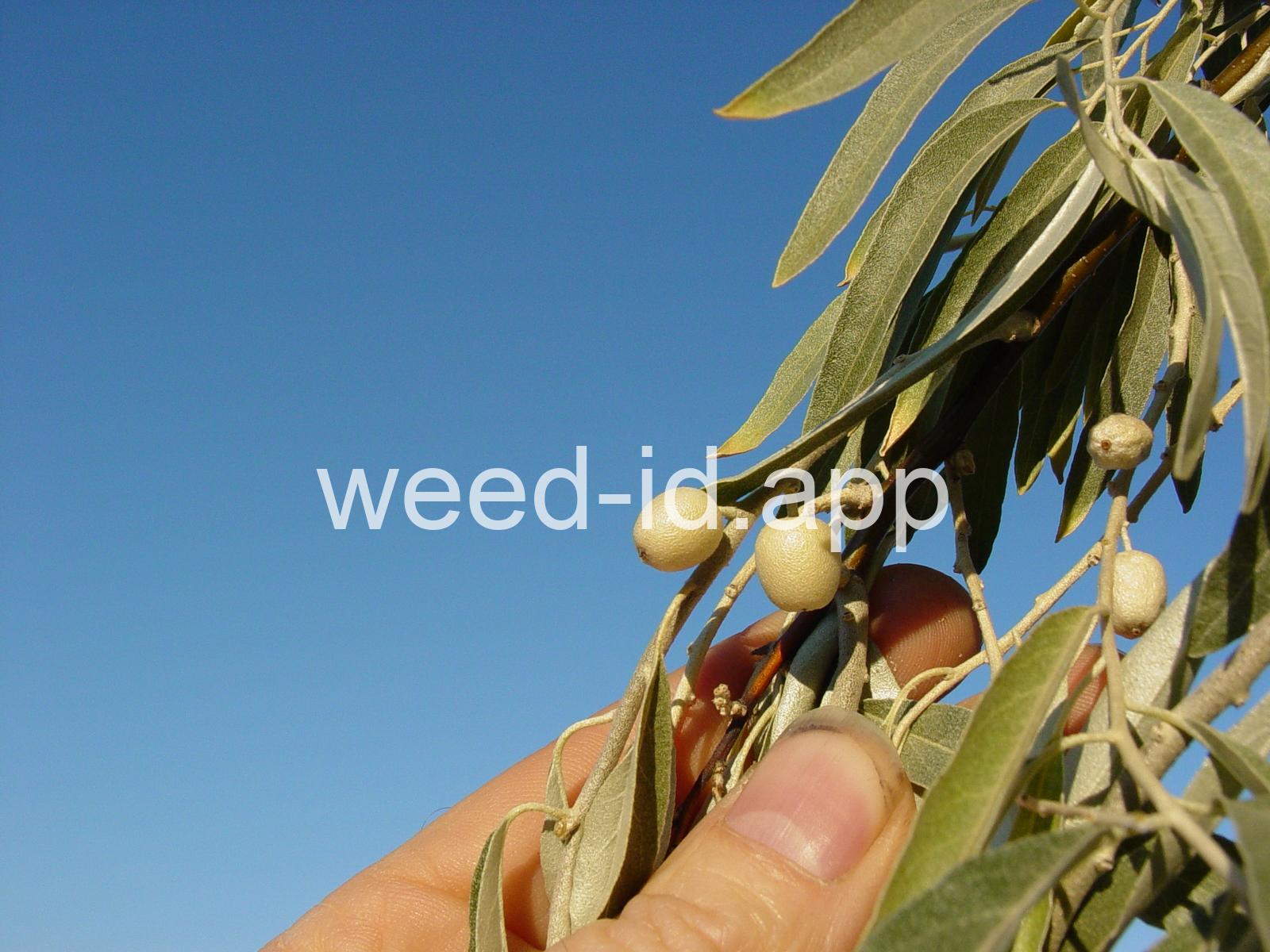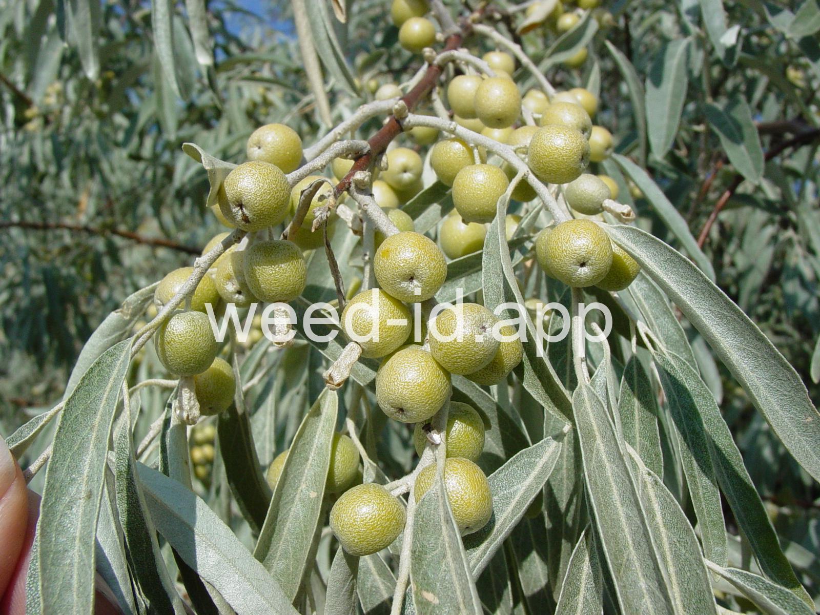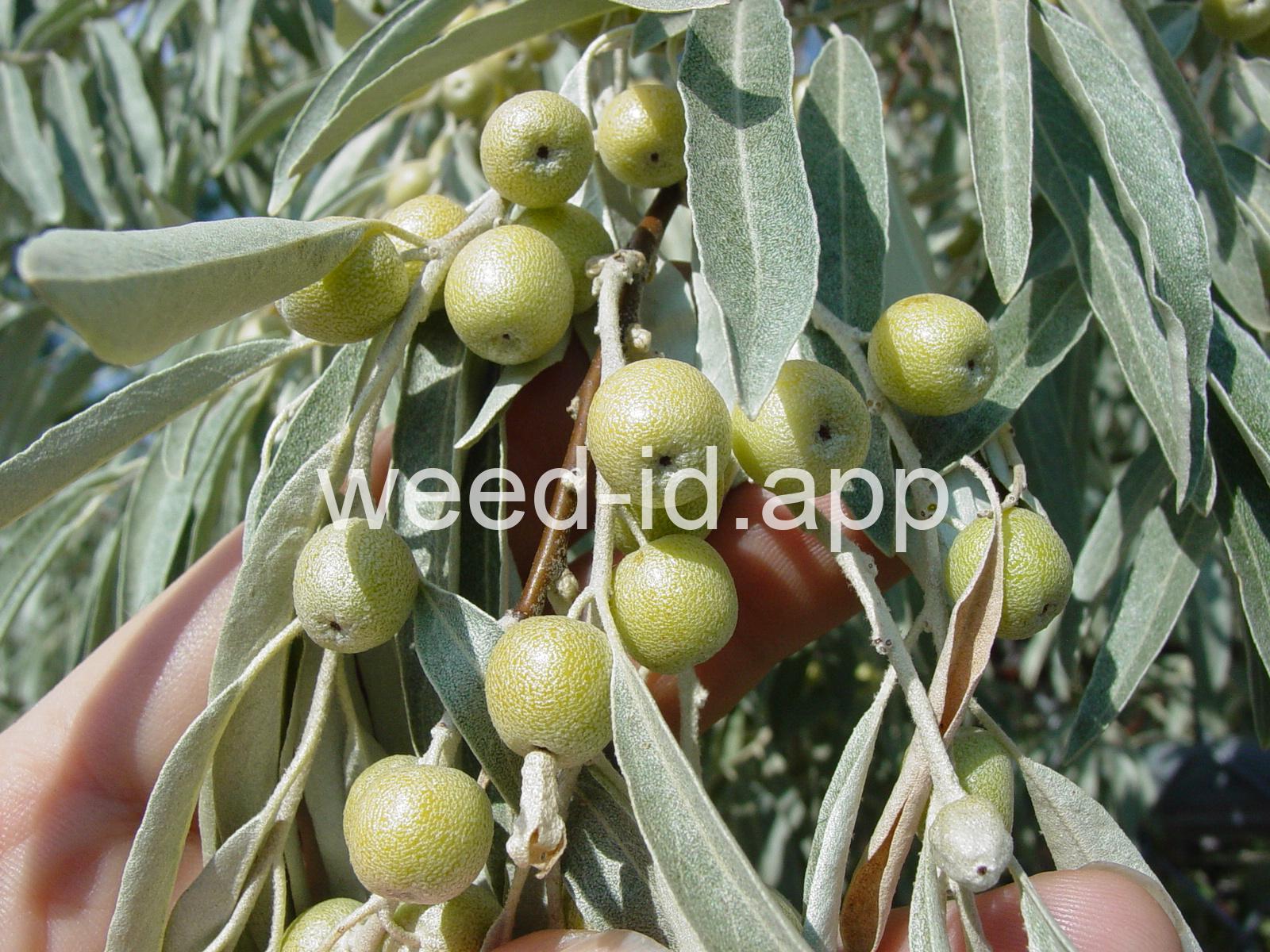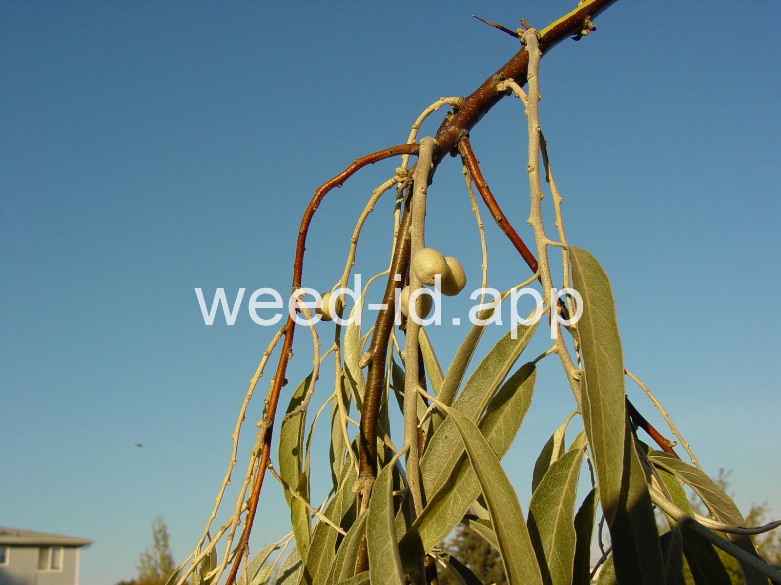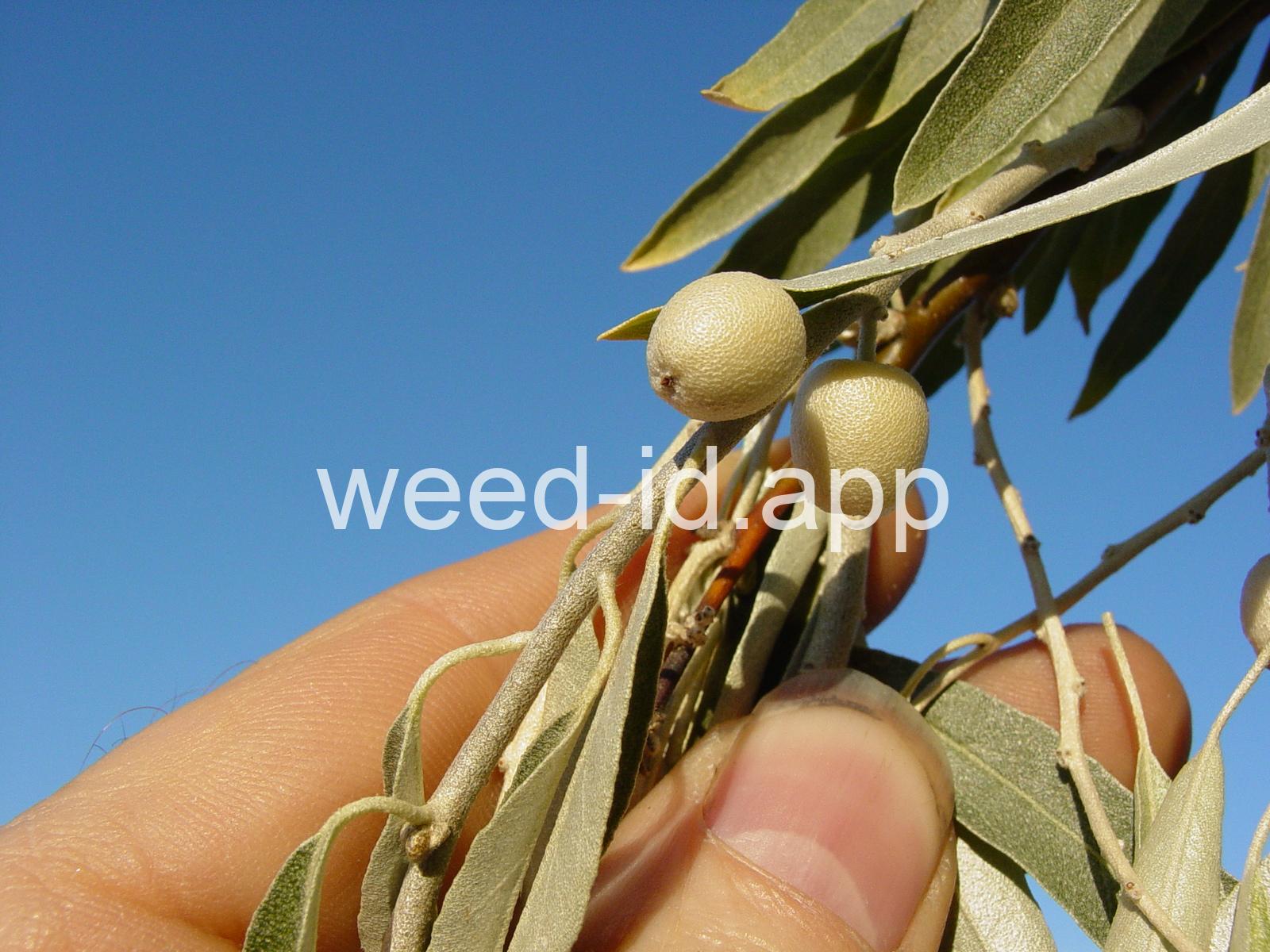 A small tree with wide, spreading branches and silvery leaves. The branchlets are spine tipped, and the leaves are covered with disk-shaped hairs with a central attachment (magnification is needed to see this distinctive feature). The fruit is a small, round, yellow to silvery berry with a single, large stone and granular pulp. This species prefers sub-irrigated sites, often in alkaline or saline soils. Despite its weedy nature, it has been extensively planted.