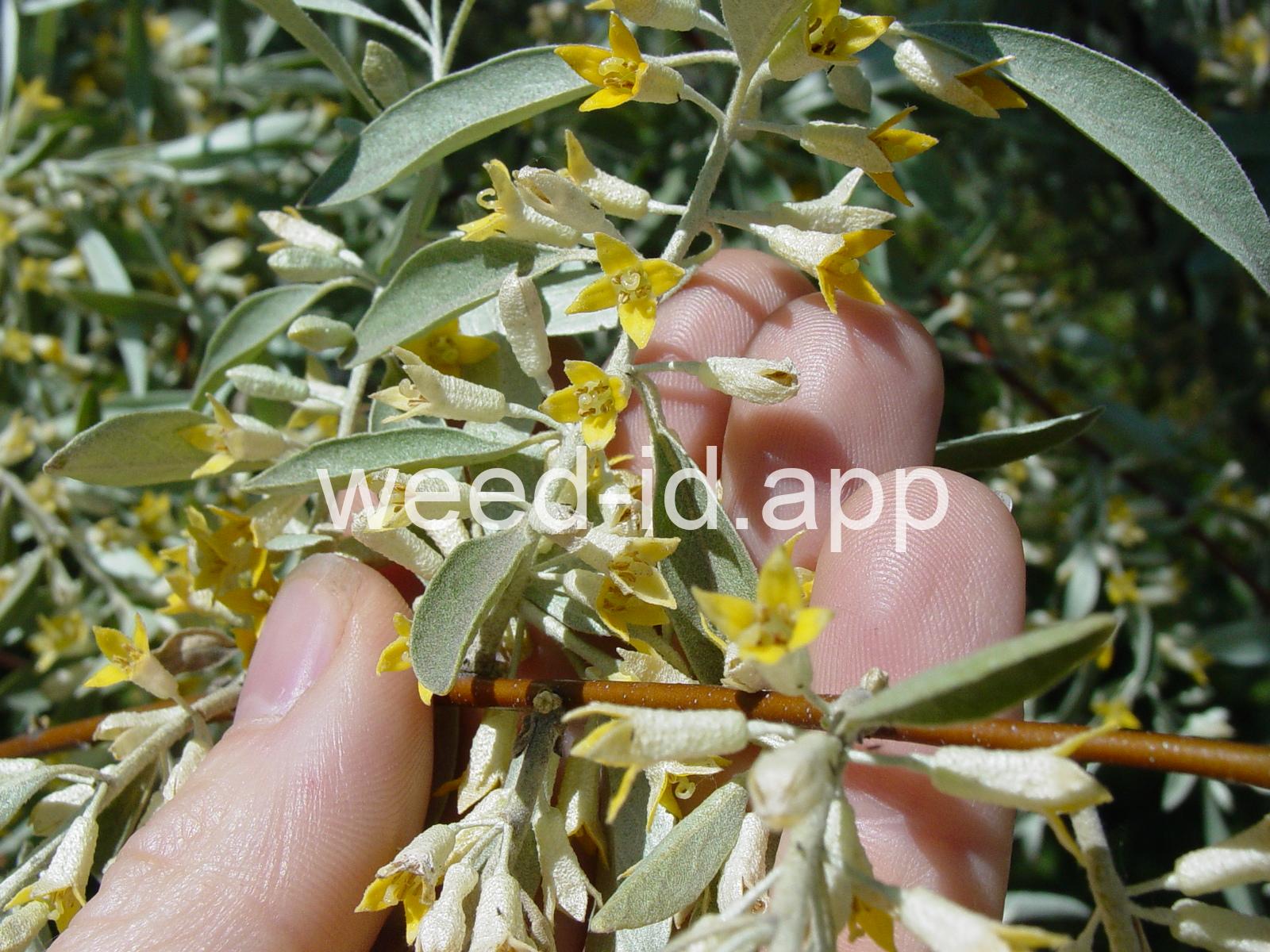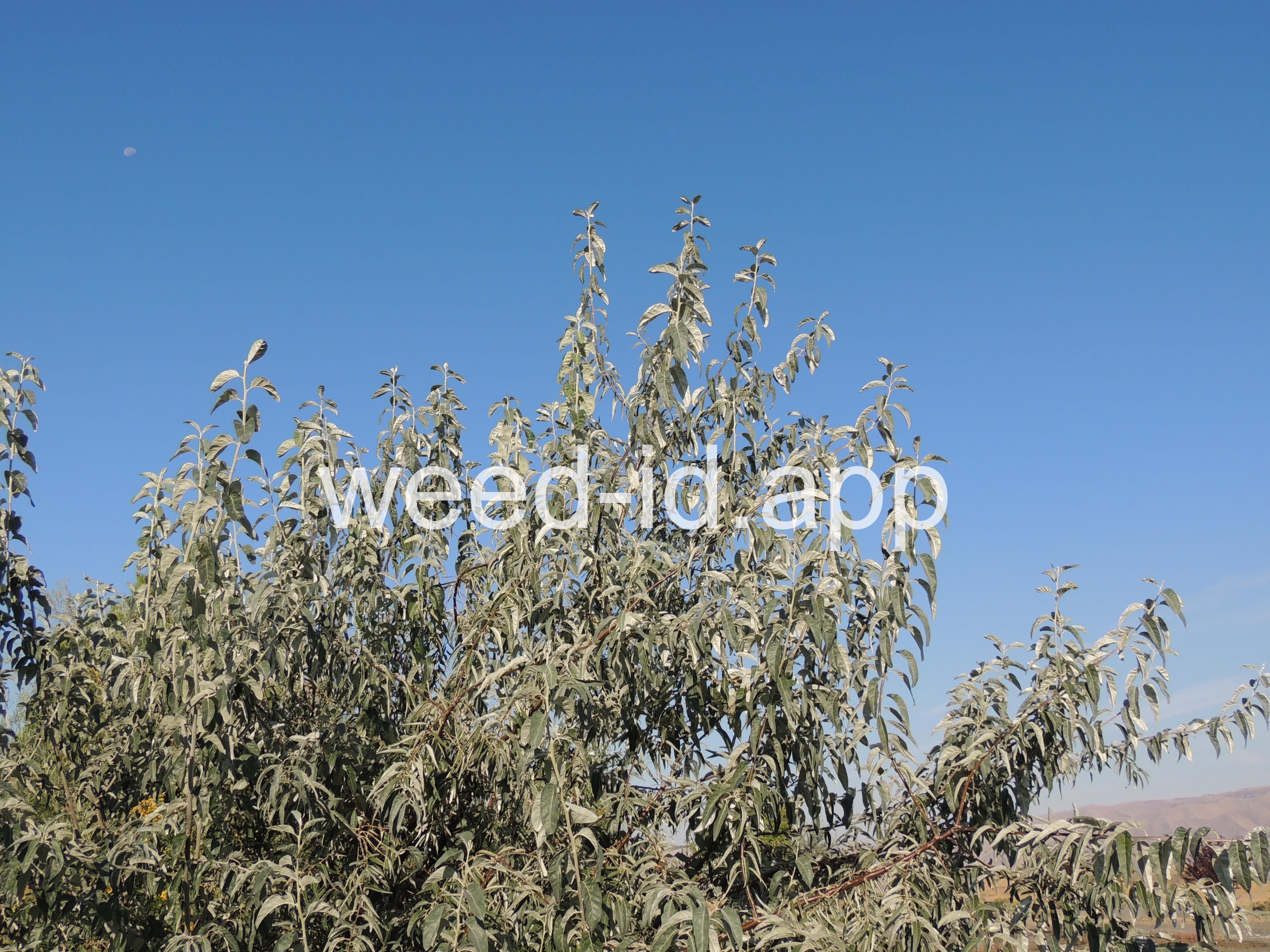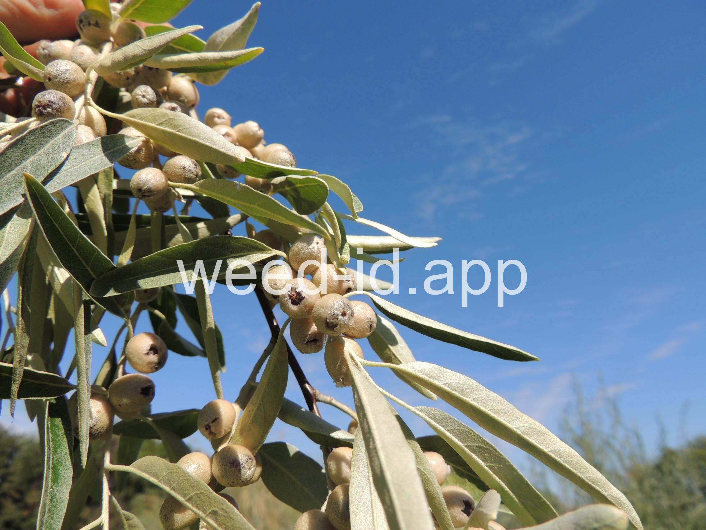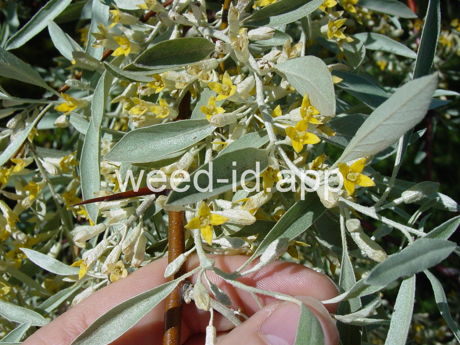 A small tree with wide, spreading branches and silvery leaves. The branchlets are spine tipped, and the leaves are covered with disk-shaped hairs with a central attachment (magnification is needed to see this distinctive feature). The fruit is a small, round, yellow to silvery berry with a single, large stone and granular pulp. This species prefers sub-irrigated sites, often in alkaline or saline soils. Despite its weedy nature, it has been extensively planted.