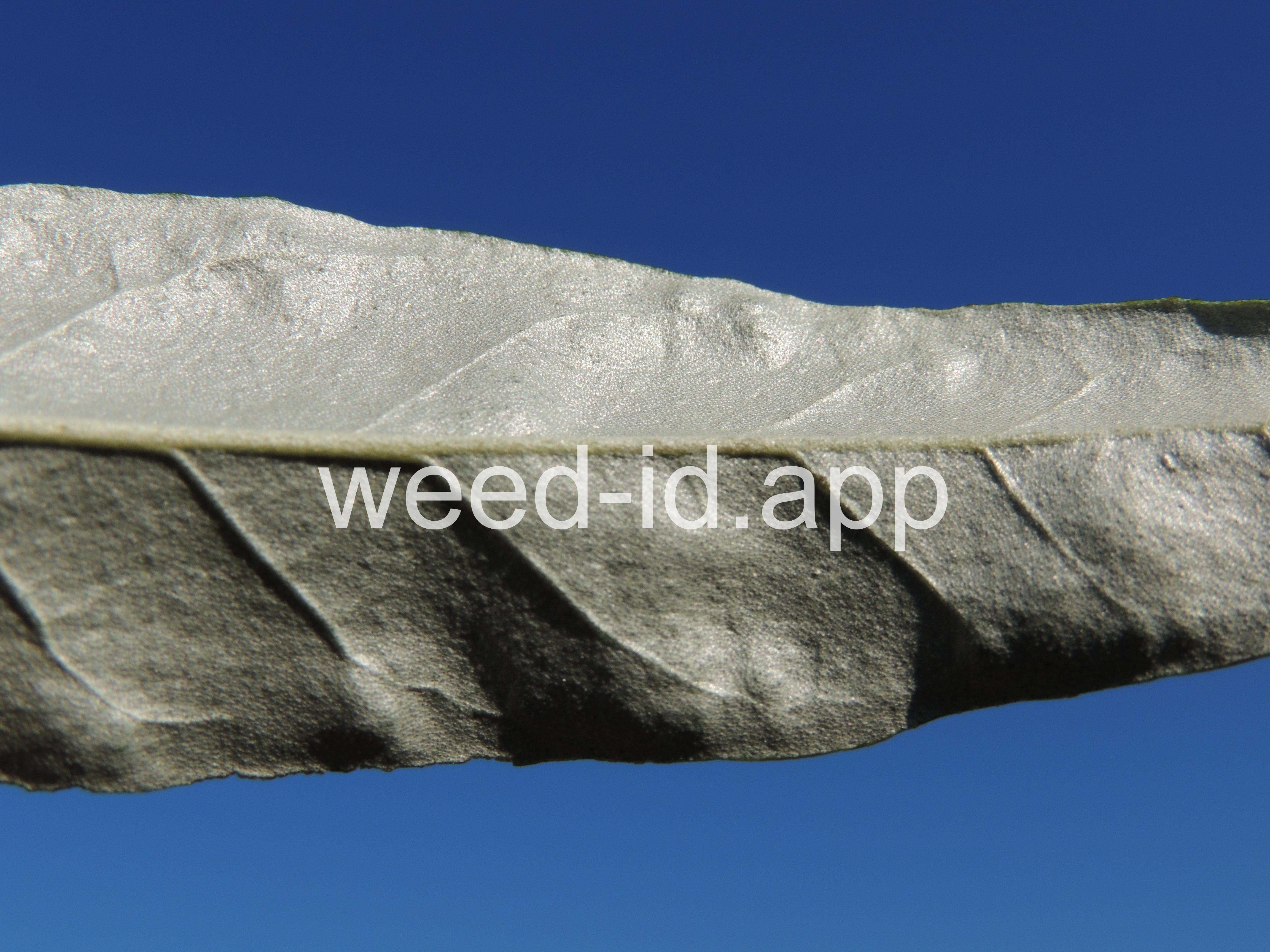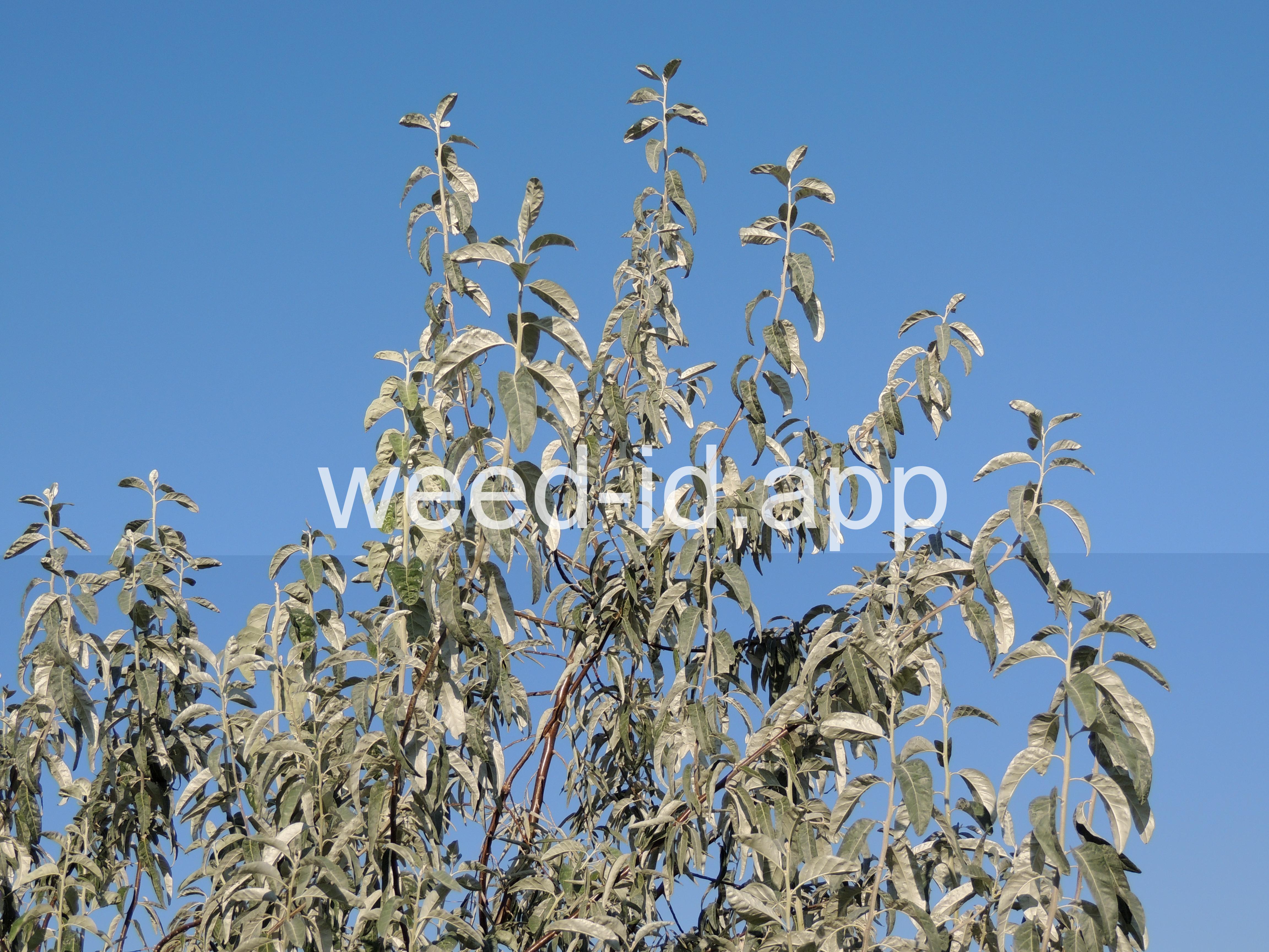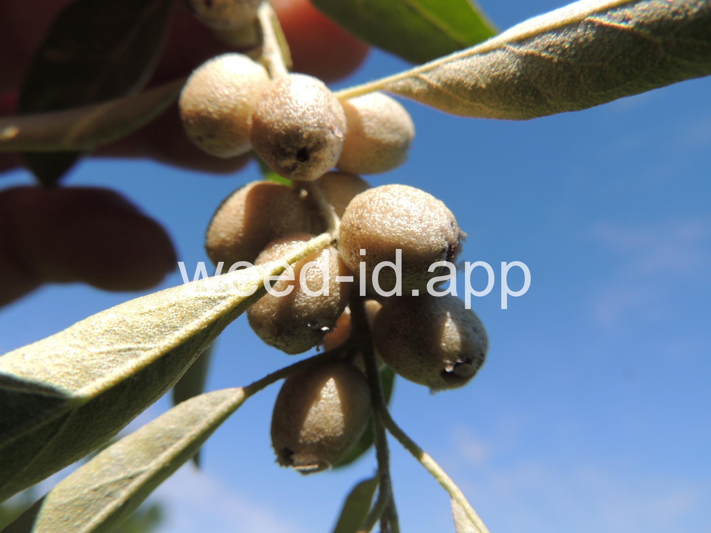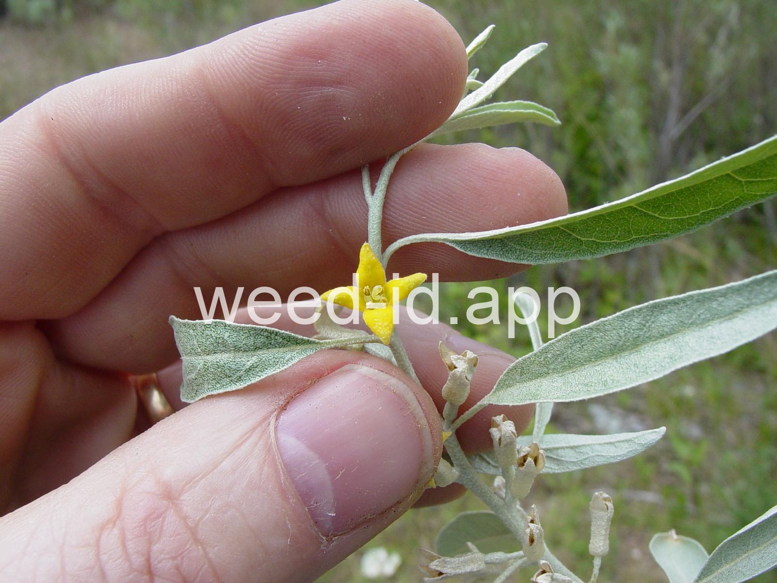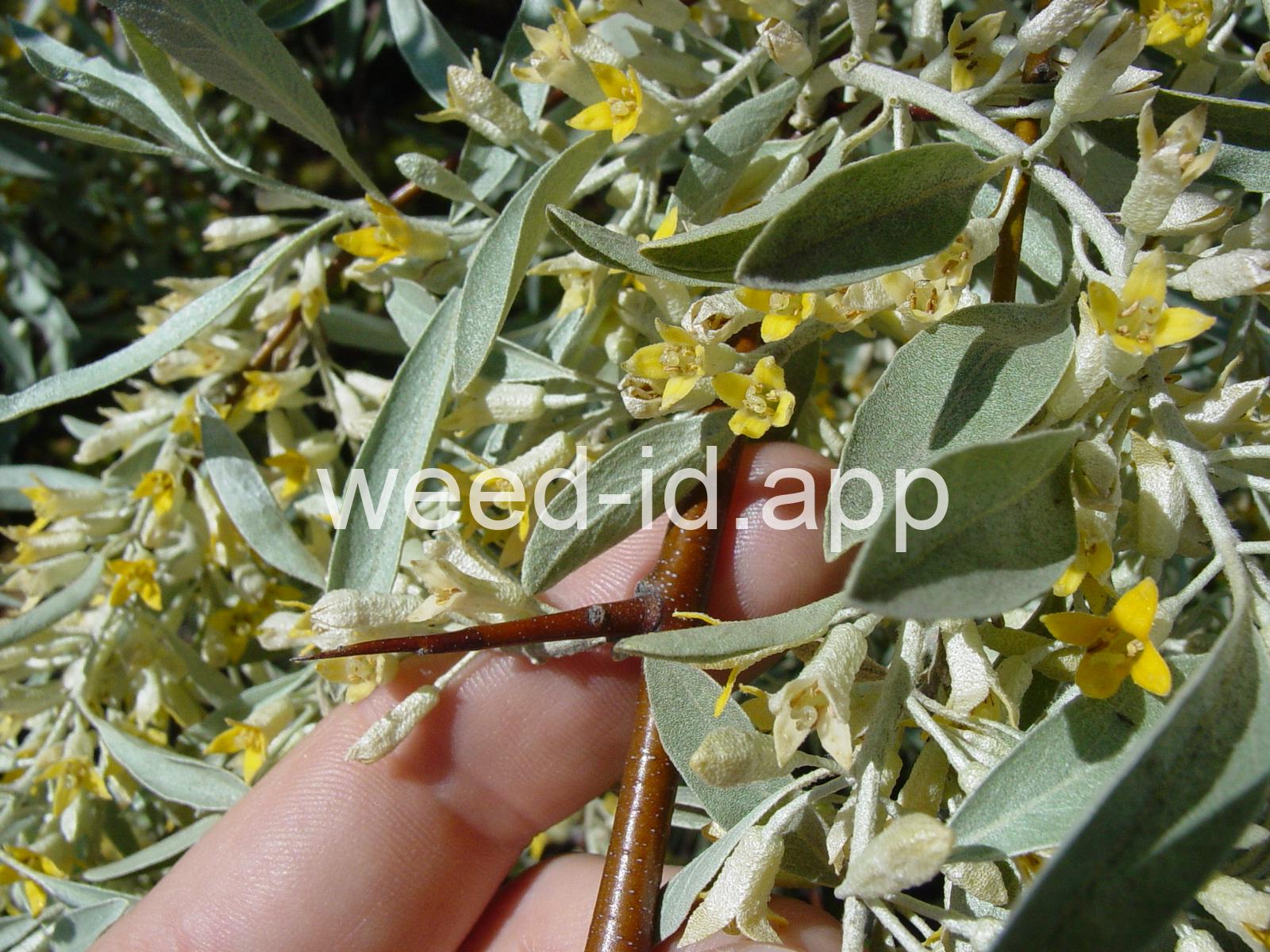 A small tree with wide, spreading branches and silvery leaves. The branchlets are spine tipped, and the leaves are covered with disk-shaped hairs with a central attachment (magnification is needed to see this distinctive feature). The fruit is a small, round, yellow to silvery berry with a single, large stone and granular pulp. This species prefers sub-irrigated sites, often in alkaline or saline soils. Despite its weedy nature, it has been extensively planted.