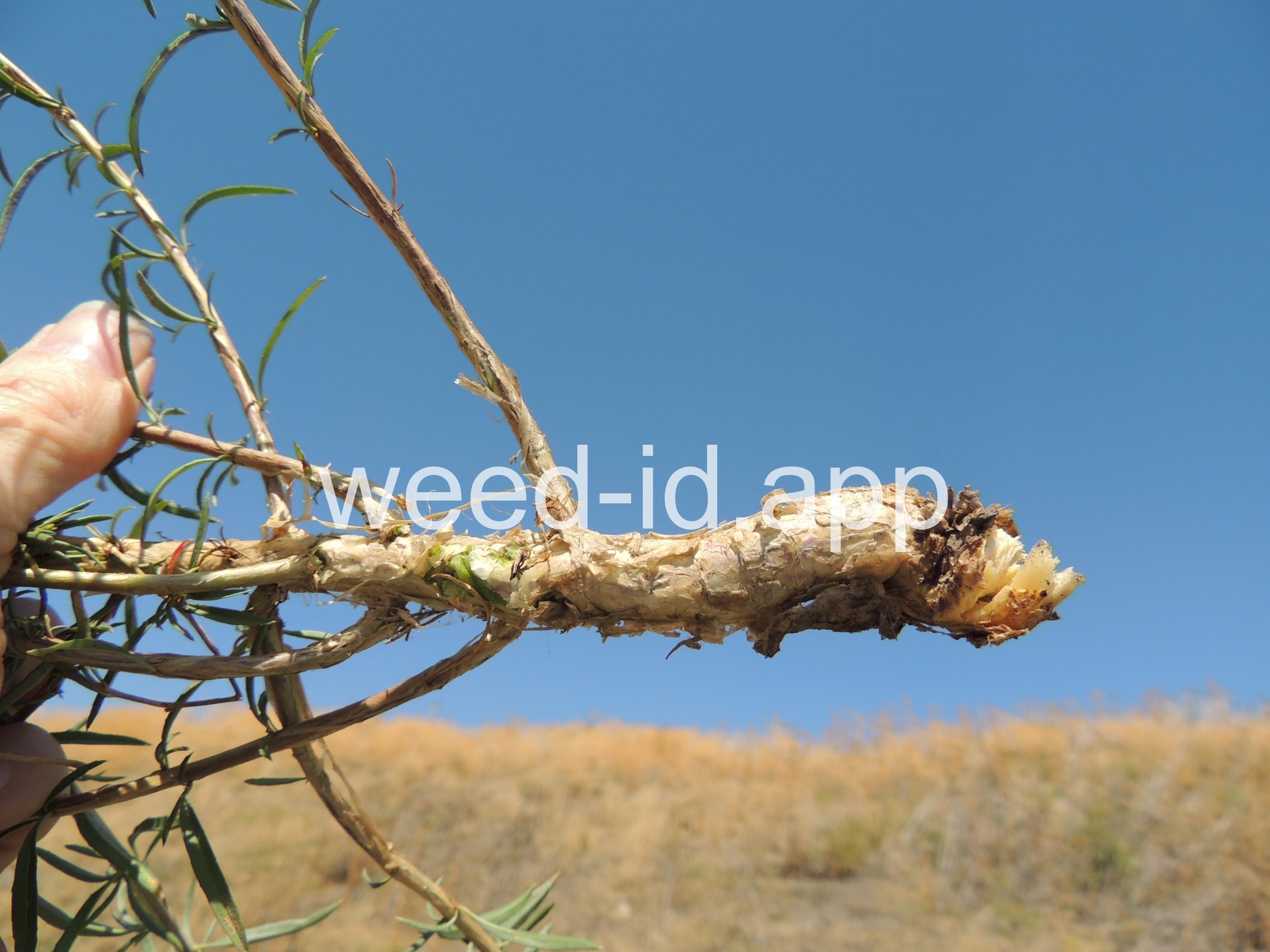 In the seedling stage, note the deep red-purple color on the backs of the leaves and cotyledons. The leaf margins have very small, widely spaced teeth. Although the plant is an annual, the lower stem often appears woody and the epidermis bark-like, dry and peeling. This is typical of many members of this family. A highly variable species with several varieties. Common on road shoulders. Flowering in late summer and fall.
