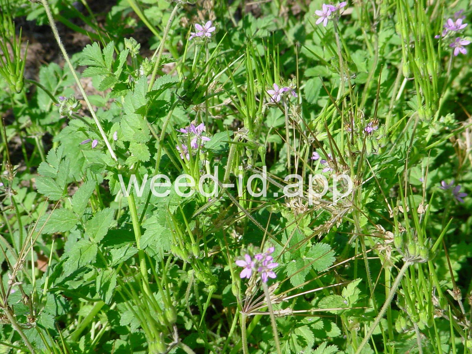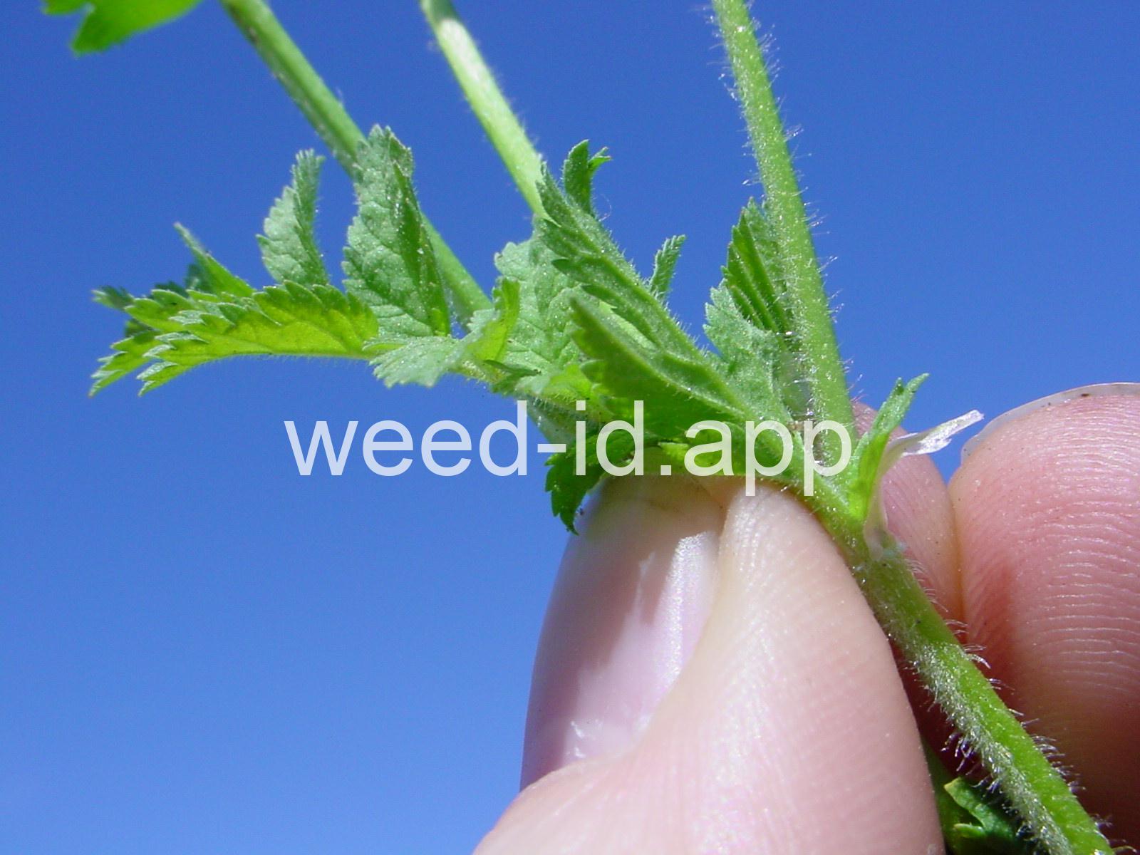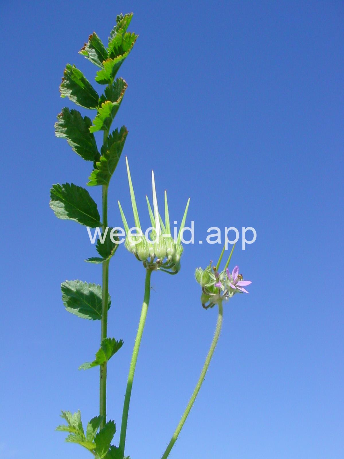 The leaves divided into entire leaflets with a toothed or shallowly lobed margin. This characteristic distinguishes the species from Erodium cicutarium and Erodium botrys.