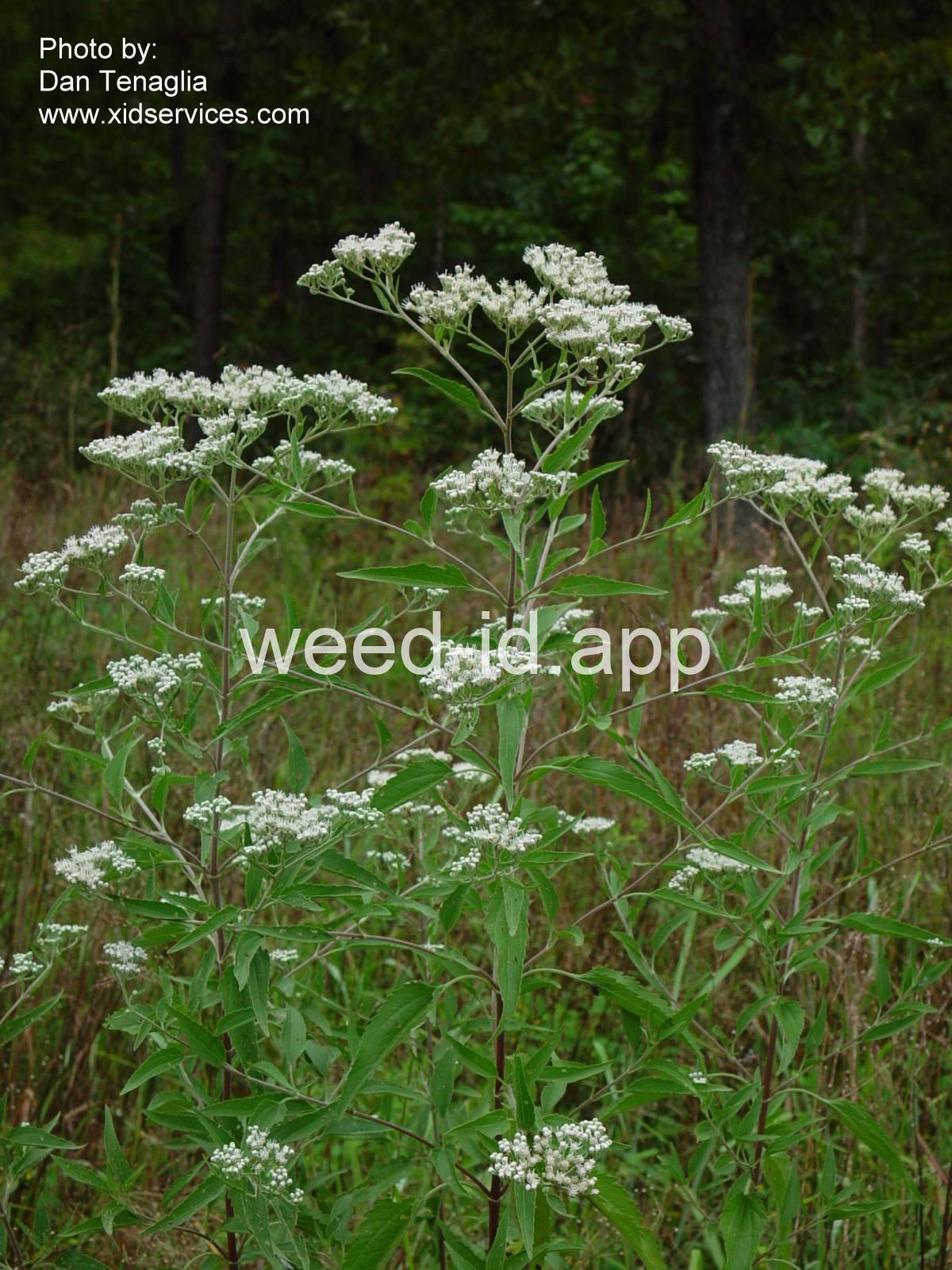 An erect perennial 3-6 feet tall with a terminal corymb of purplish flower heads. There are several somewhat similar species, all of which are called Joe Pye weed and boneset.