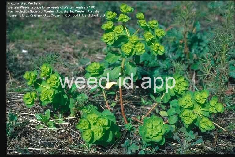 An erect annual with obovate to spatulate leaves which are finely serrate at the tip. Similar to Euphorbia peplus but with 5 rays to the primary umbel.