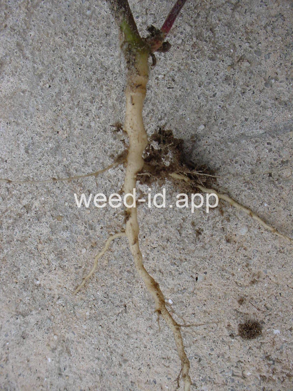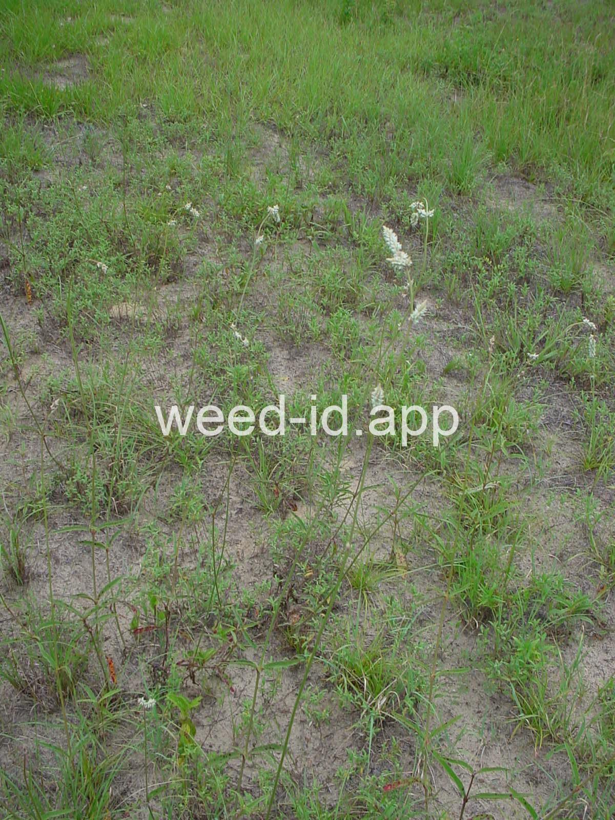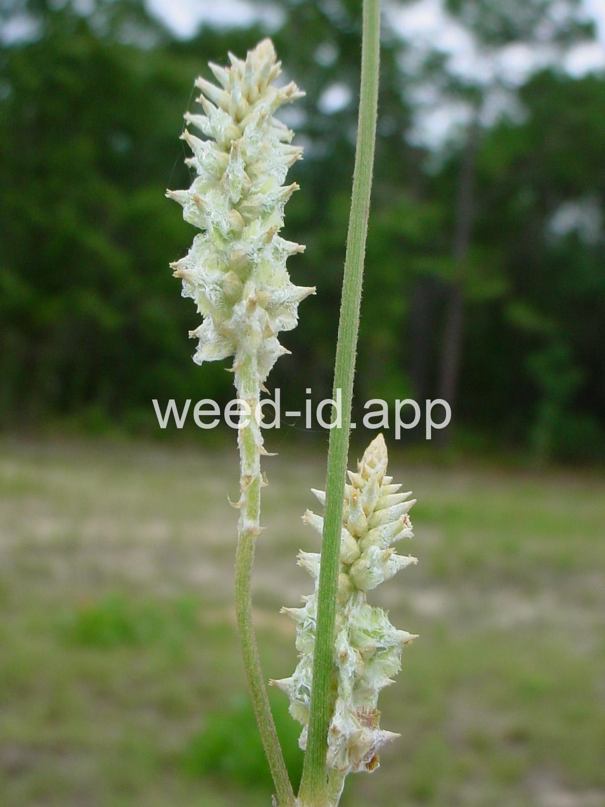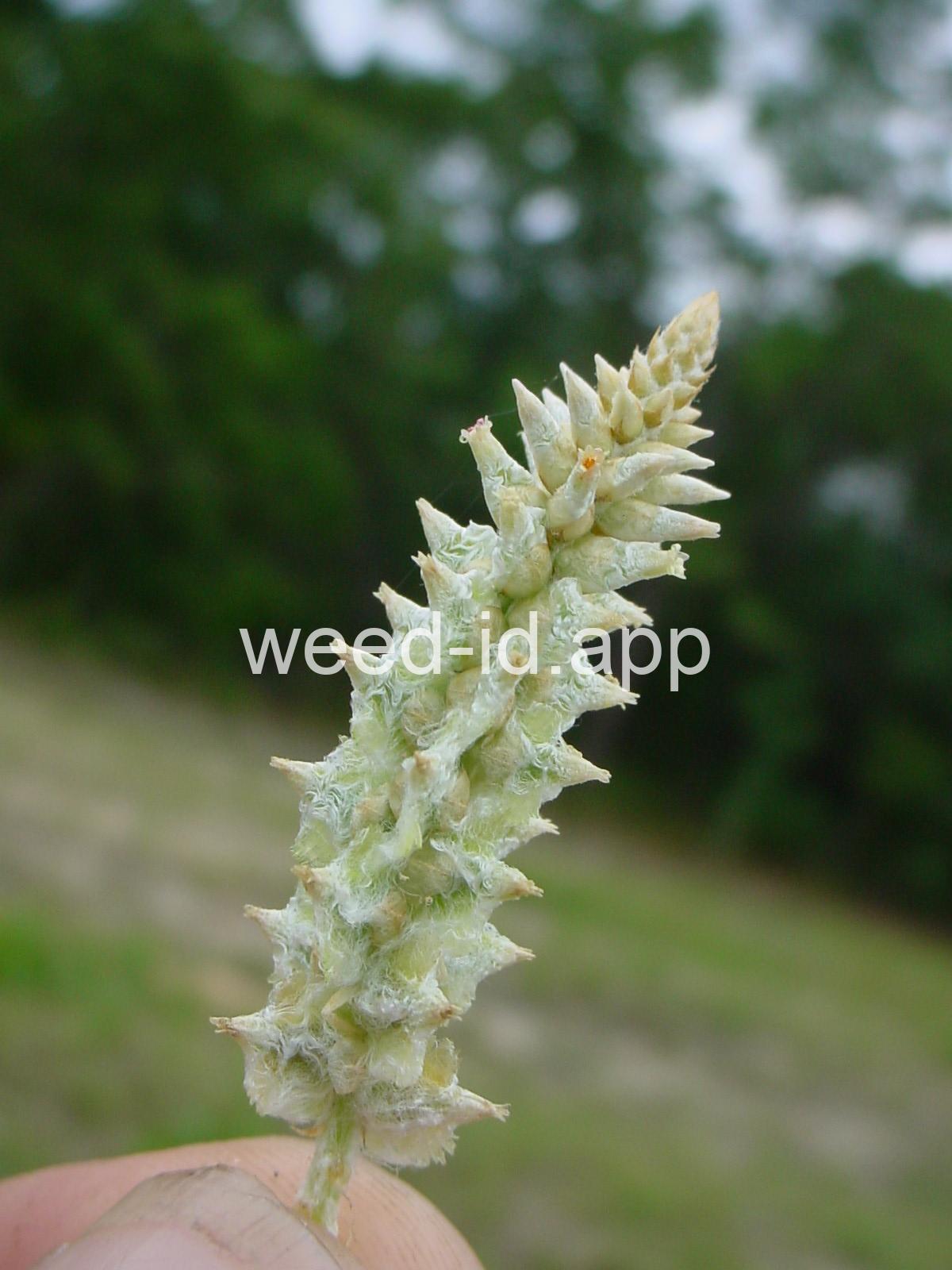 An erect columnar annual with terminal, cone shaped, dense clusters of small flowers without petals. The outer parts of the flowers densely wooly. The leaves are opposite and very hairy. This species is not particularly weedy.