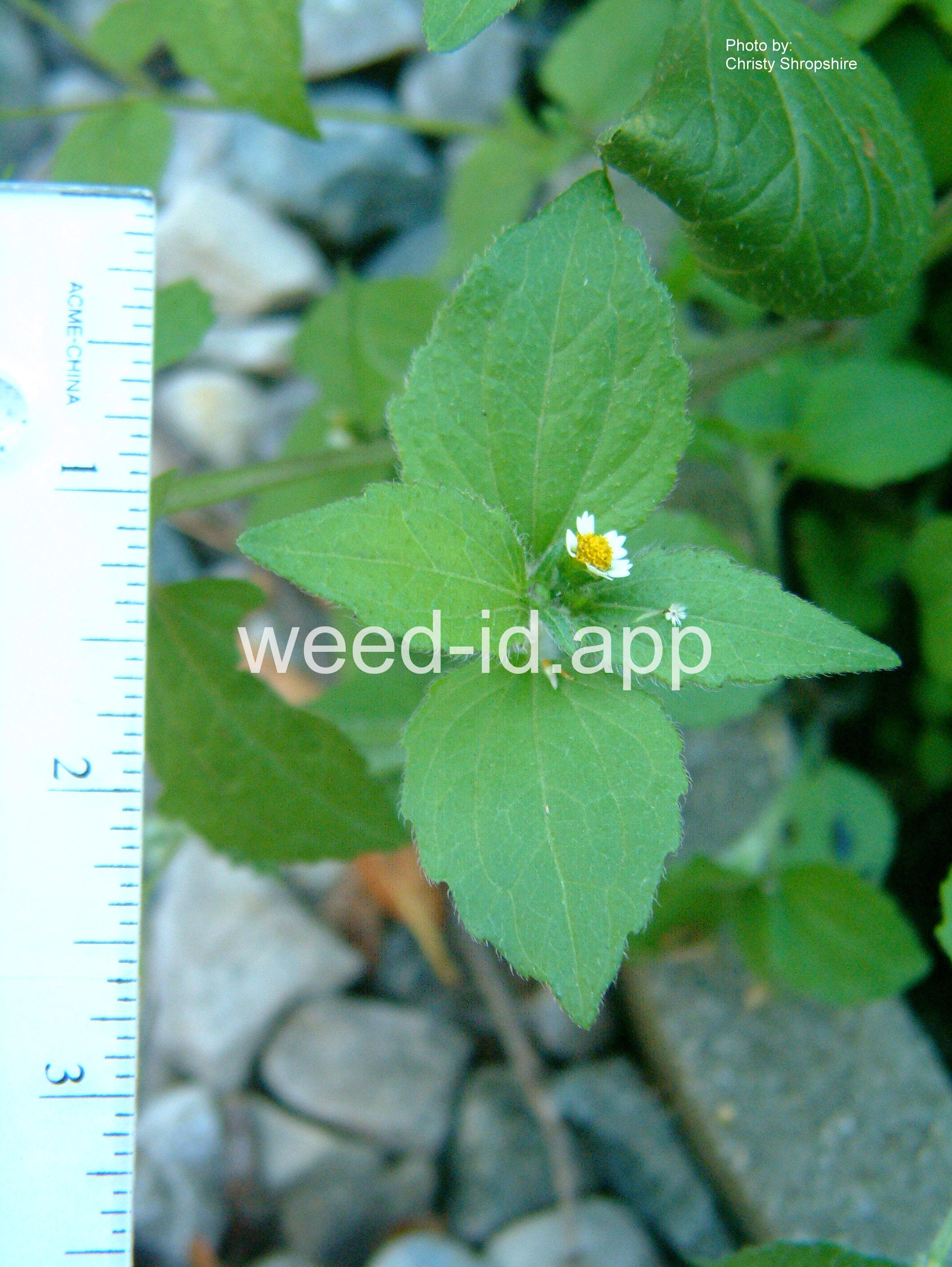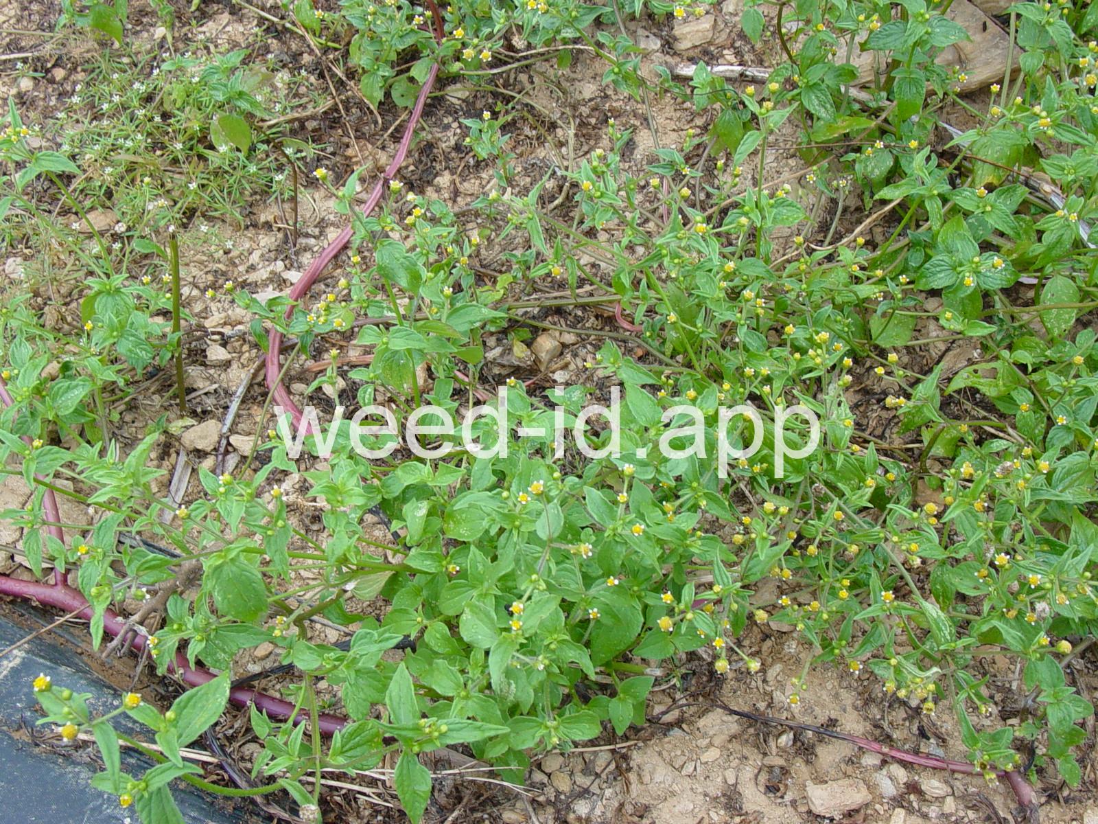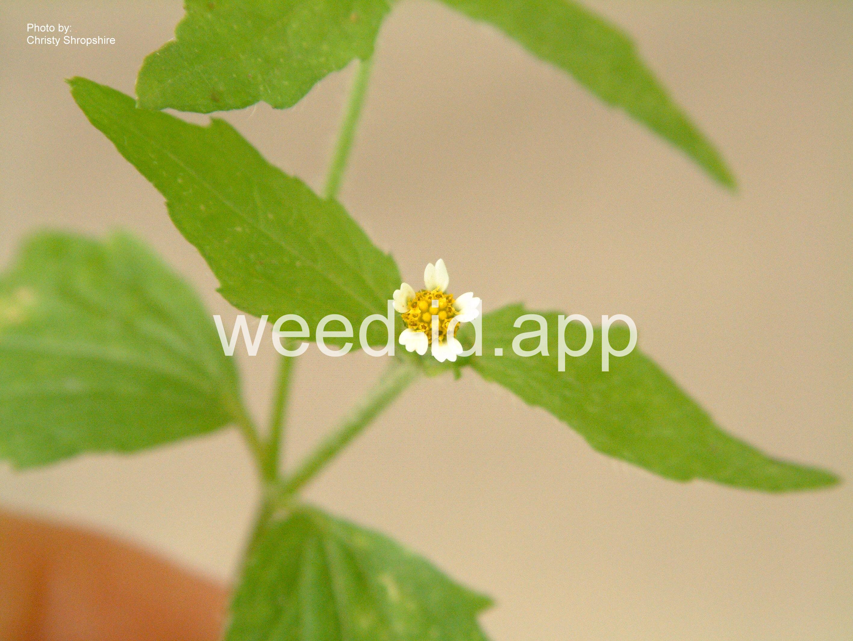 The very small, composite heads will have four or five white ray flowers. The disk flowers are yellow. A very rapidly growing annual with opposite, triangular to egg-shaped lower leaves.