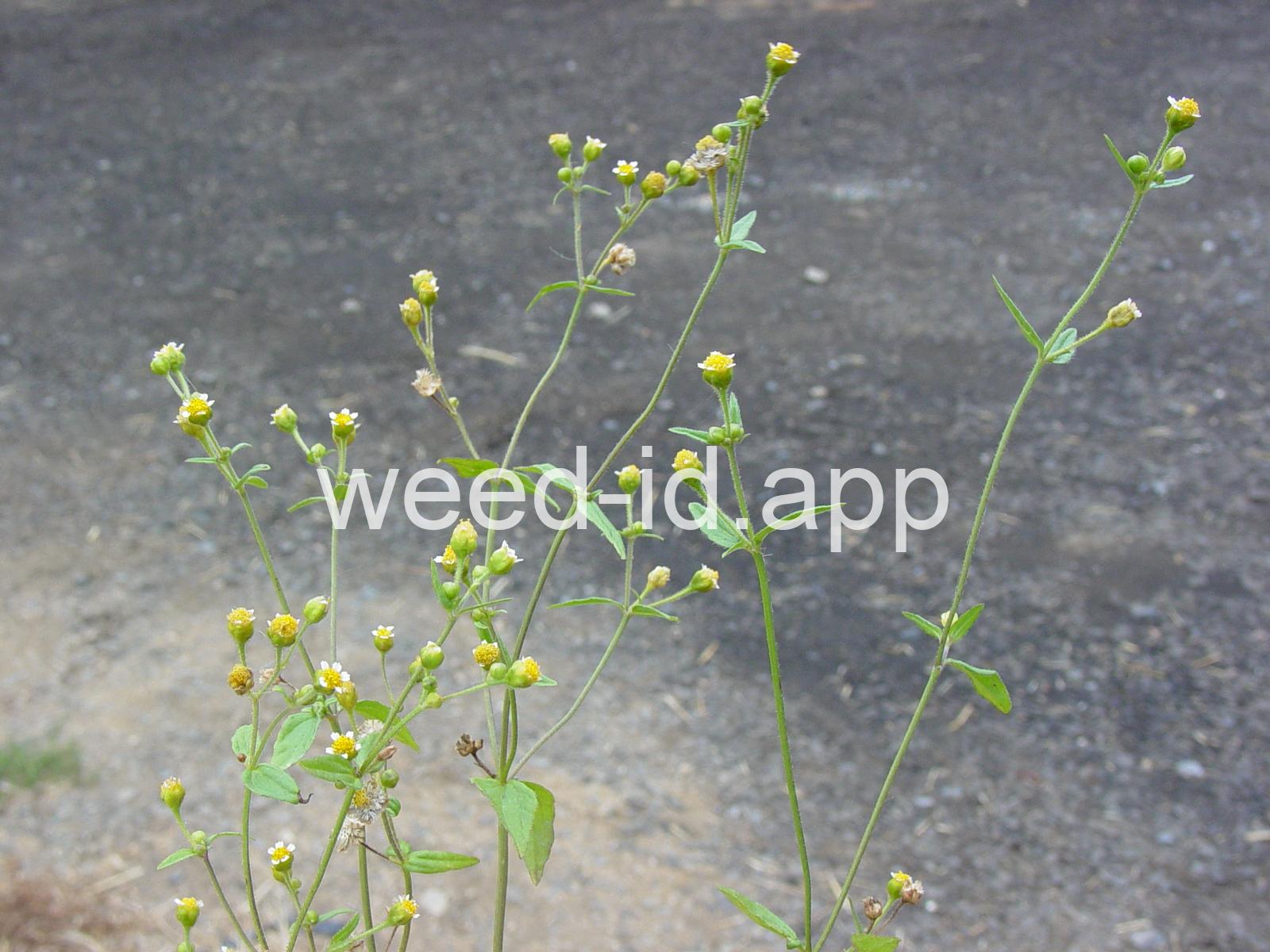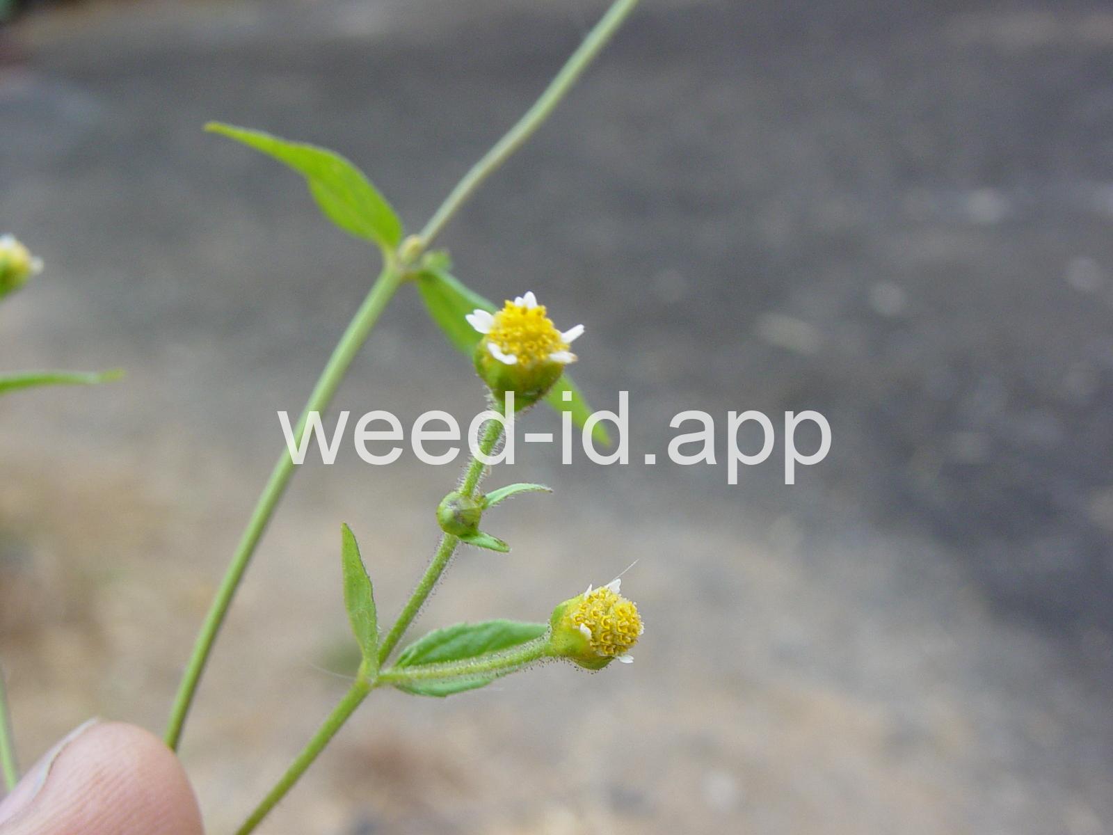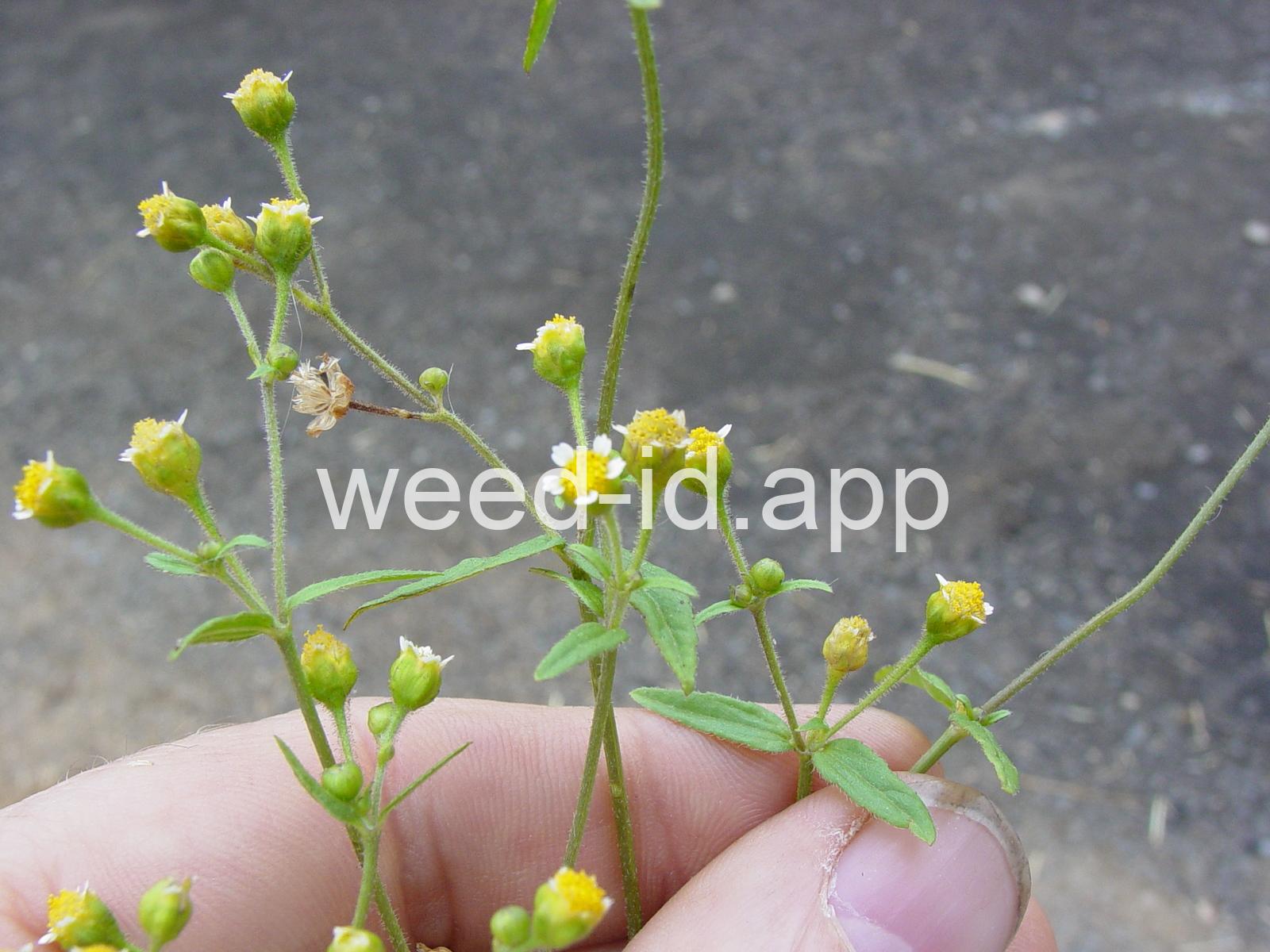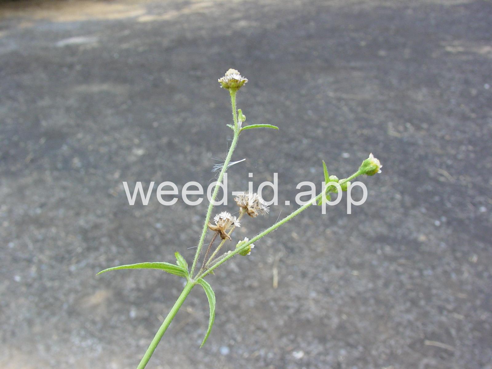 The very small, composite heads will have four or five white ray flowers. The disk flowers are yellow. A very rapidly growing annual with opposite, triangular to egg-shaped lower leaves.