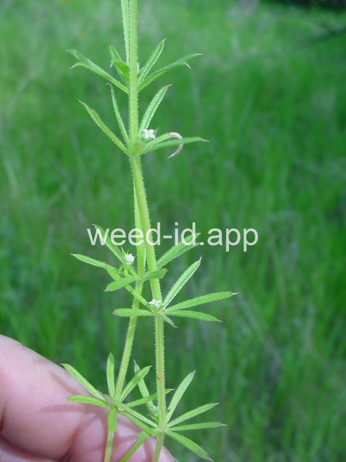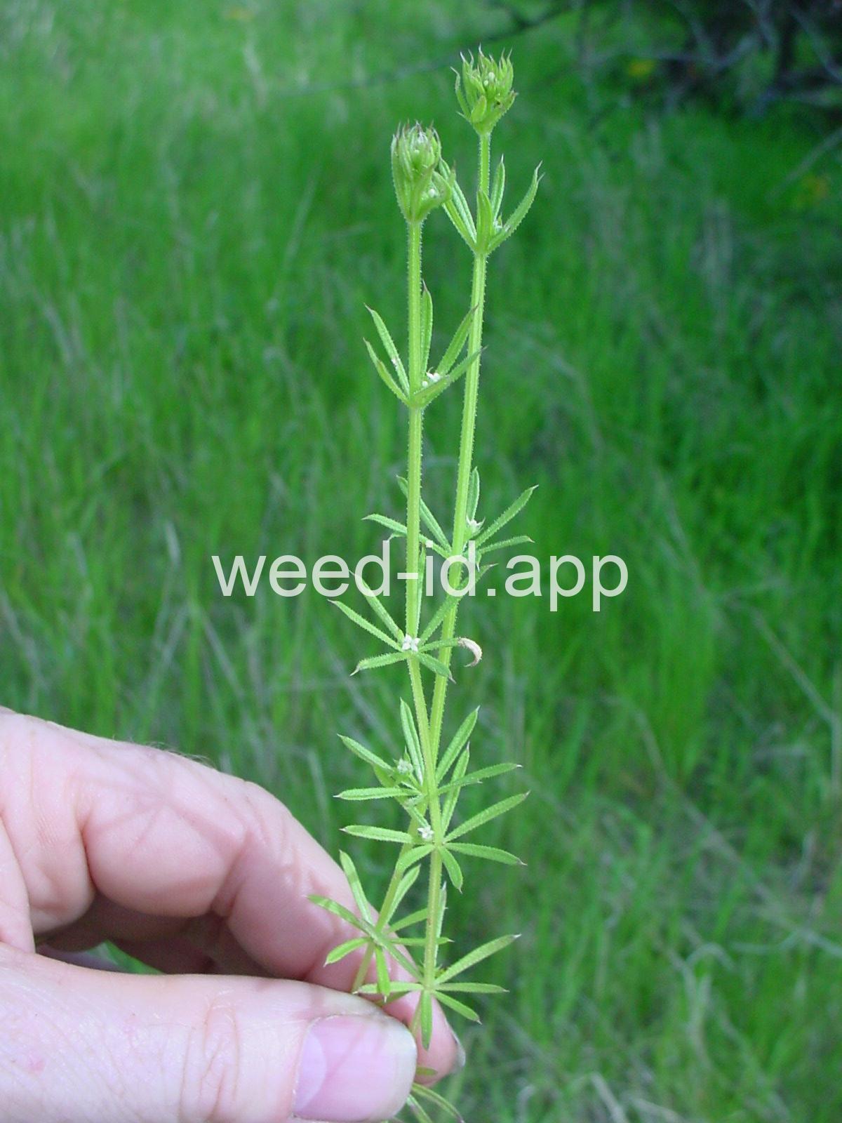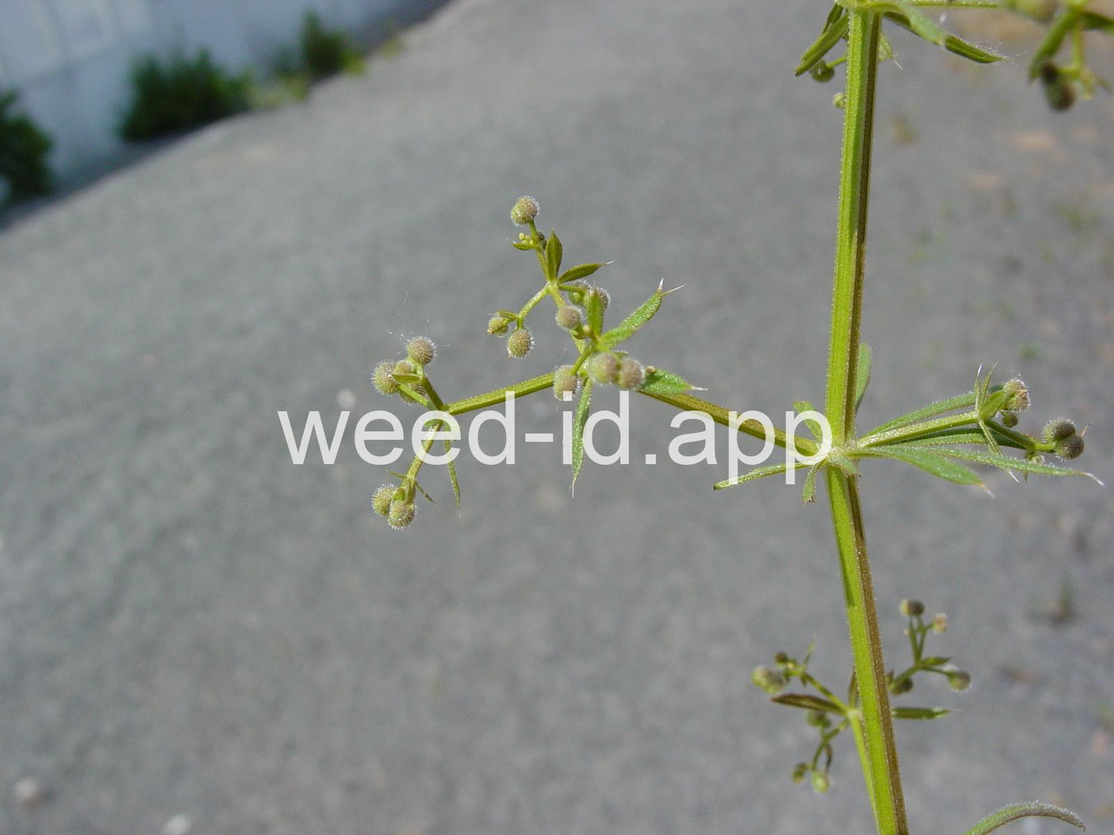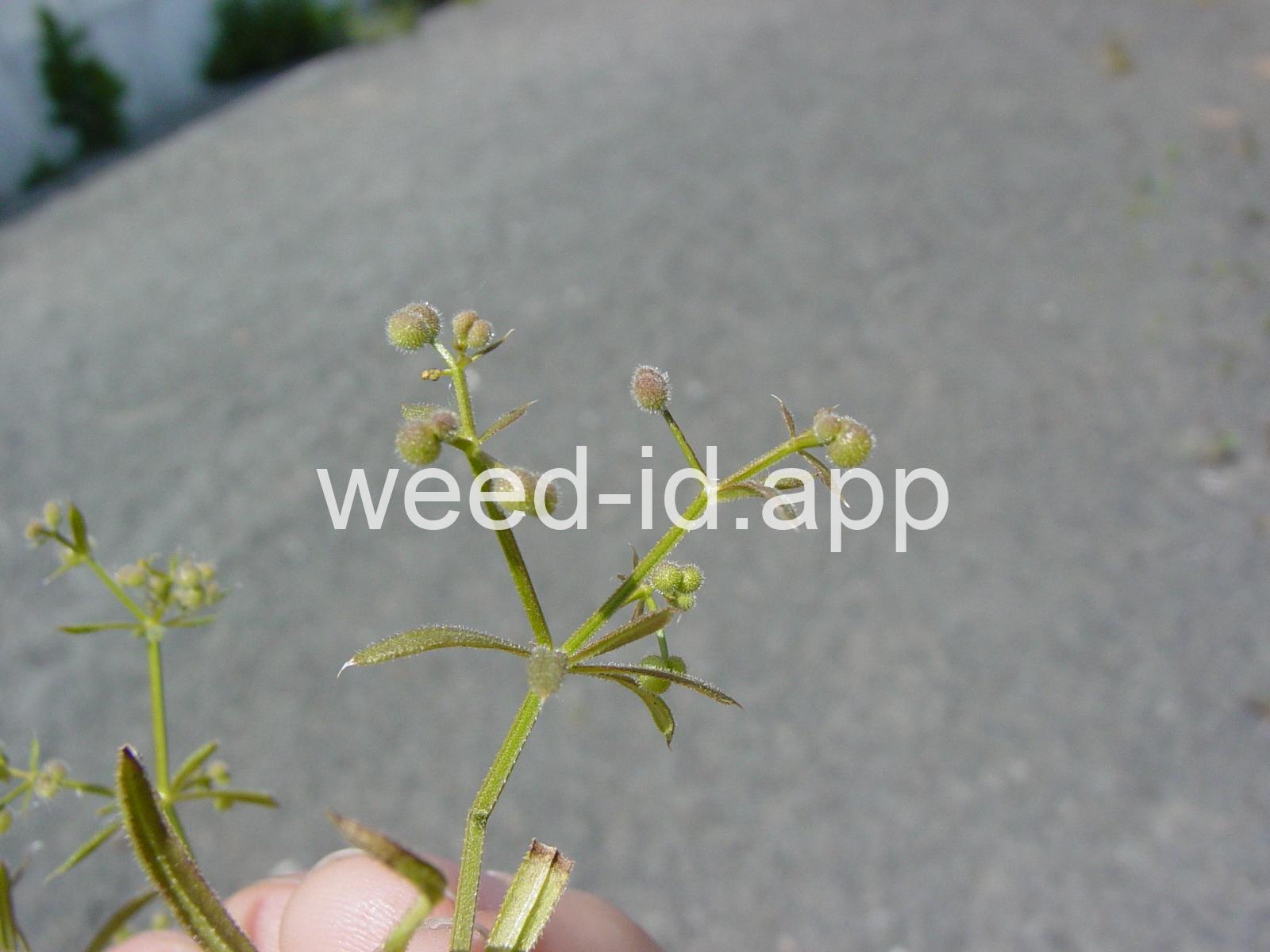 A viny, annual weed with down-turned barbs on the stem and 5-8 narrow, barbed leaves per whorl. Each leaf has a small spine at the leaf tip, and the plant stem is often square. The fruit is a pair of round burs, sometimes referred to as `monkey balls.`