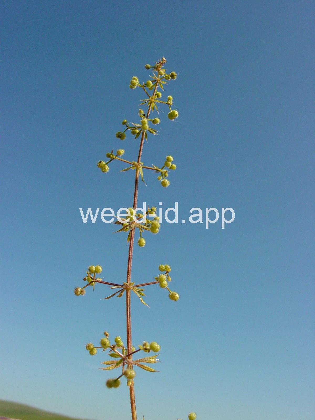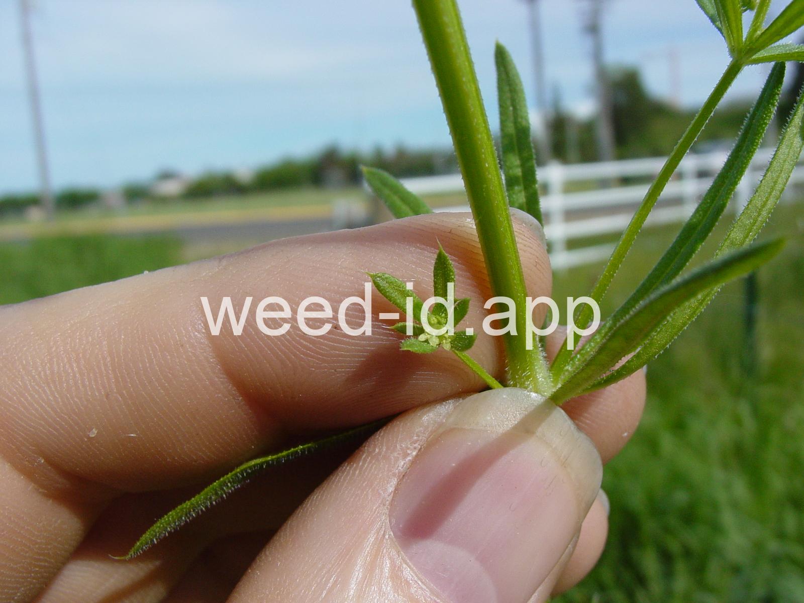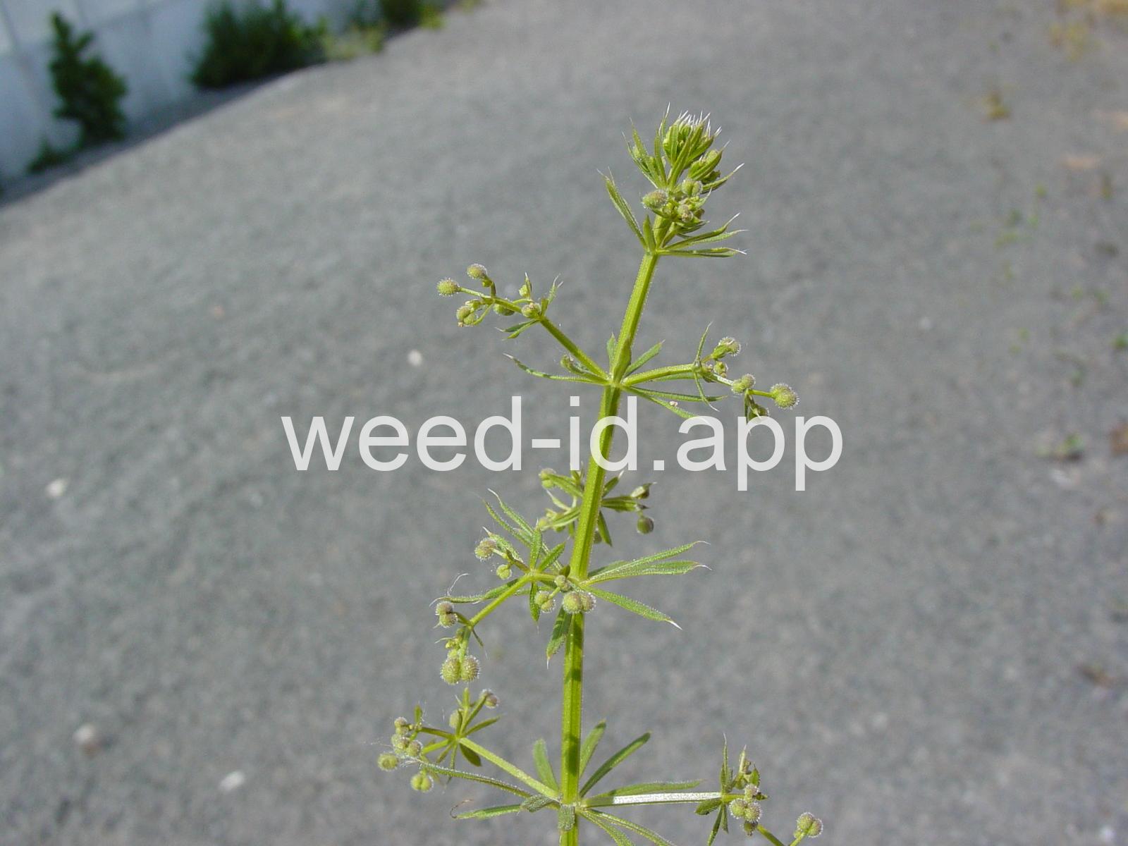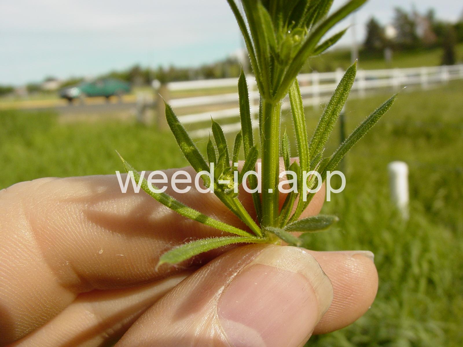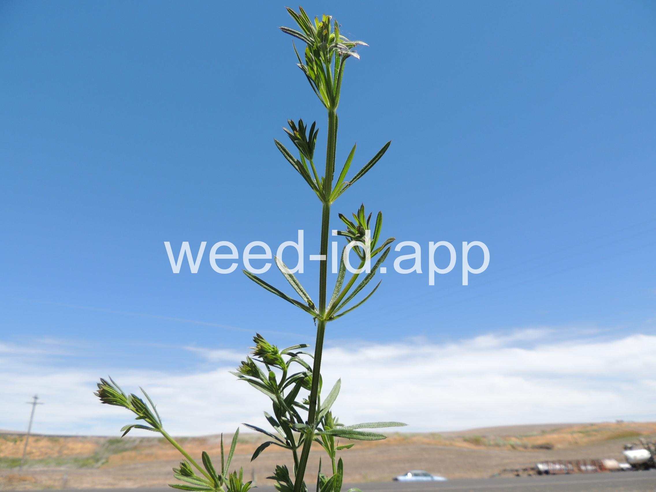 A viny, annual weed with down-turned barbs on the stem and 5-8 narrow, barbed leaves per whorl. Each leaf has a small spine at the leaf tip, and the plant stem is often square. The fruit is a pair of round burs, sometimes referred to as `monkey balls.`