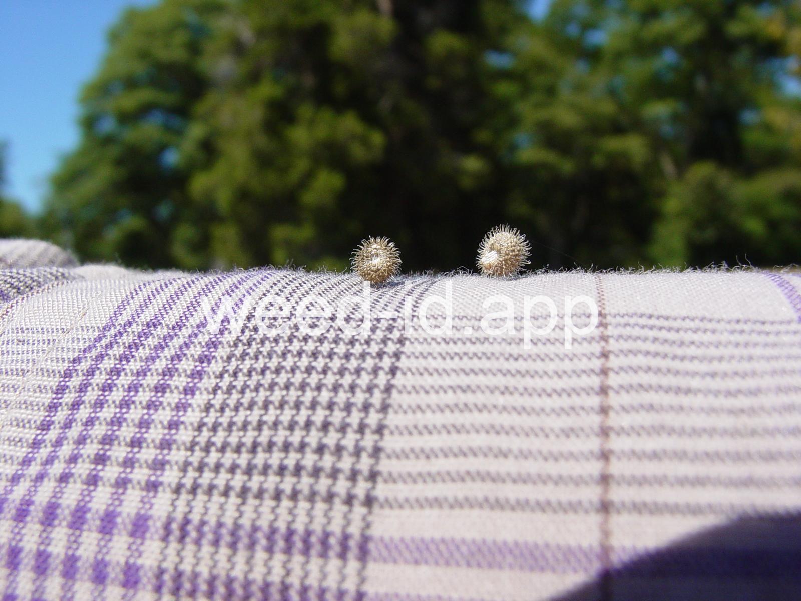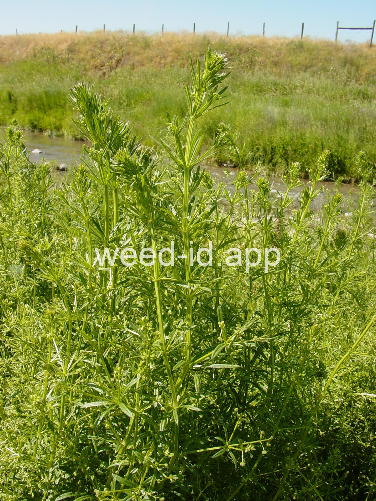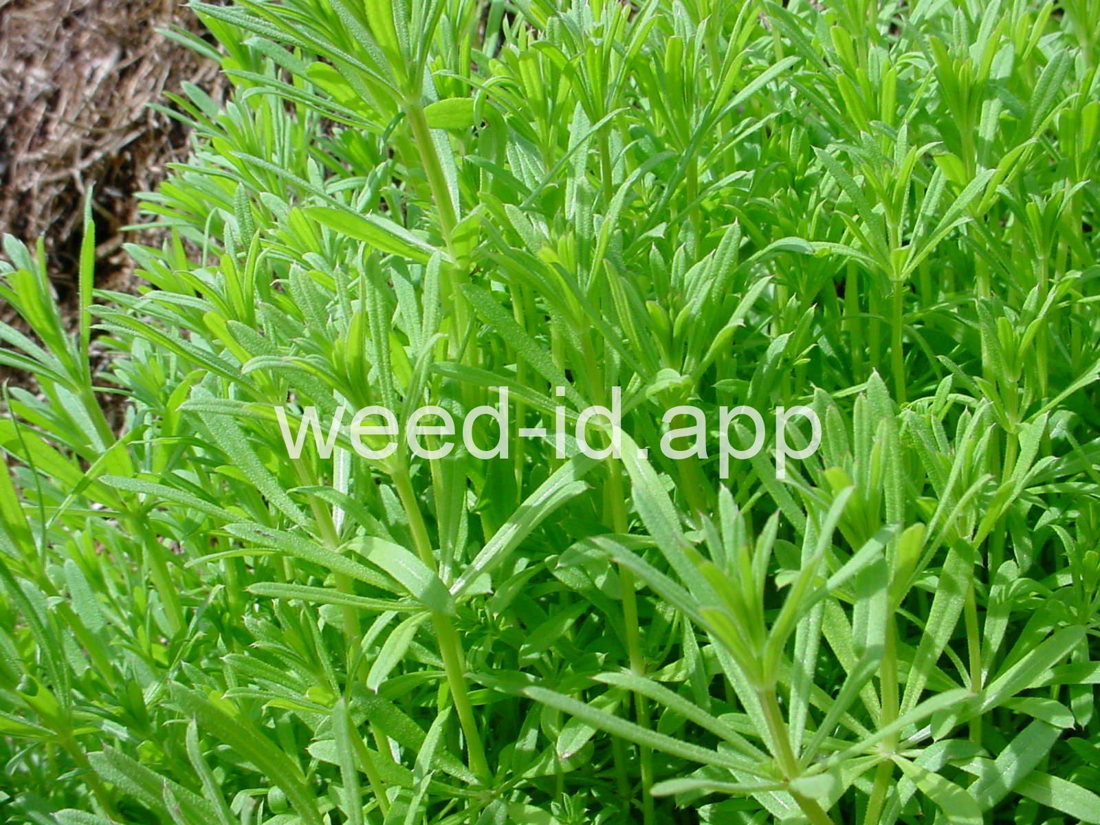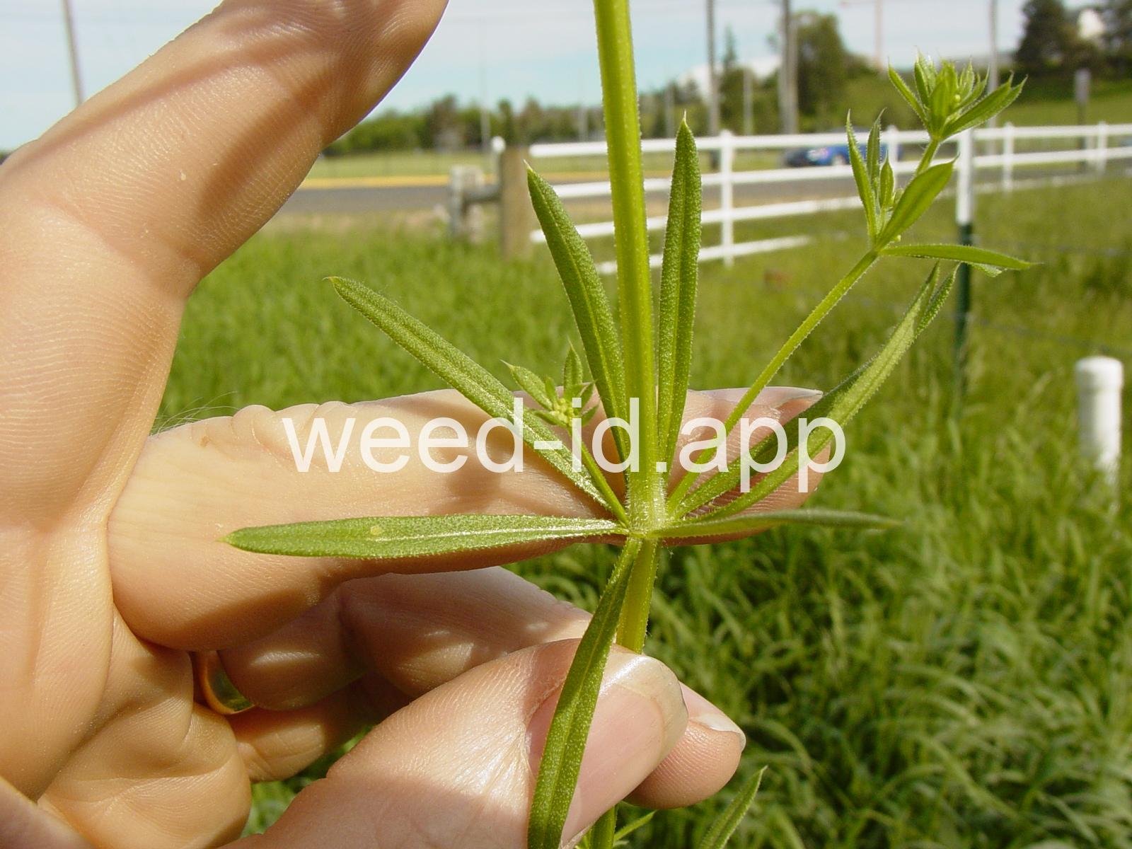 A viny, annual weed with down-turned barbs on the stem and 5-8 narrow, barbed leaves per whorl. Each leaf has a small spine at the leaf tip, and the plant stem is often square. The fruit is a pair of round burs, sometimes referred to as `monkey balls.`